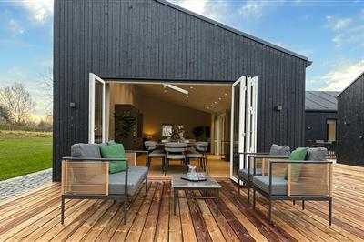 Oplev en stilfuld ferie i dette moderne feriehus, der forener rummelighed, design og natur på harmonisk vis. Nyd den behagelige stemning i det åbent indrettede hus. Tag plads i de komfortable sofaer, og nyd udsigten til det grønne. Høje lofter, afdæmpede