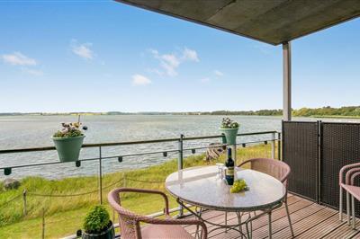 4,8Midt i Hejlsminde ligger dette flotte feriehus med seks ferielejligheder. Denne ferielejlighed ligger på anden etage (med elevator), hvorfra der er en meget smuk udsigt over en stor indsø og åbne landskaber. Fra stuen og den store altan med markise kan I nyde