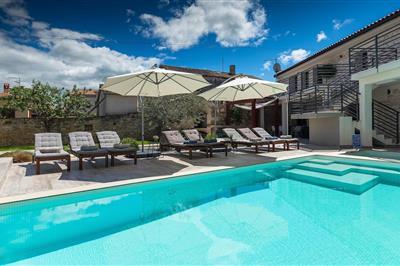 5,0Dette smukke og rummelige feriehus med swimmingpool byder dig velkommen i Rovinjsko Selo. Glæd dig til et afslappende ophold i dette moderne og komfortable etablissement. På to etager kan du nyde det komplette udstyr, slappe af og bruge de smagfulde møbler.