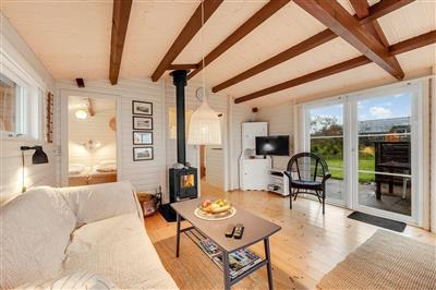 5,0Huset indretning: Moderne og lyst bjælkesommerhus indrettet til 10 personer, og udstyret med sauna og spabad. Der er kombineret køkken og stue. Køkkenet er moderne indrettet med keramiskkomfur, opvaskemaskine, køleskab med frostboks og mikrobølgeovn. I