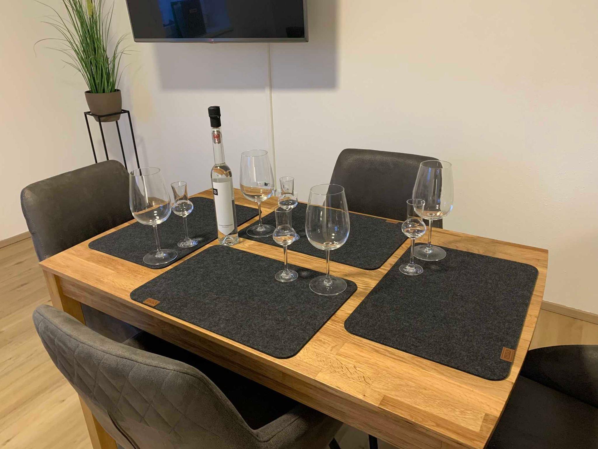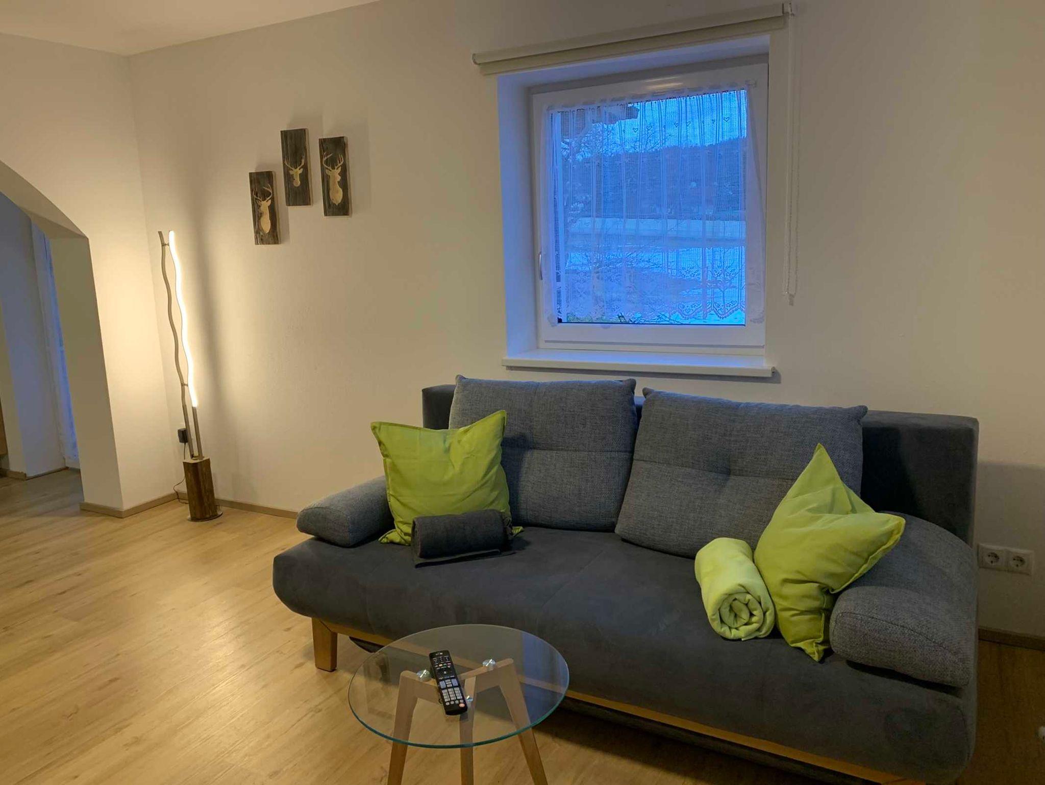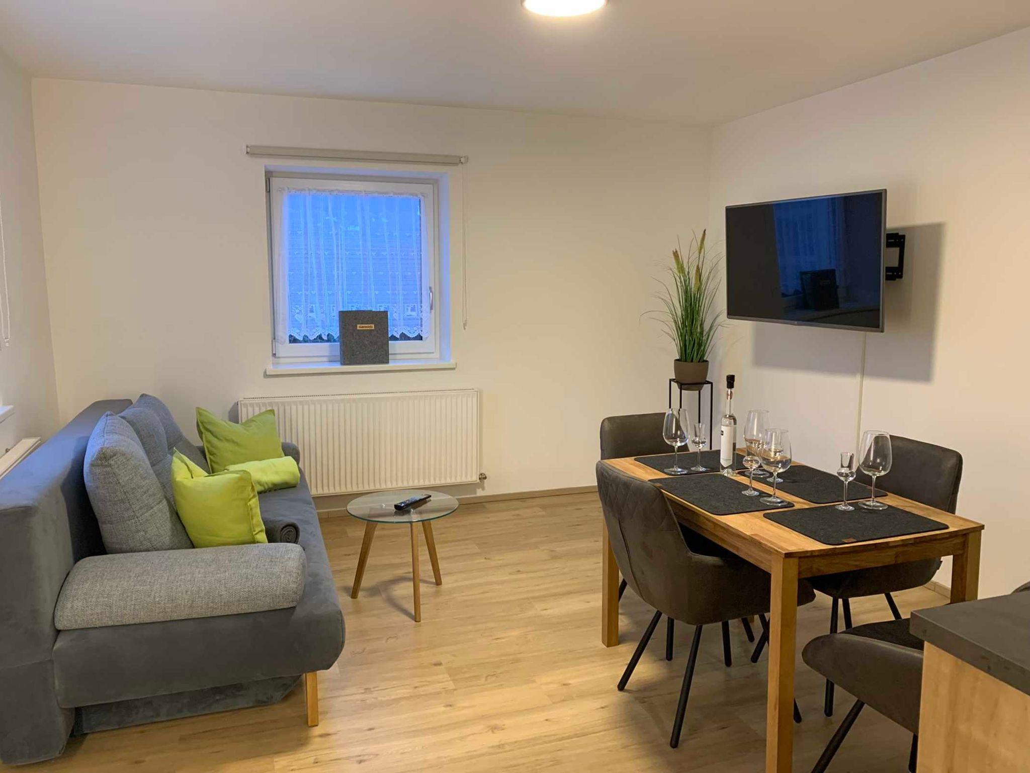 Wohnküche mit bequemer Couch, Esstisch, Garderobe, Flat-TV