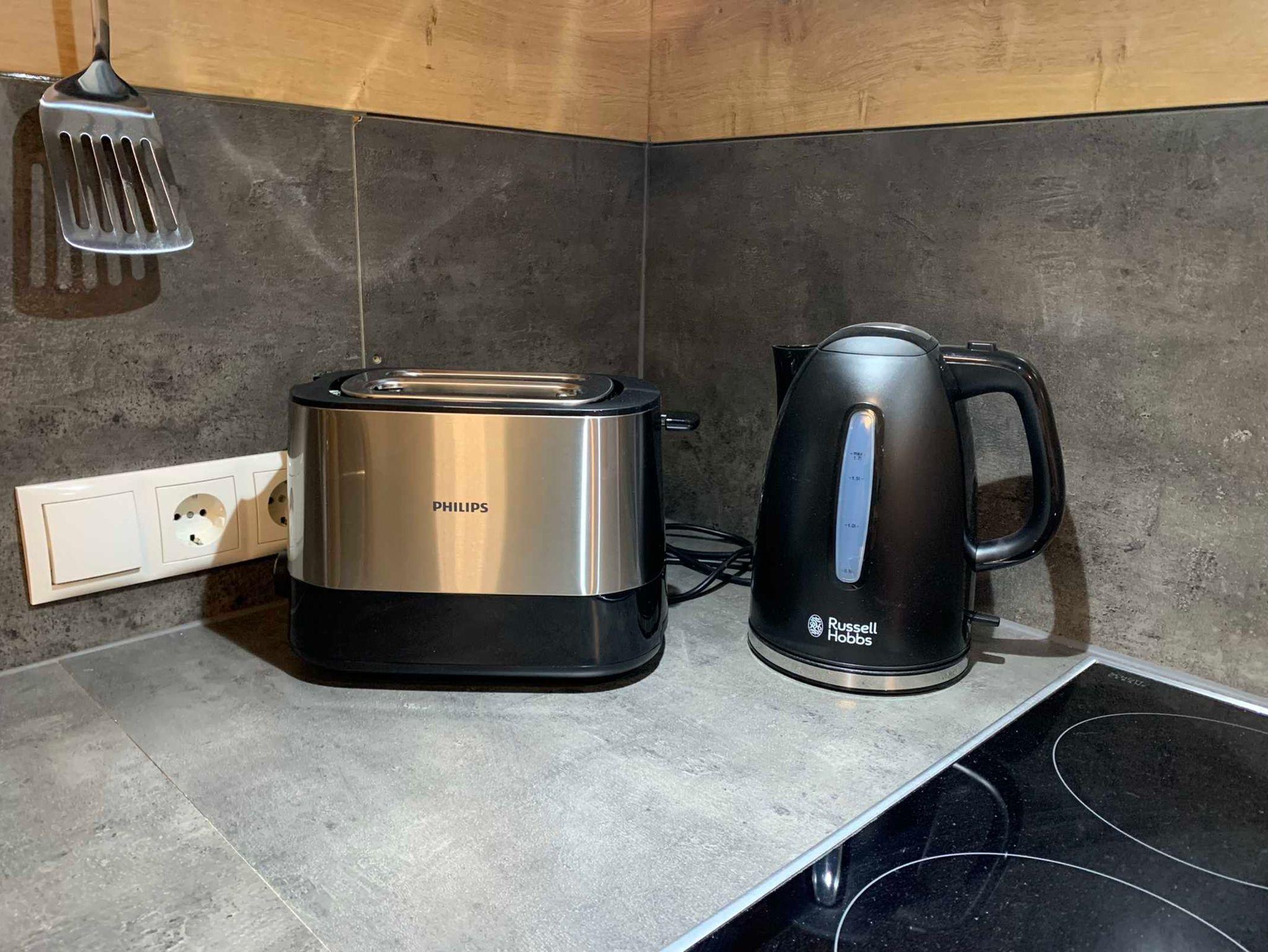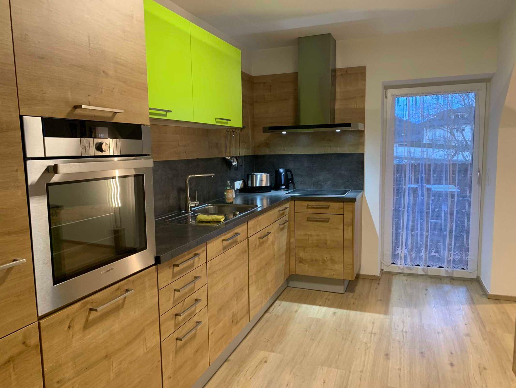 Küchenzeile ausgestattet mit Ceranfeldherd, Backrohr, Kühlschrank, Gefrierfachschrank, Geschirrspüler, Toaster, Wasserkocher, Geschirr, Besteck, Gläser, Töpfe, Geschirrtücher, Nespresso-Kaffeemaschine