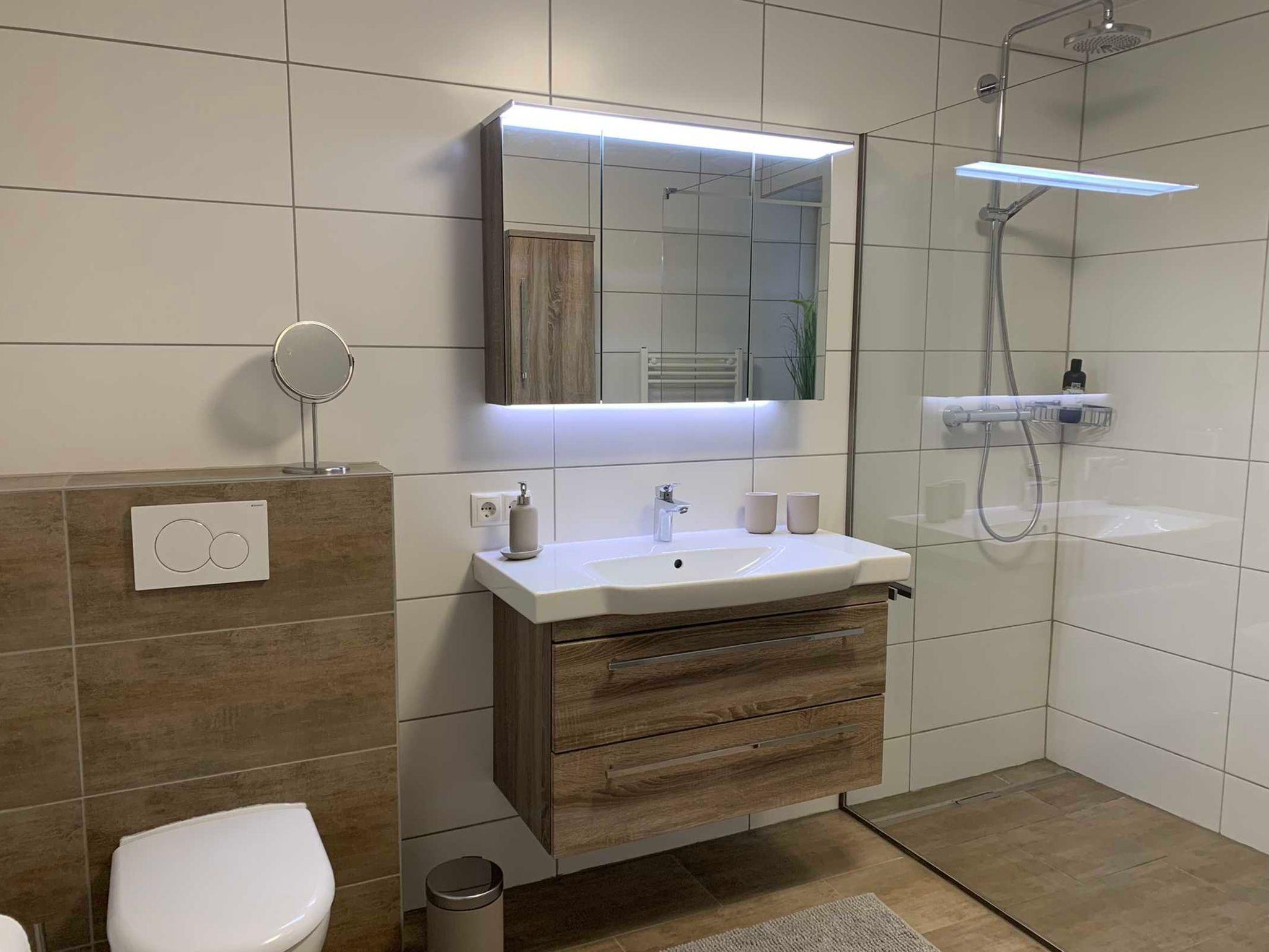 geräumiges Badezimmer mit großzügiger Walk-in Dusche, Haarföhn