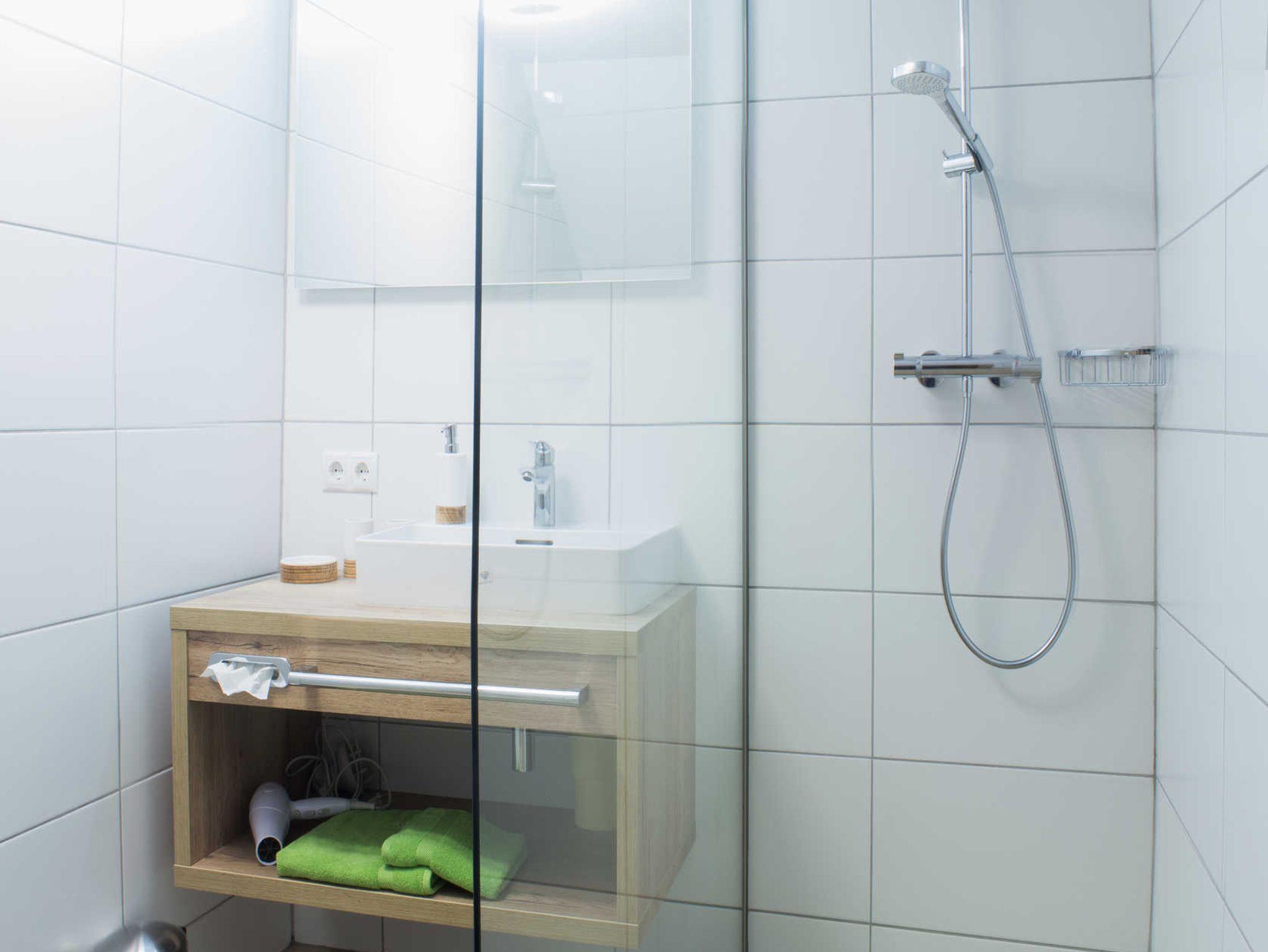 geräumiges Badezimmer mit großzügiger Walk-in Dusche, Haarföhn