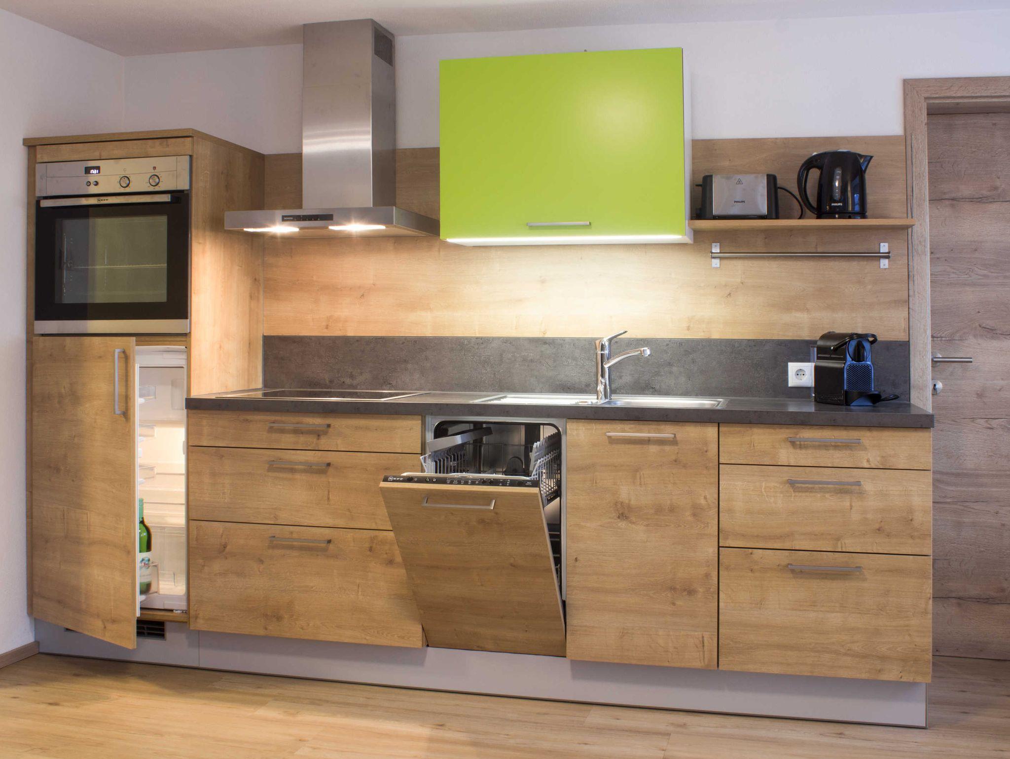 Küchenzeile ausgestattet mit Ceranfeldherd, Backrohr, Kühlschrank mit Gefrierfach, Geschirrspüler, Toaster, Wasserkocher, Geschirr, Besteck, Gläser, Töpfe, Geschirrtücher, Nespresso-Kaffeemaschine