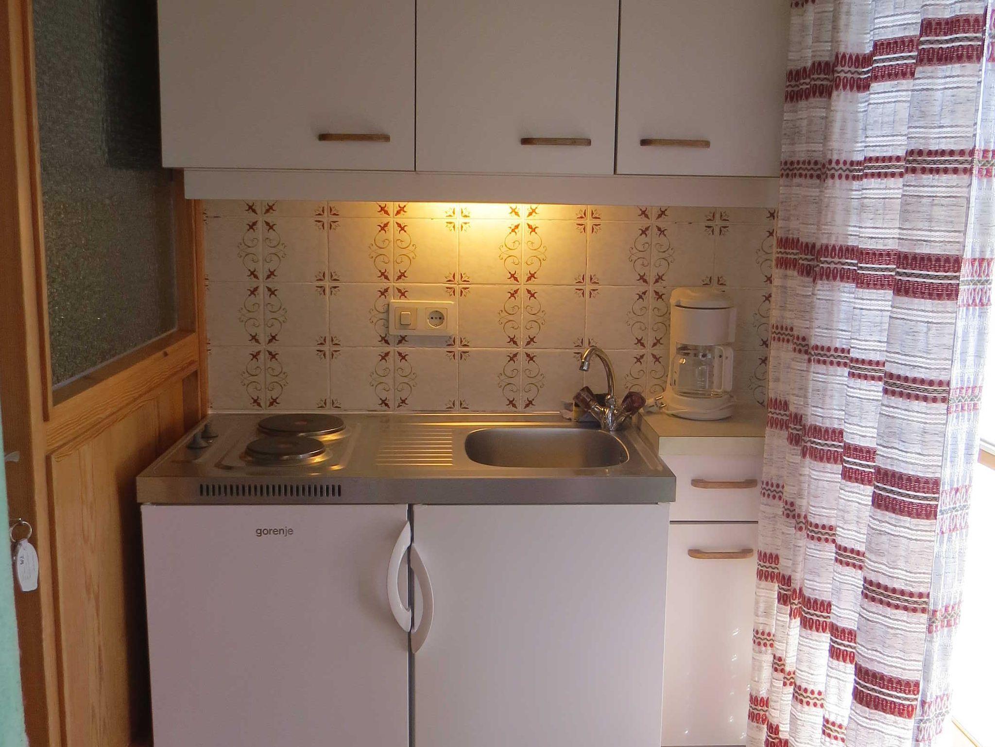 Wohn- Schlafraum, Kochnische, Dusche/WC, Balkon, SAT-TV. Die Wohnküche ist mit zwei Herdplatten, einem Kühlschrank, einer Kaffeemaschine, Geschirr und Kochutensilien ausgestattet.