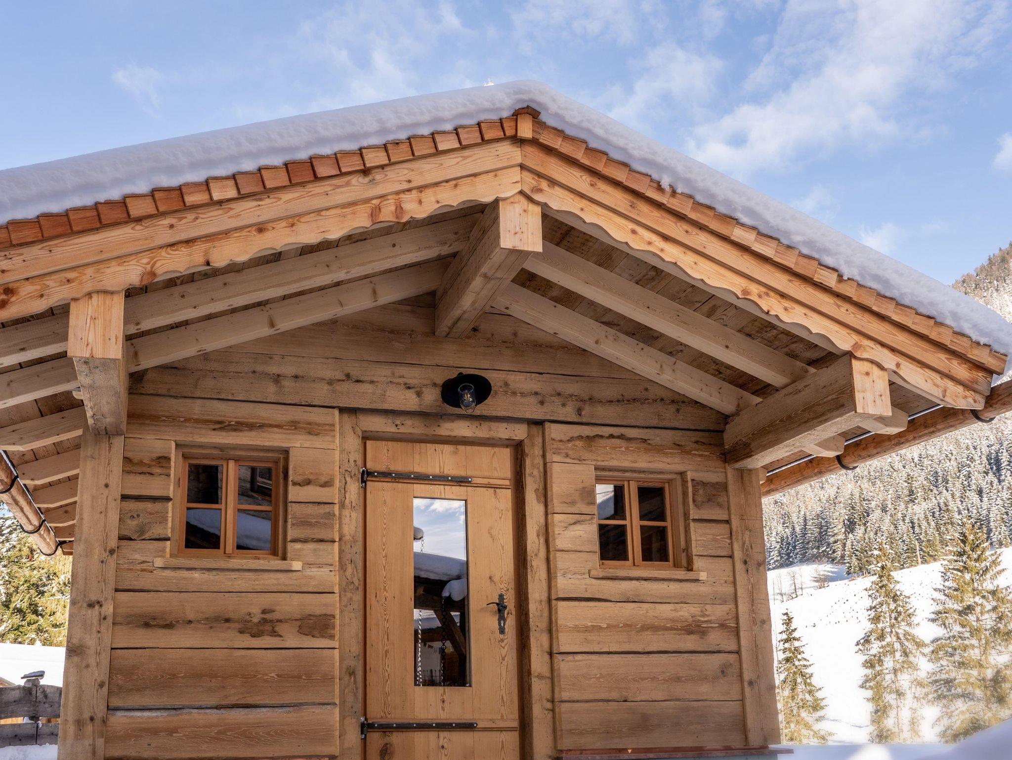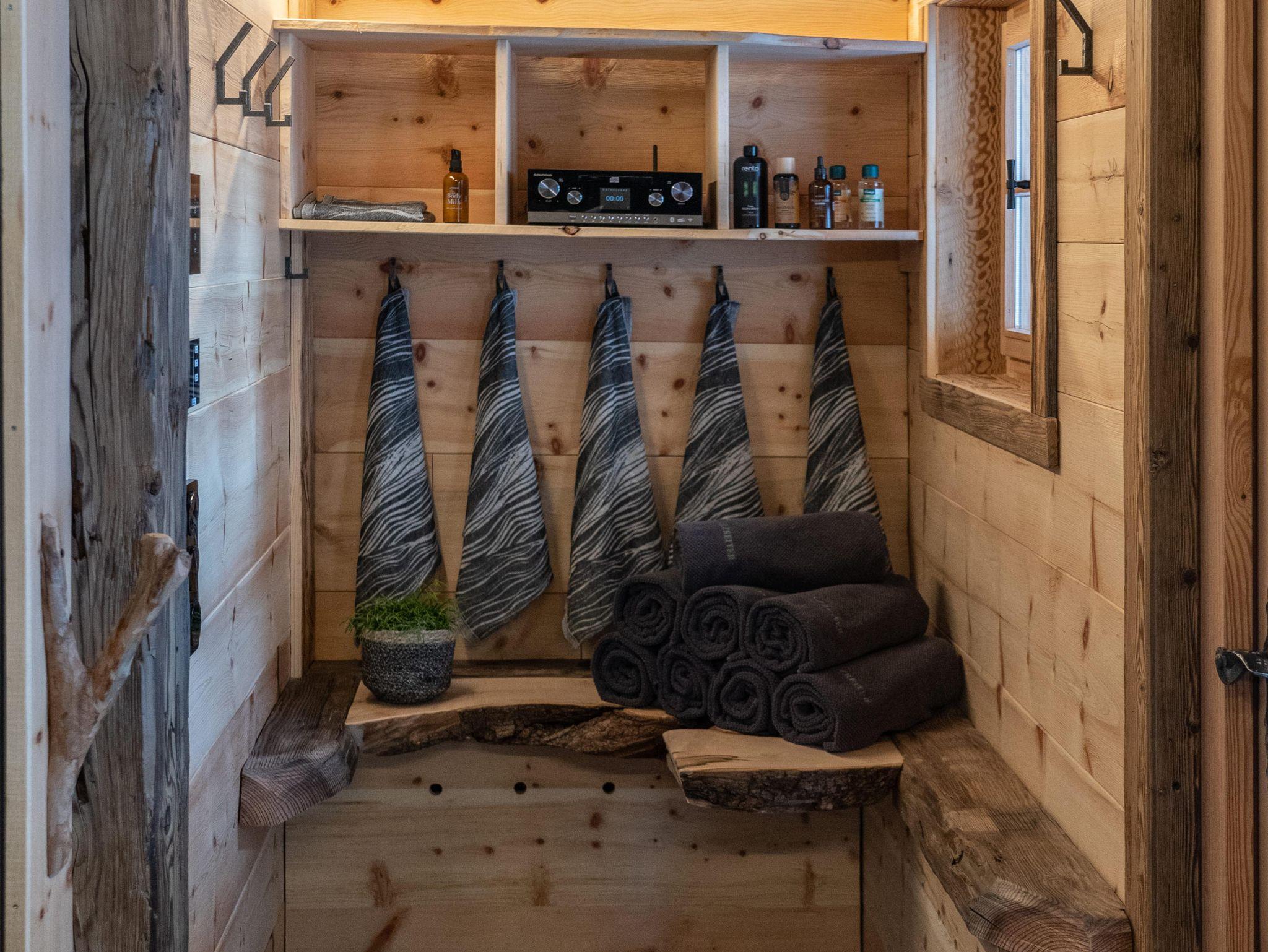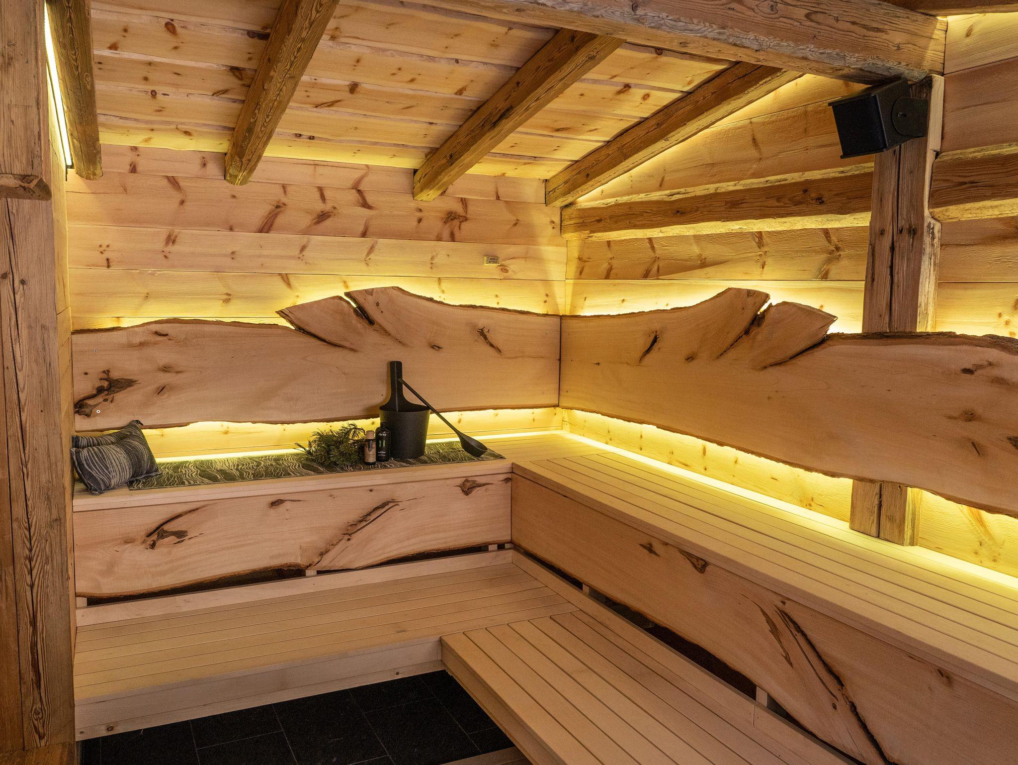 Zusätzlich ein Zirbenholz-Saunahaus für 8 Personen an. Wir haben es im gleichen Stil wie unser Haus erbaut.