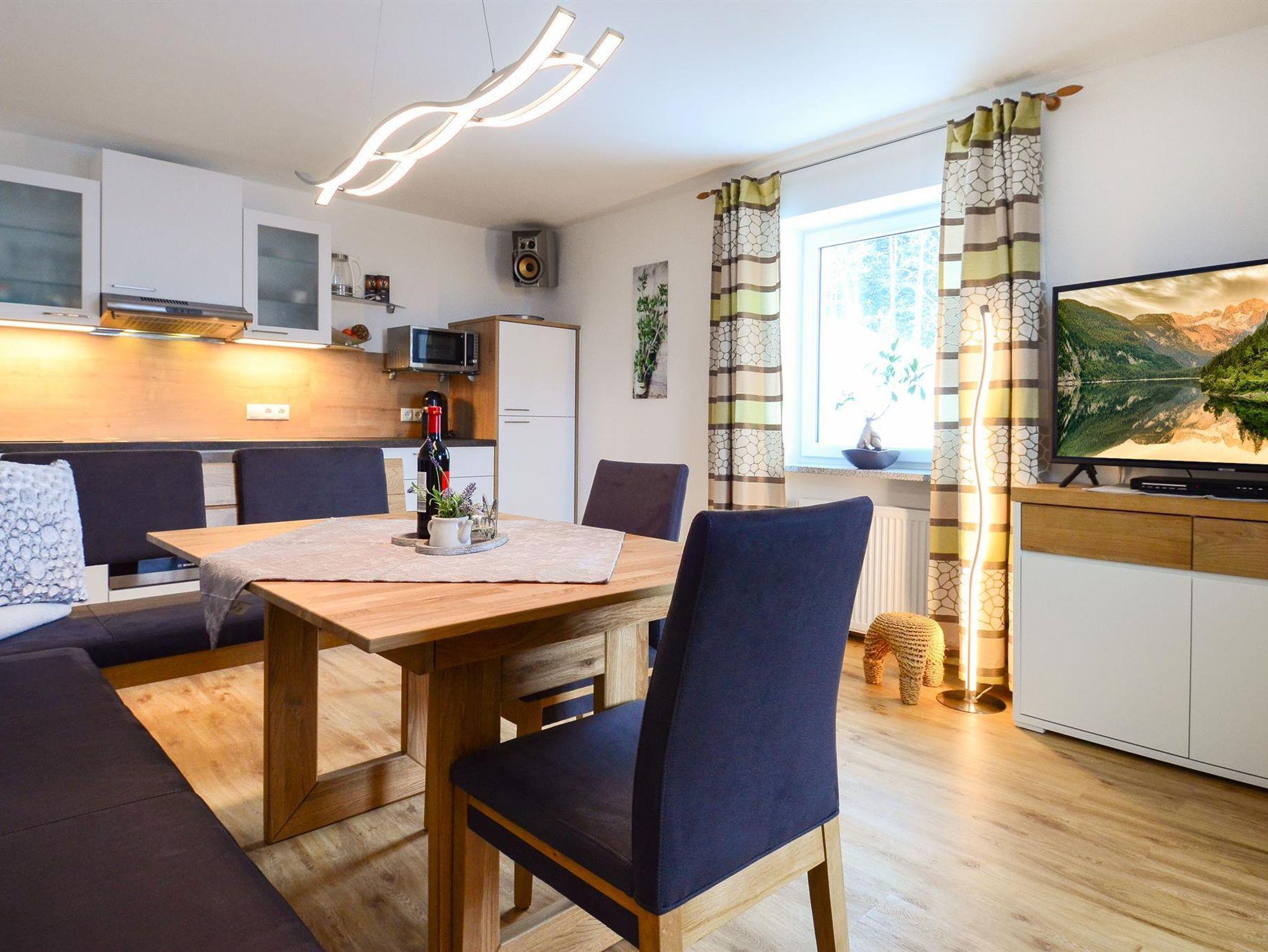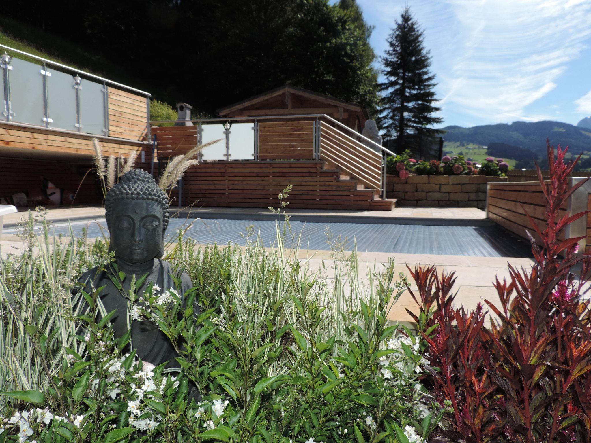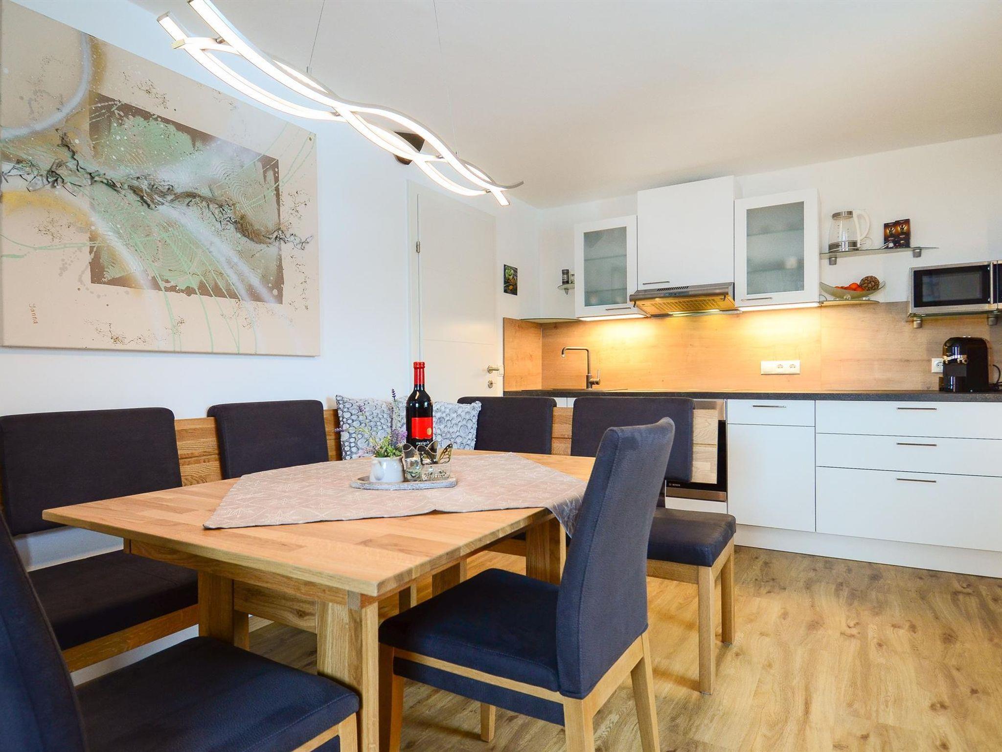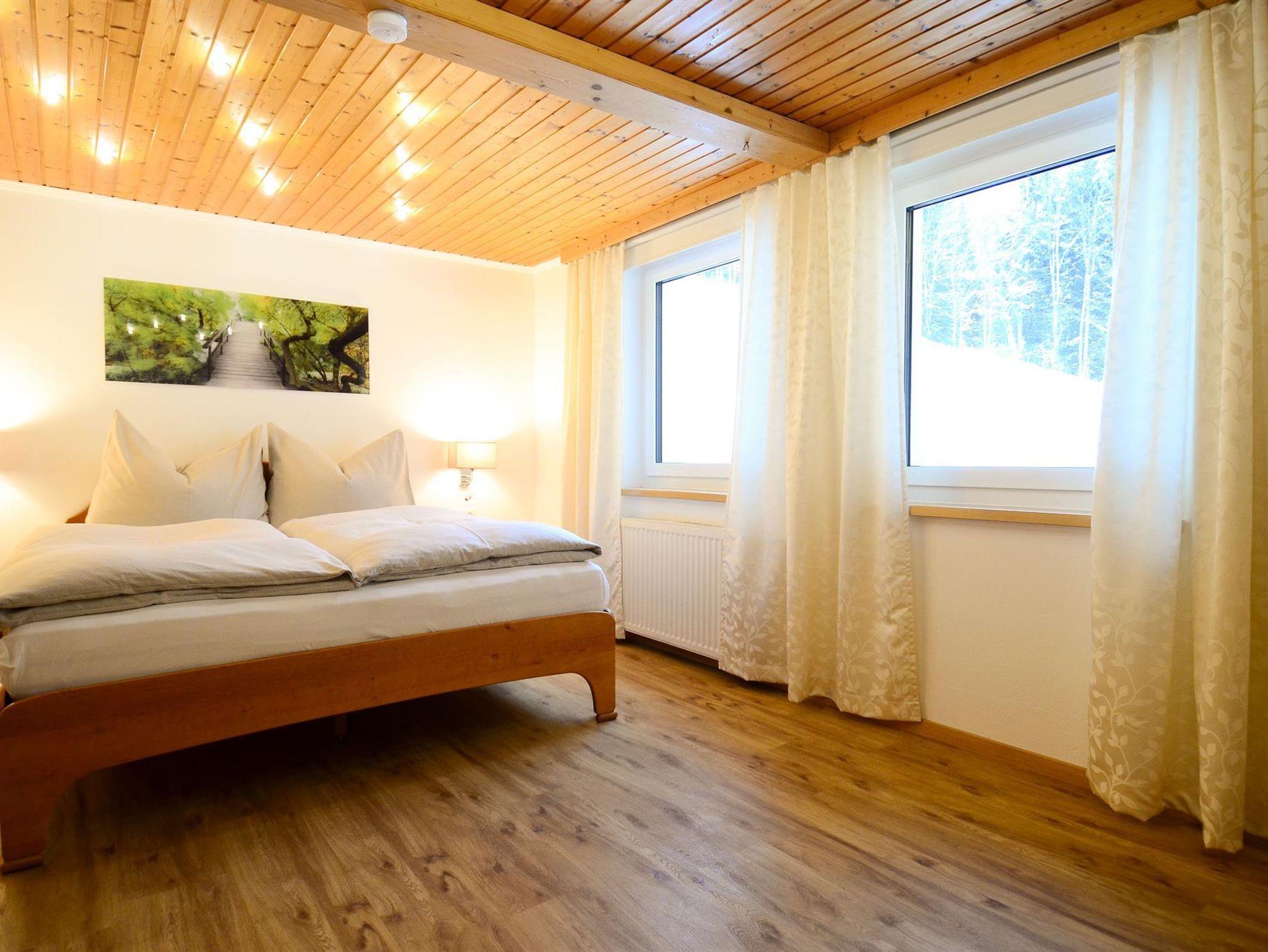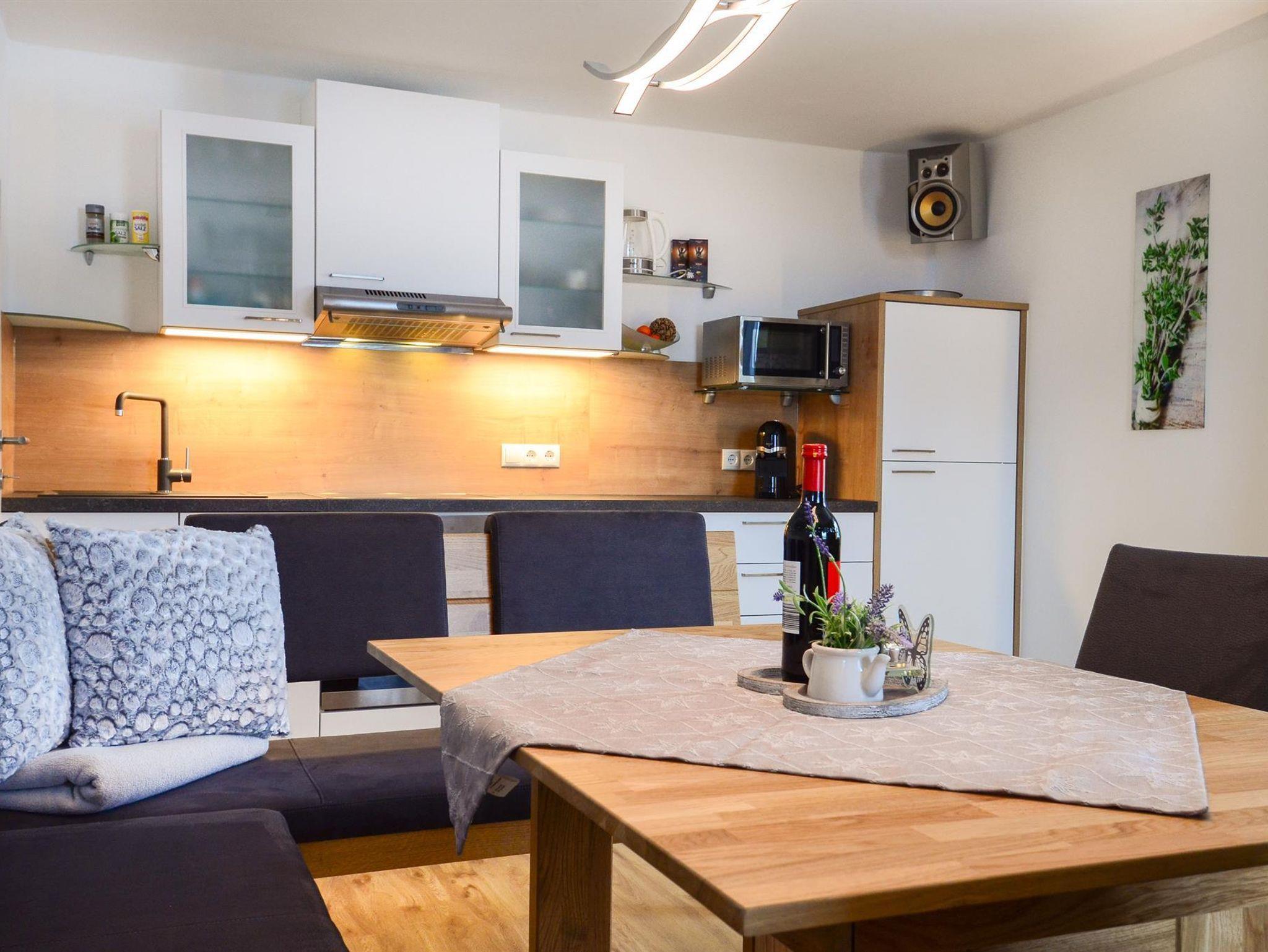 Unsere modern ausgestattete Ferienwohnung im 2. Stock (55qm) bietet sich besonders für Familien mit Kindern, aber auch für Pärchen an. Sie verfügt über 2 getrennte Schlafzimmer - ein sehr geräumiges Doppelzimmer (23qm) mit großem LED-TV und ein Zimmer mit einem Stockbett (Verbindungstür/Durchgang zum Schlafzimmer), ein Wohnzimmer mit gemütlicher Eckbank, LED-TV, Stereoanlage, DVD, W-LAN kostenlos, einer Dusche mit WB, einem separaten WC, und einer voll ausgestatteten Küchen mit Besteck, Tischwäsche und sonst. Utensilien. Der Ausblick vom Balkon auf die Berge ist atemberaubend. Unser Garten mit Gartenhütte und Kinderspielplatz (Grillmöglichkeit vorhanden/Poolbenützung kostenlos/saisonal) steht ihnen jederzeit gerne zur Verfügung.
