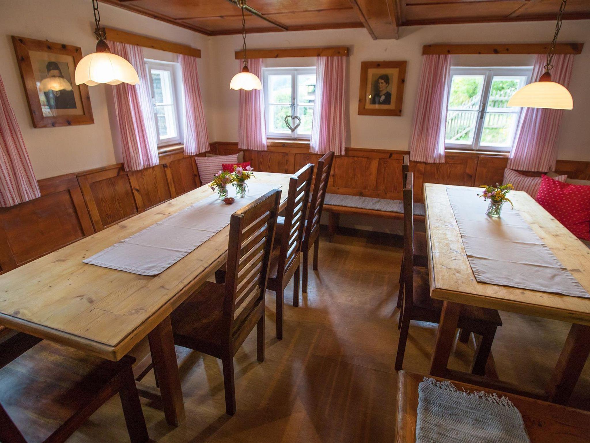 Die Stube im Erdgeschoss ist mit einem gemütlichen Kachelofen ausgestattet und hat zwei große Tische.