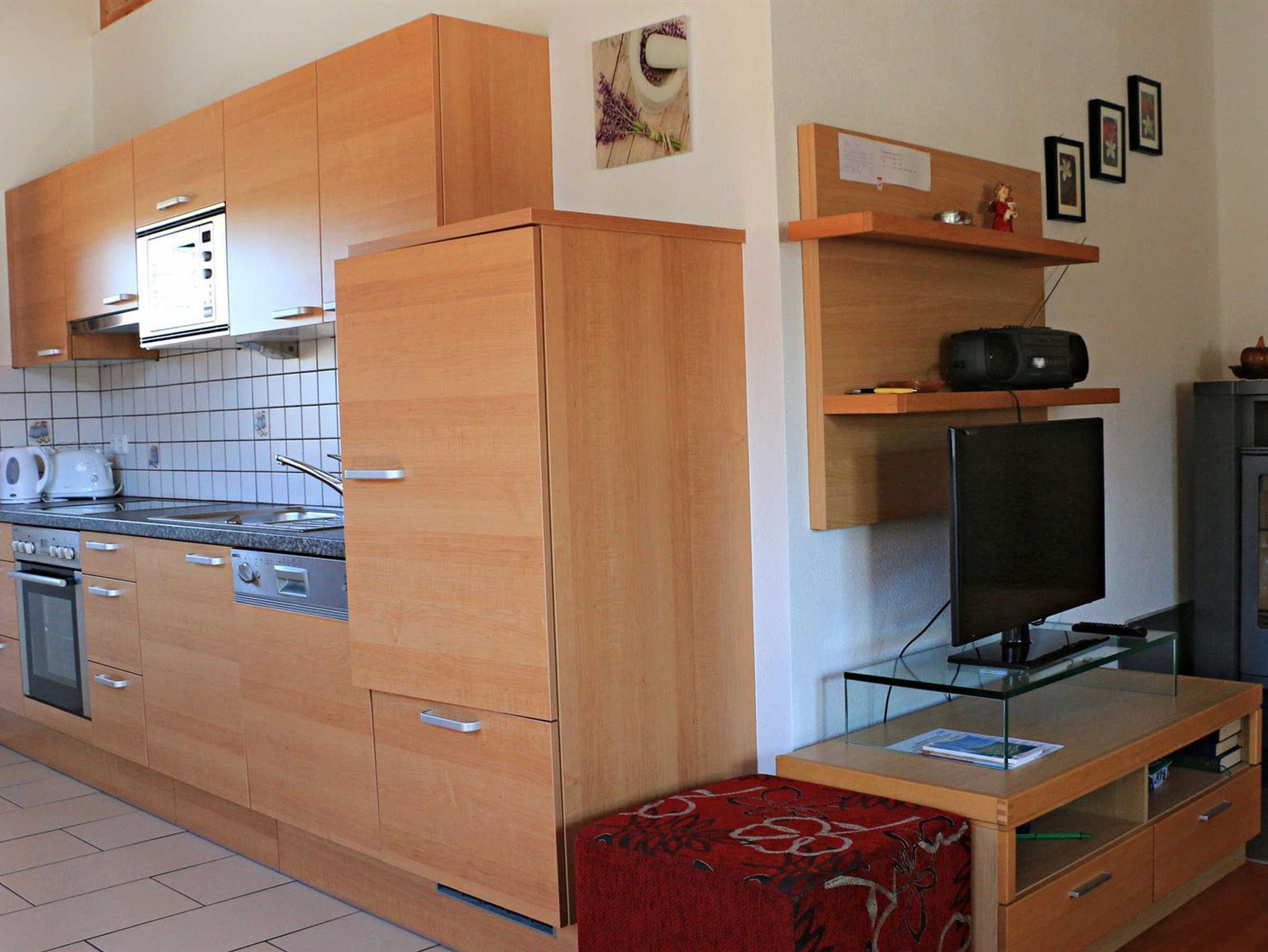 Komfortable Ferienwohnung mit großzügiger Wohnküche, Schlafzimmer und großem Bad im 1. Obergeschoss (Dachgeschoss) mit eigenem Balkon und Terrasse.