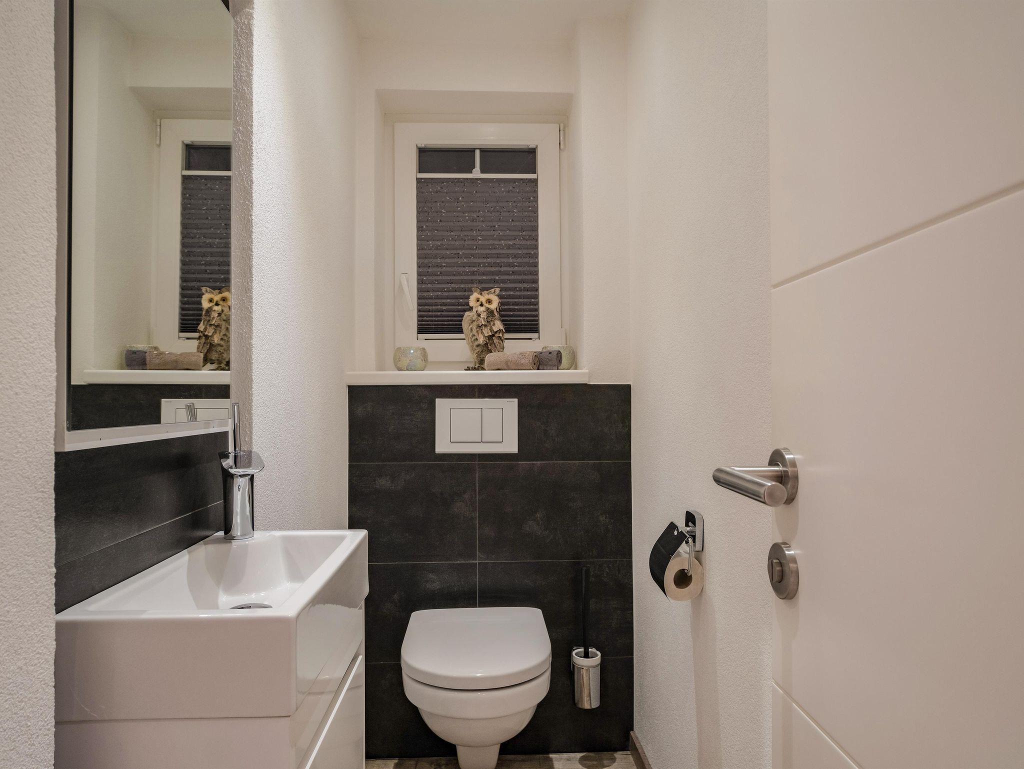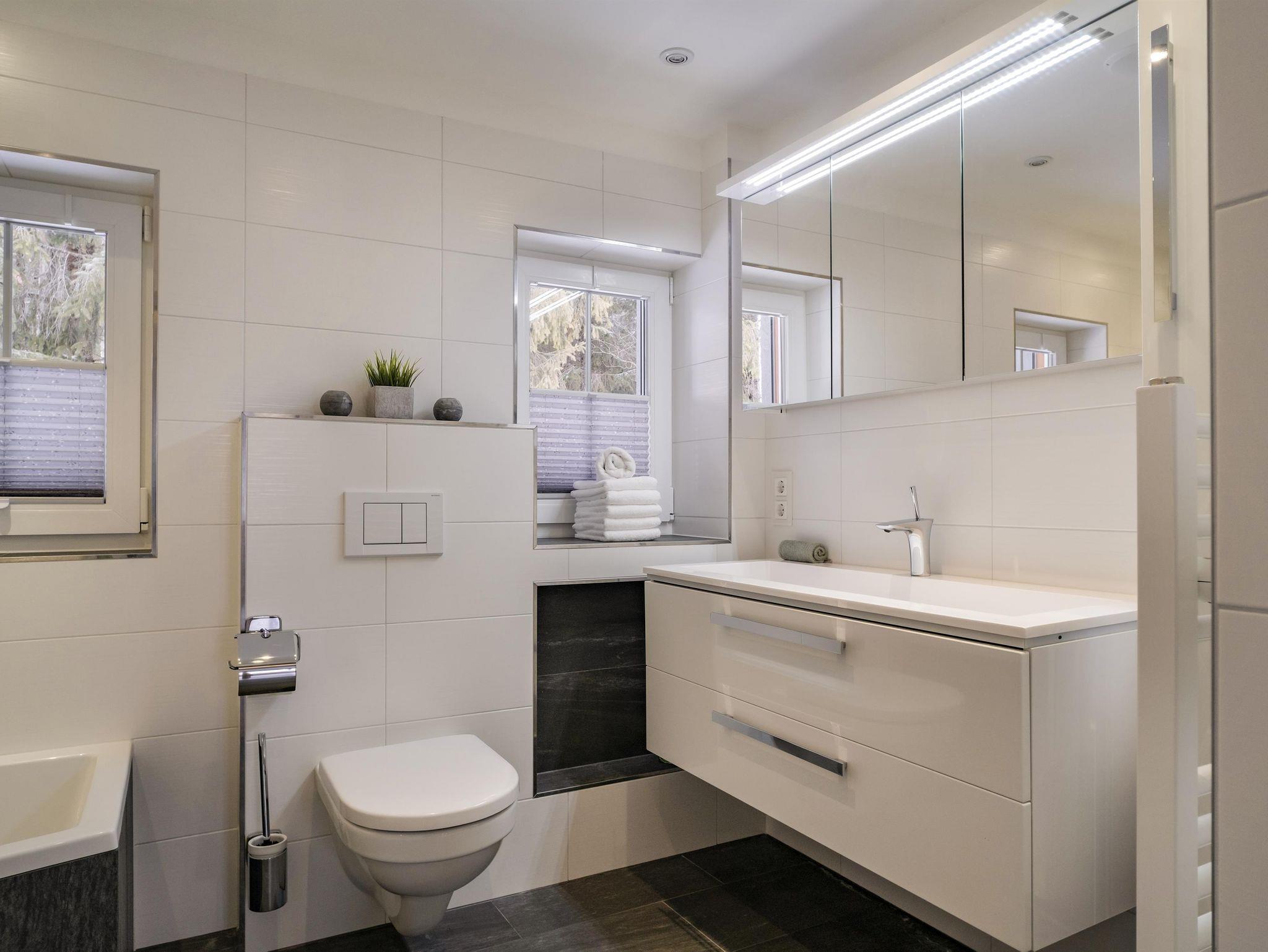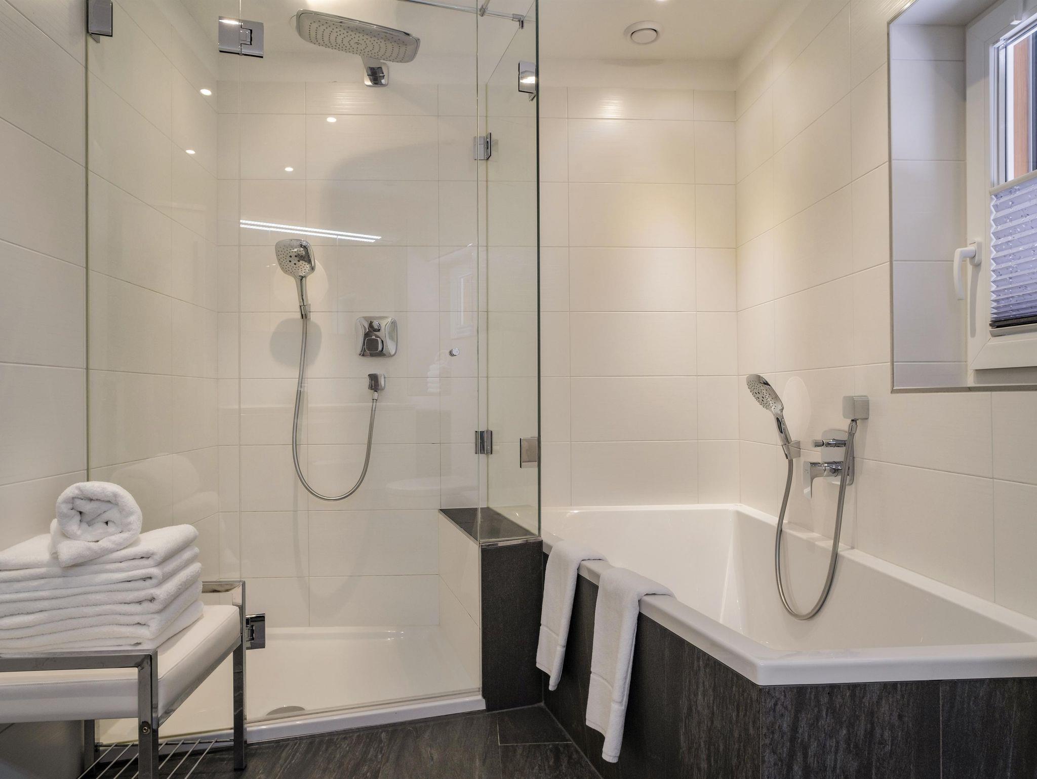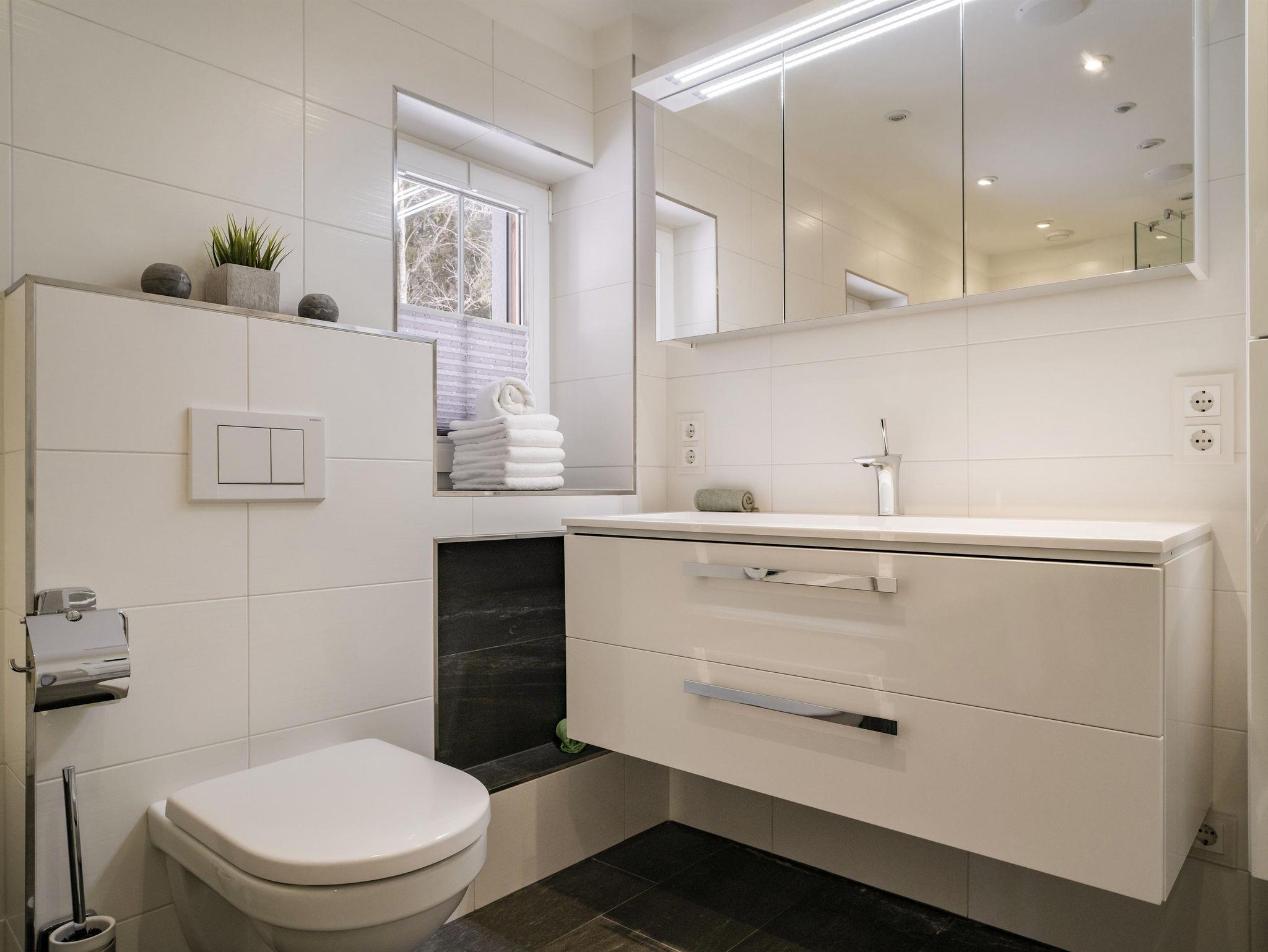 - 1 Badezimmer mit Dusche, Badewanne, Toilette und ausreichend Stauraum