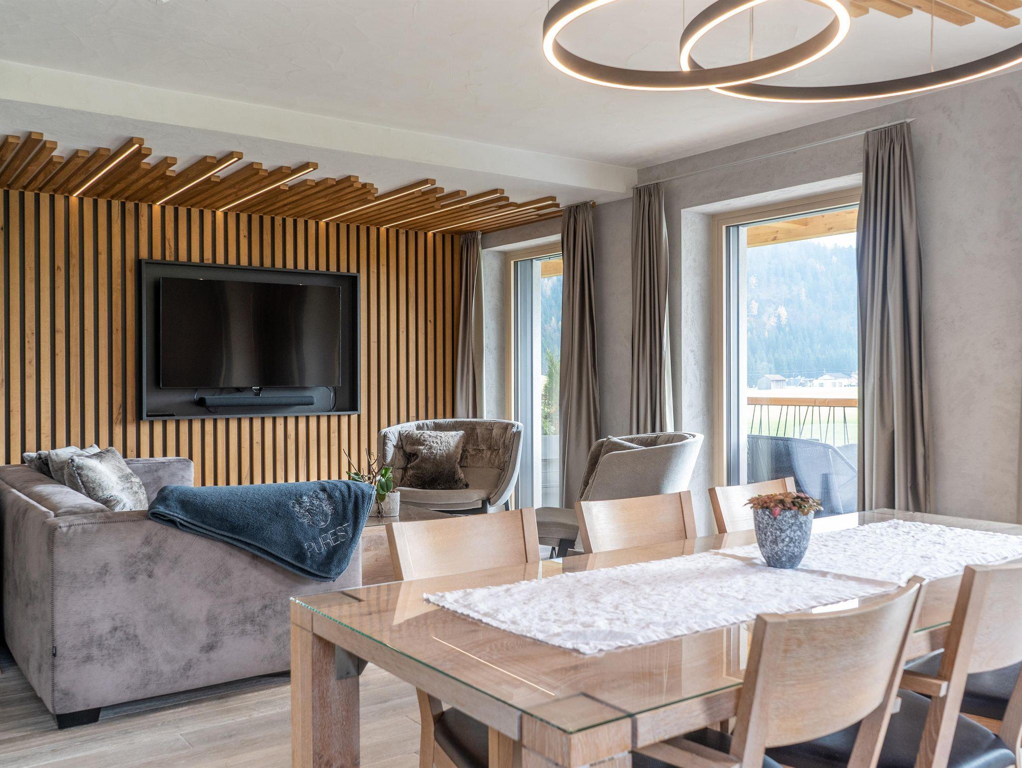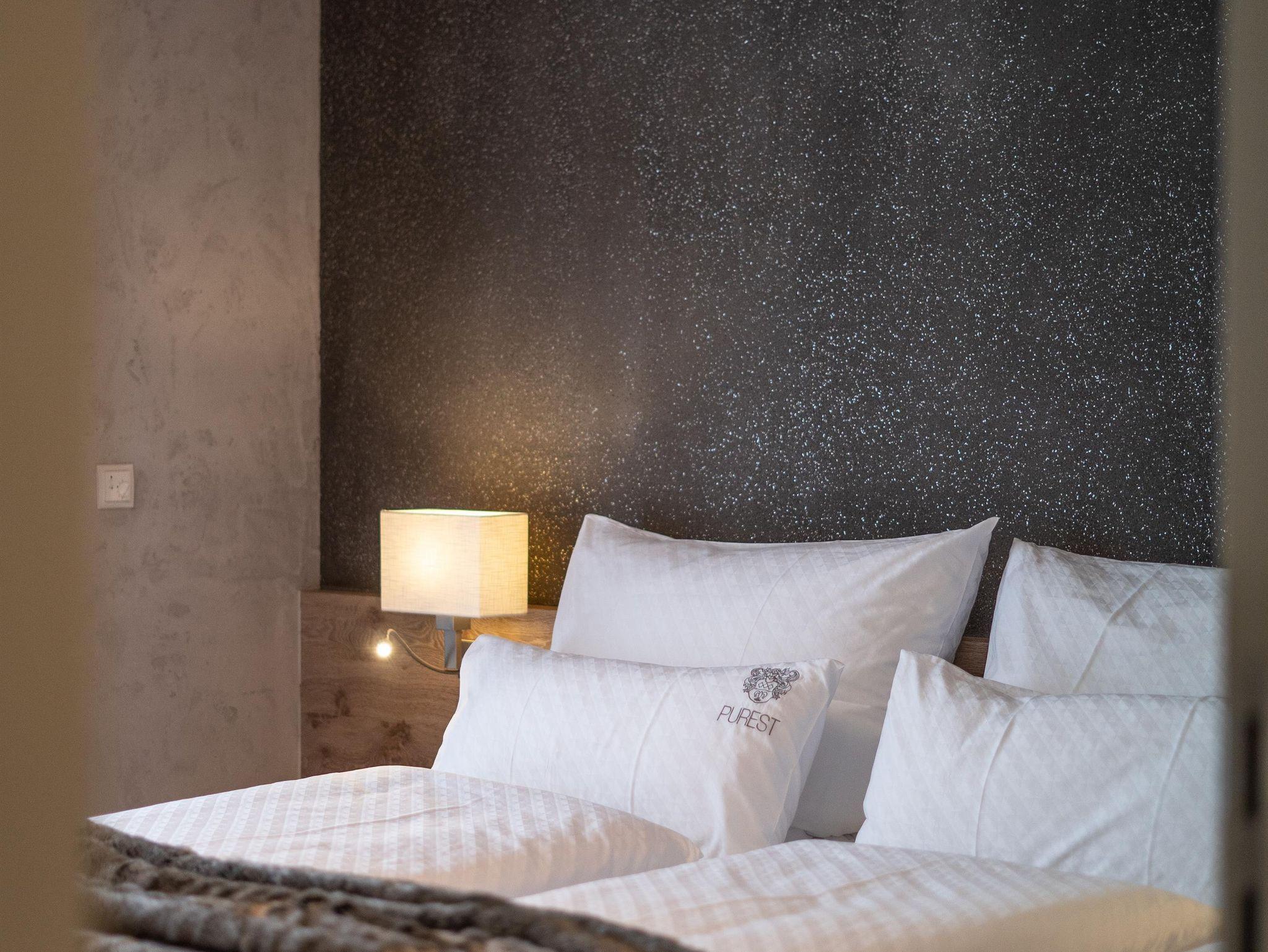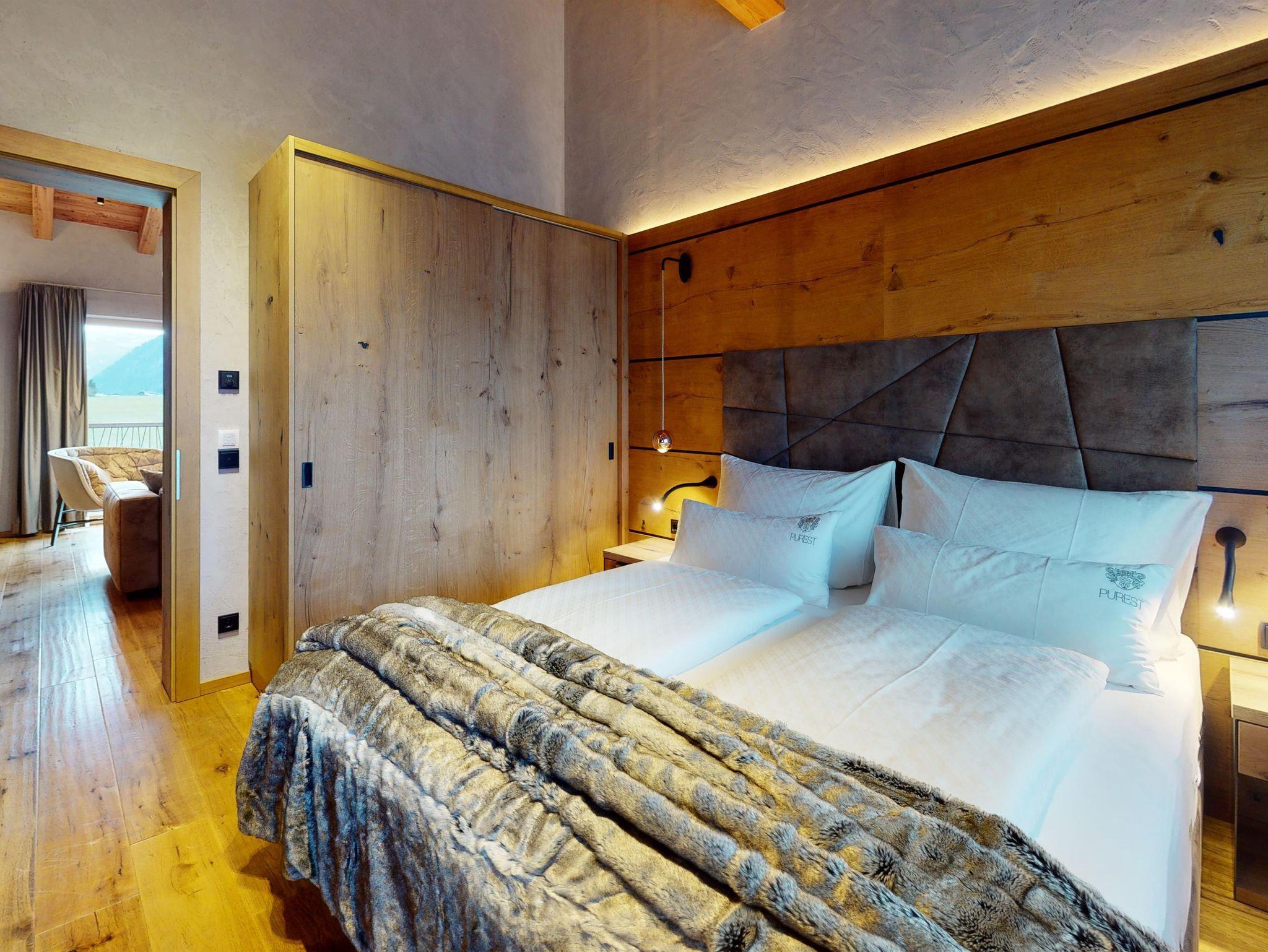 Unsere exquisite Appartement PUREST Happiness ist eine neue, helle und freundliche 72m² Ferienwohnung bestehend aus einem Wohnraum mit einer hochwertigen Schlafmöglichkeit für die 5. und 6. Person sowie einer Küchenzeile. Zwei separate Schlafzimmer für je 2 Personen sind jeweils mit einer Schrank-, Schreibtischkombination ausgestattet. Das modern eingerichtete Bad mit begehbarer Dusche bietet als Besonderheit eine Infrarotkabine. Das 2. WC ist vom Bad getrennt. Der 21m² große Süd- und West-Balkon bietet einen wunderschönen Panorama-Ausblick auf Wiesen und Berge.
