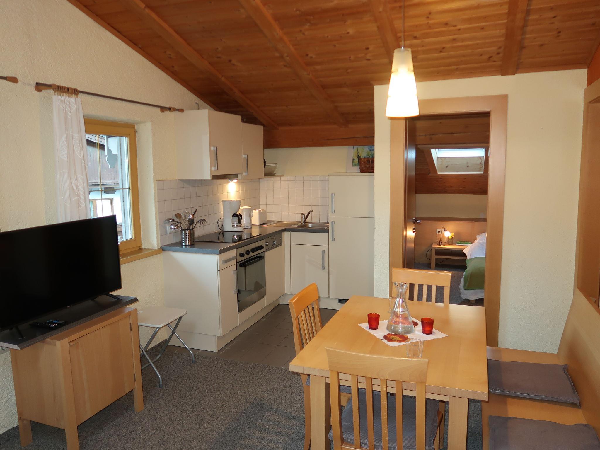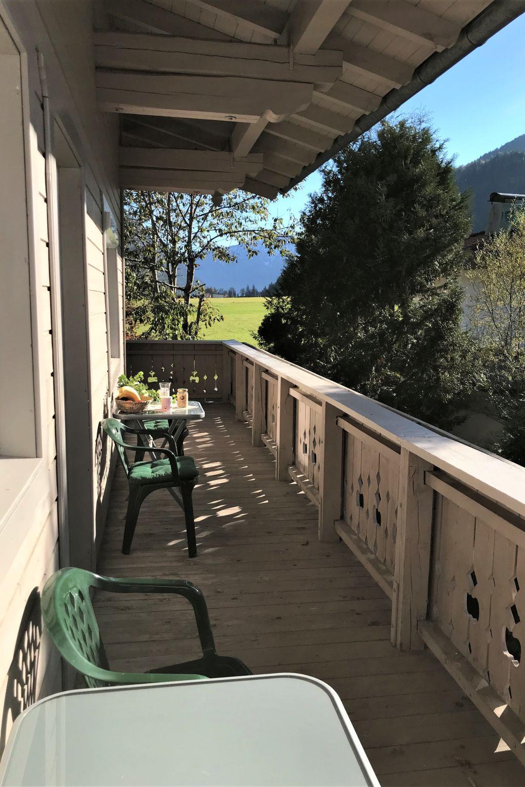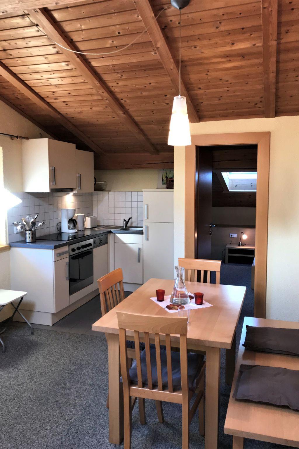 "Christlum", 2-room apartment 51 m2, on the top floor. Partly with sloping ceilings, wooden furniture furnishings: living/sleeping room with 1 sofabed (140 cm), dining table and satellite TV (flat screen). 1 room with 1 bed and 1 double bed. Open kitchen (oven, dishwasher, 4 ceramic glass hob hotplates, kettle, electric coffee machine). Bathroom, sep. WC. Heating. Carpet. Beautiful view of the mountains and the countryside. Facilities: Internet (WiFi, free). Parking (roofed, 1 car). Please note: non-smokers only. A shared balcony (west orientation) with balcony furniture on the first floor can be reached via the floor corridor.