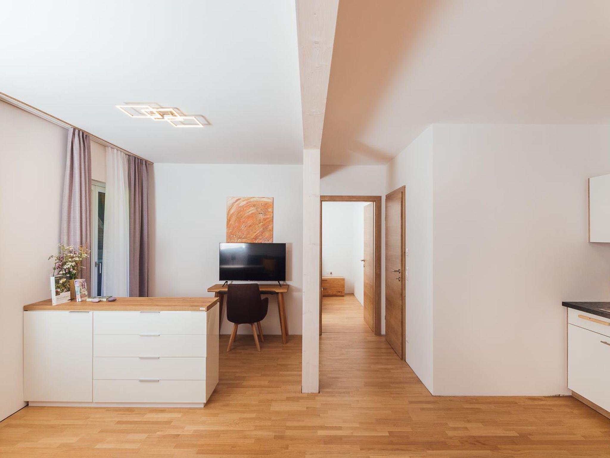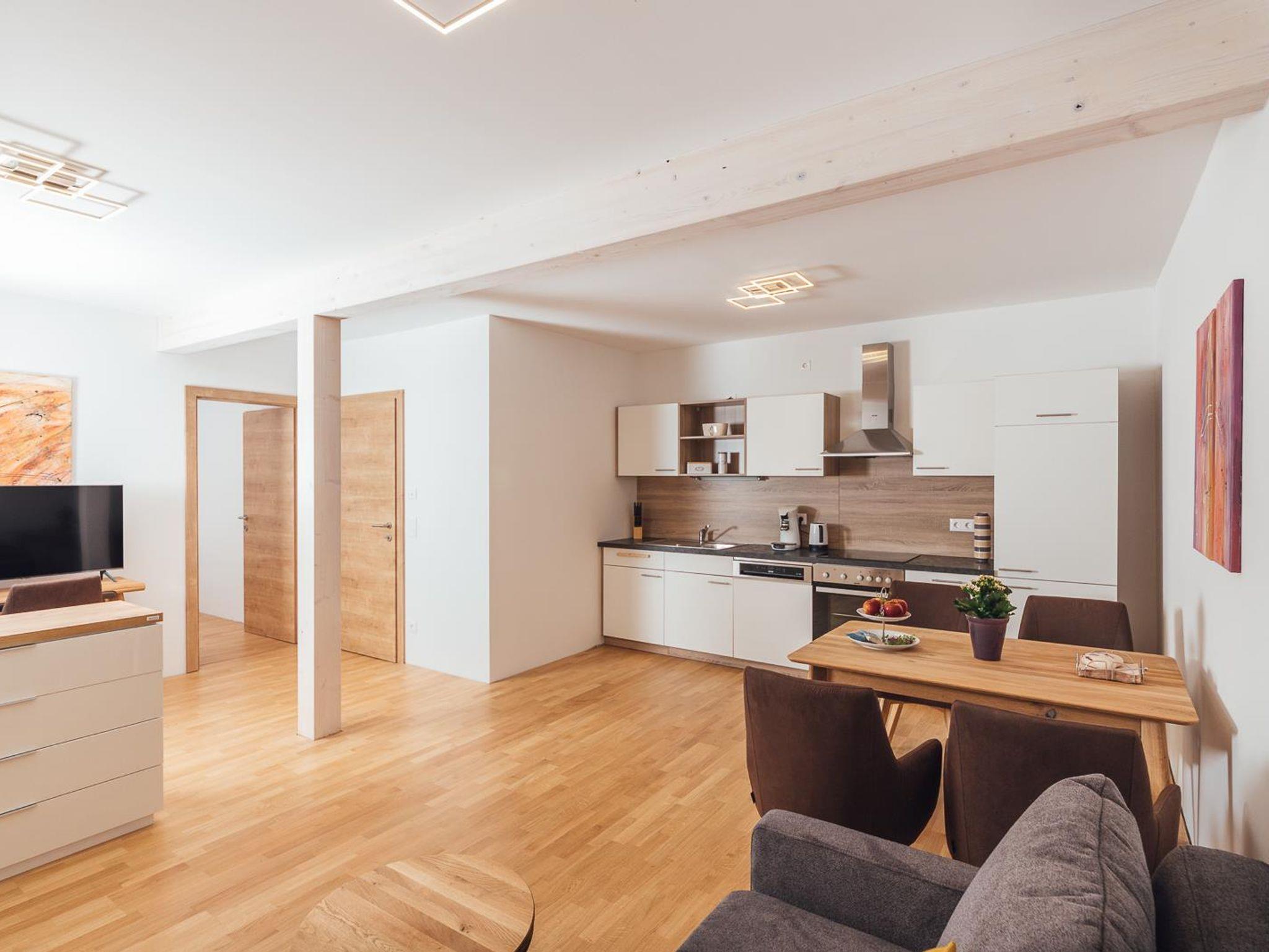 Modern eingerichtetes Appartement für 2 bis 4 Personen, Wohnzimmer mit Schlafcouch, Schlafzimmer, Badezimmer und Küchenzeile