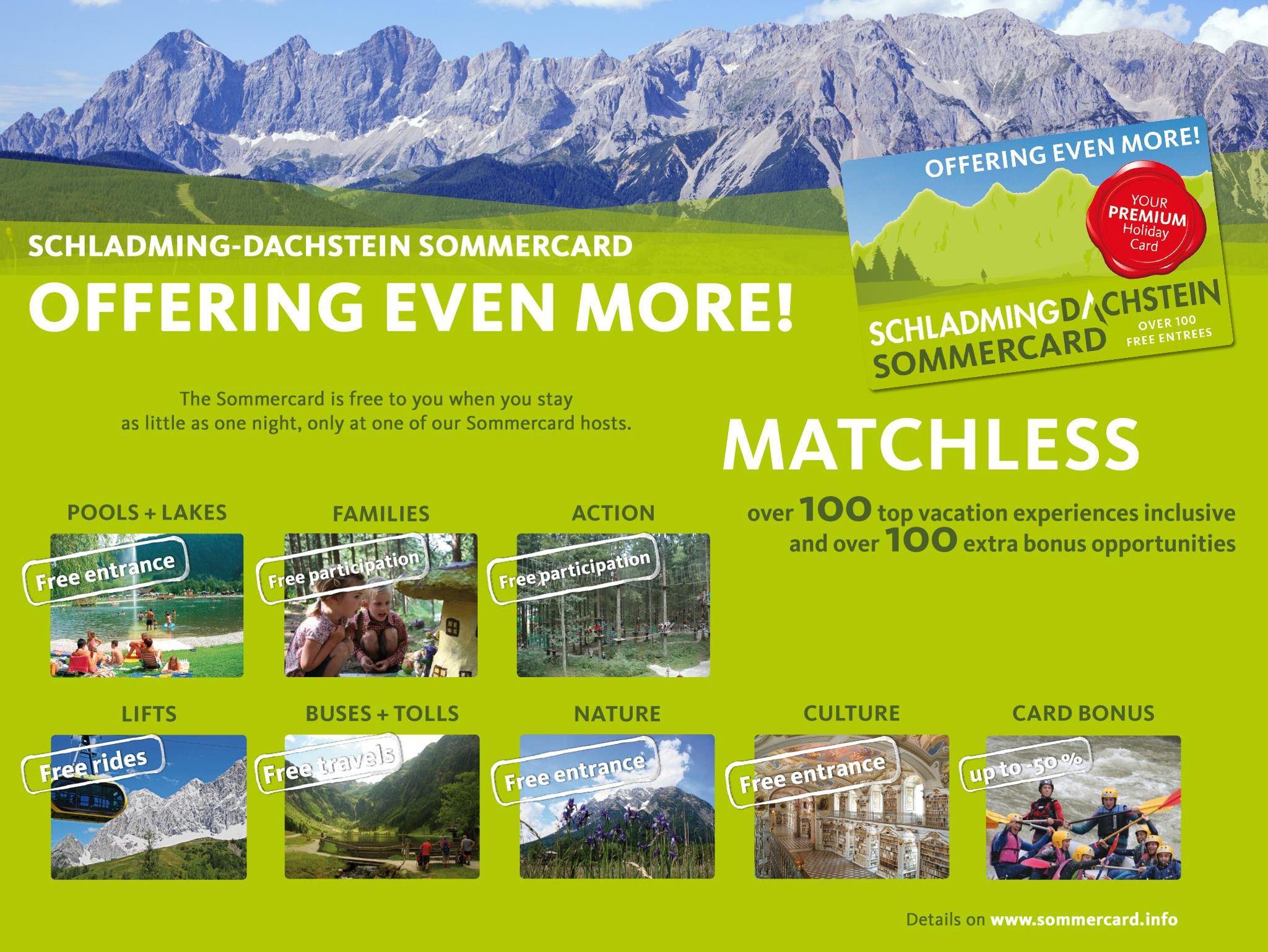 Für Ihren Sommerurlaub bieten wir Ihnen als Highlight die Schladming-Dachstein Sommercard an. Mit dieser Sommercard erhalten Sie freien Eintritt in über 100 Top-Freizeitattraktionen und bis zu 50 % Ermäßigung bei über 100 Bonuspartnern. Und das Beste ist: Die Sommercard gibt es für Sie kostenlos bereits ab einer Übernachtung, gültig inklusive An- und Abreisetag. Natürlich erhält Ihr Kind seine eigene KidsCard – und alle Urlaubsträume werden wahr.