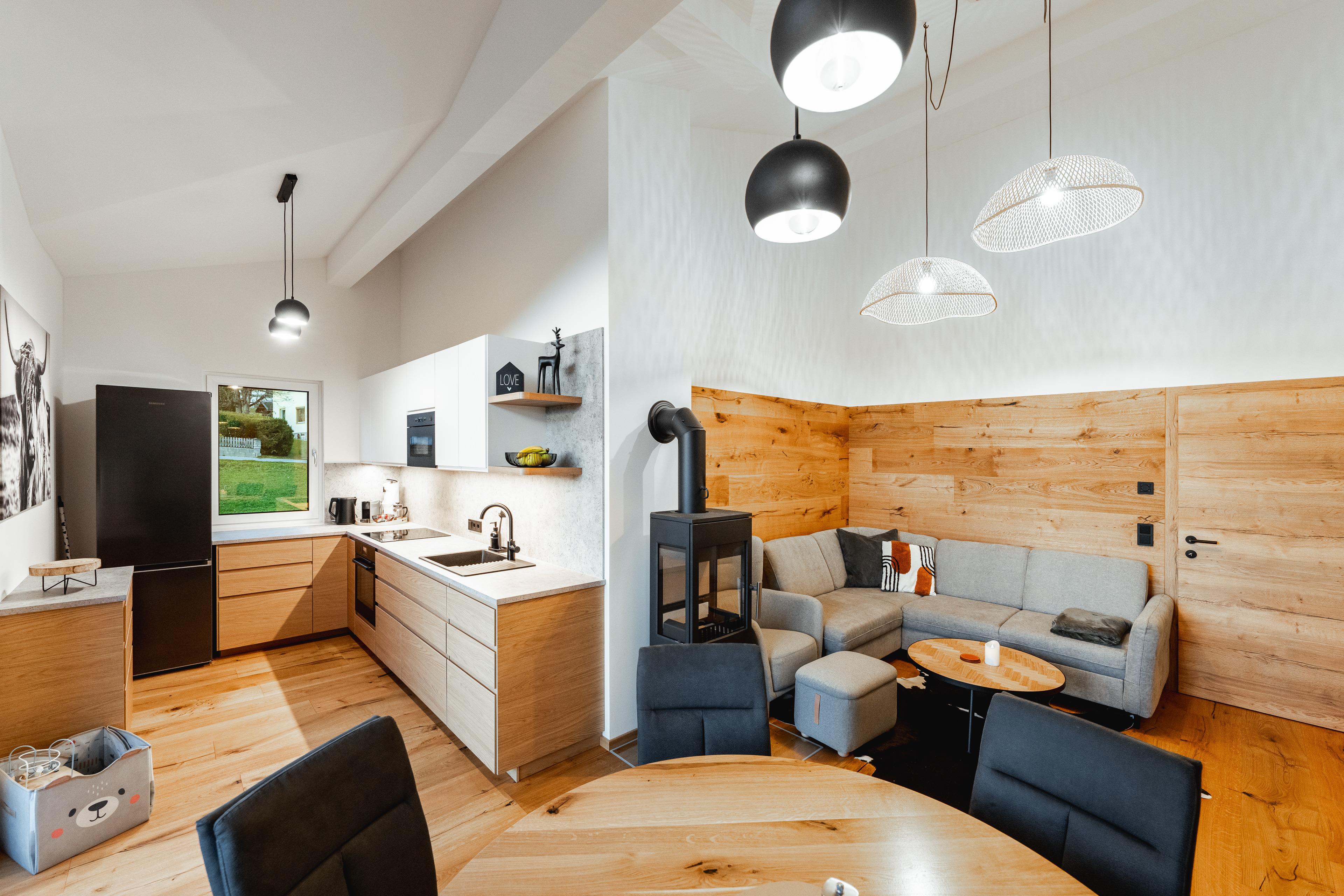 The living area invites you to relax with a large dining table, cosy seating area and direct access to the 22 m² panoramic terrace – here you can enjoy breakfast with a view of the Alps or the sunset over the peaks of Ski Amadé in the evening.