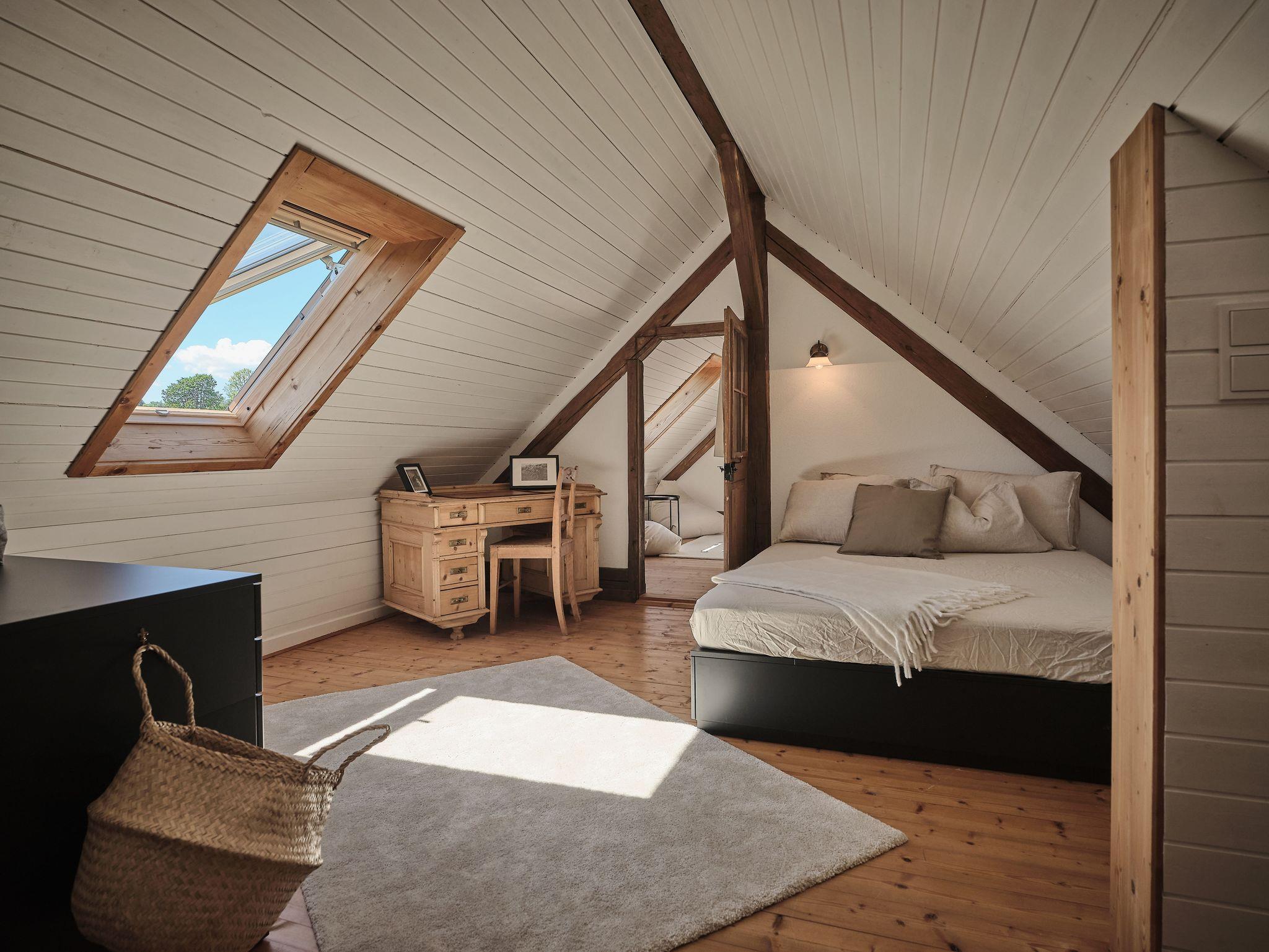 Die Ferienwohnung Obstgarten hat ca. 75 m2 und ist mit einem Kachelofen ausgestattet. Die Wohnung ist sehr großzügig mit einem modernen Badezimmer. Das Obergeschoß ist eine kuschelige, helle Mansarde. Dort befinden sich ein Wohn-Schlafraum mit Bett, das auch als Couch genutzt wird und das angrenzende Schlafzimmer. Die Wohnung hat einen eigenen Gartenausgang zu den Obstbäumen.