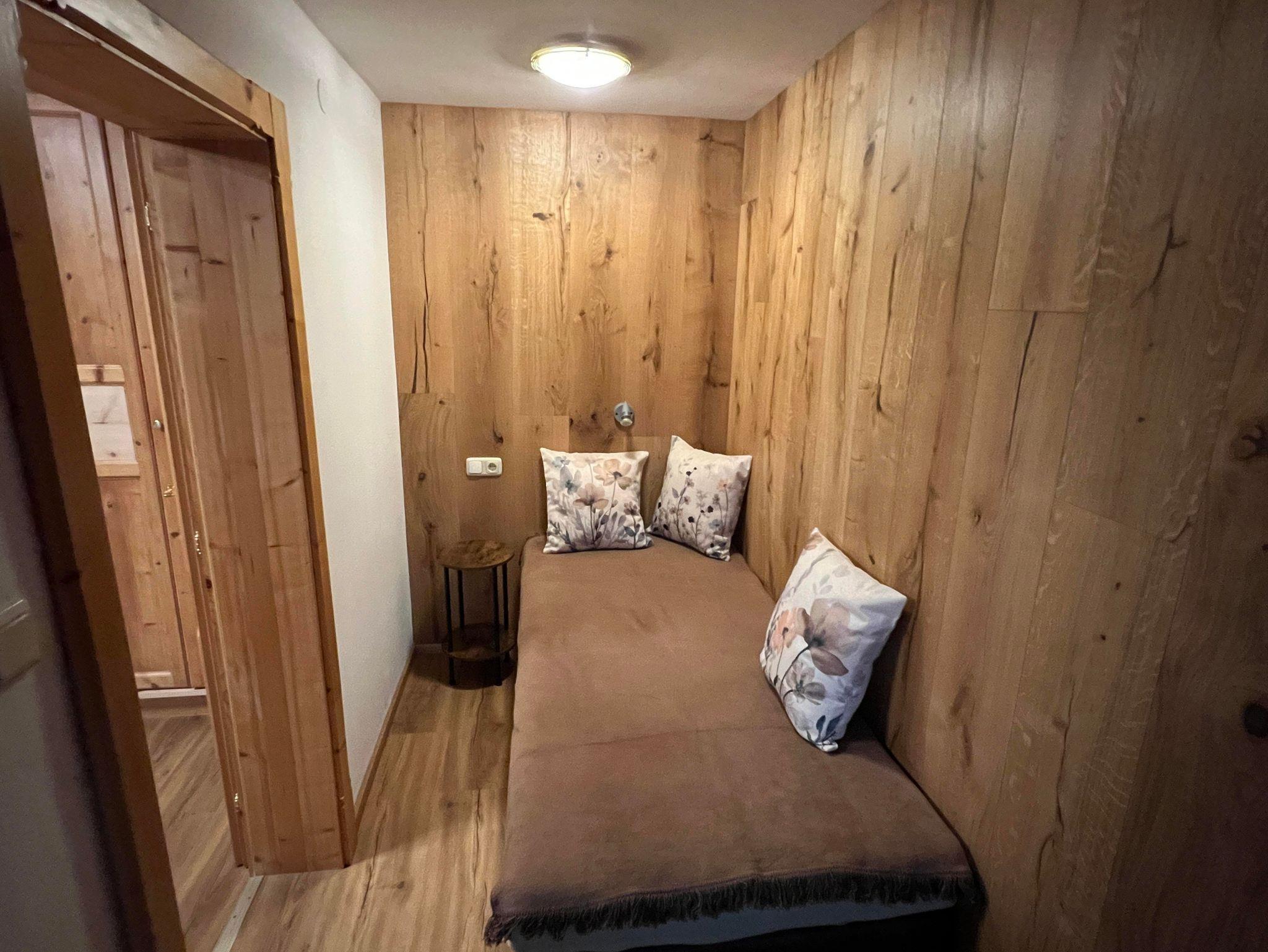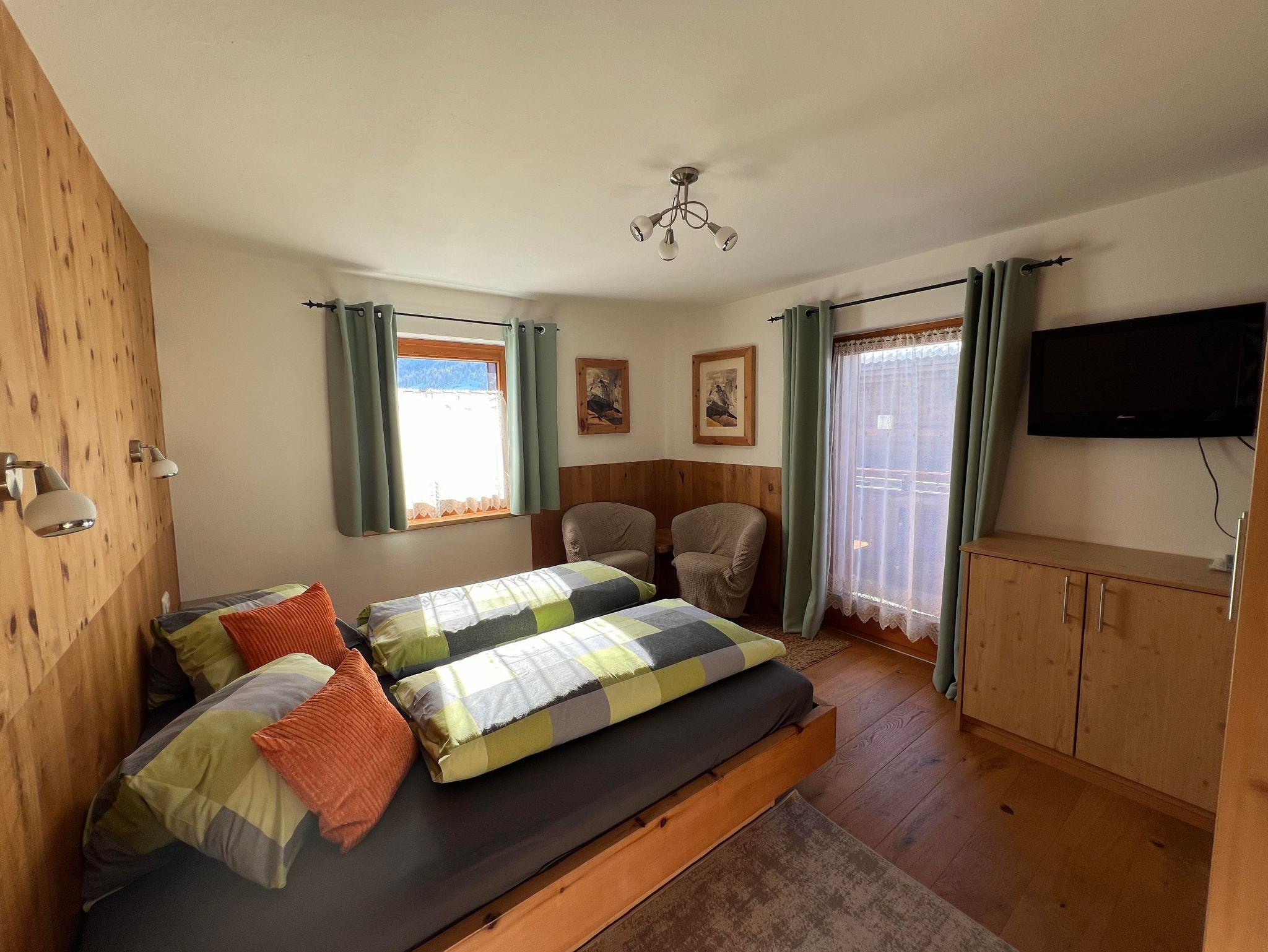 Die zwei Schlafzimmer in der Ferienwohnung, sind mit Naturholzböden und Betten und Möbel aus Zirbenholz ausgestattet.