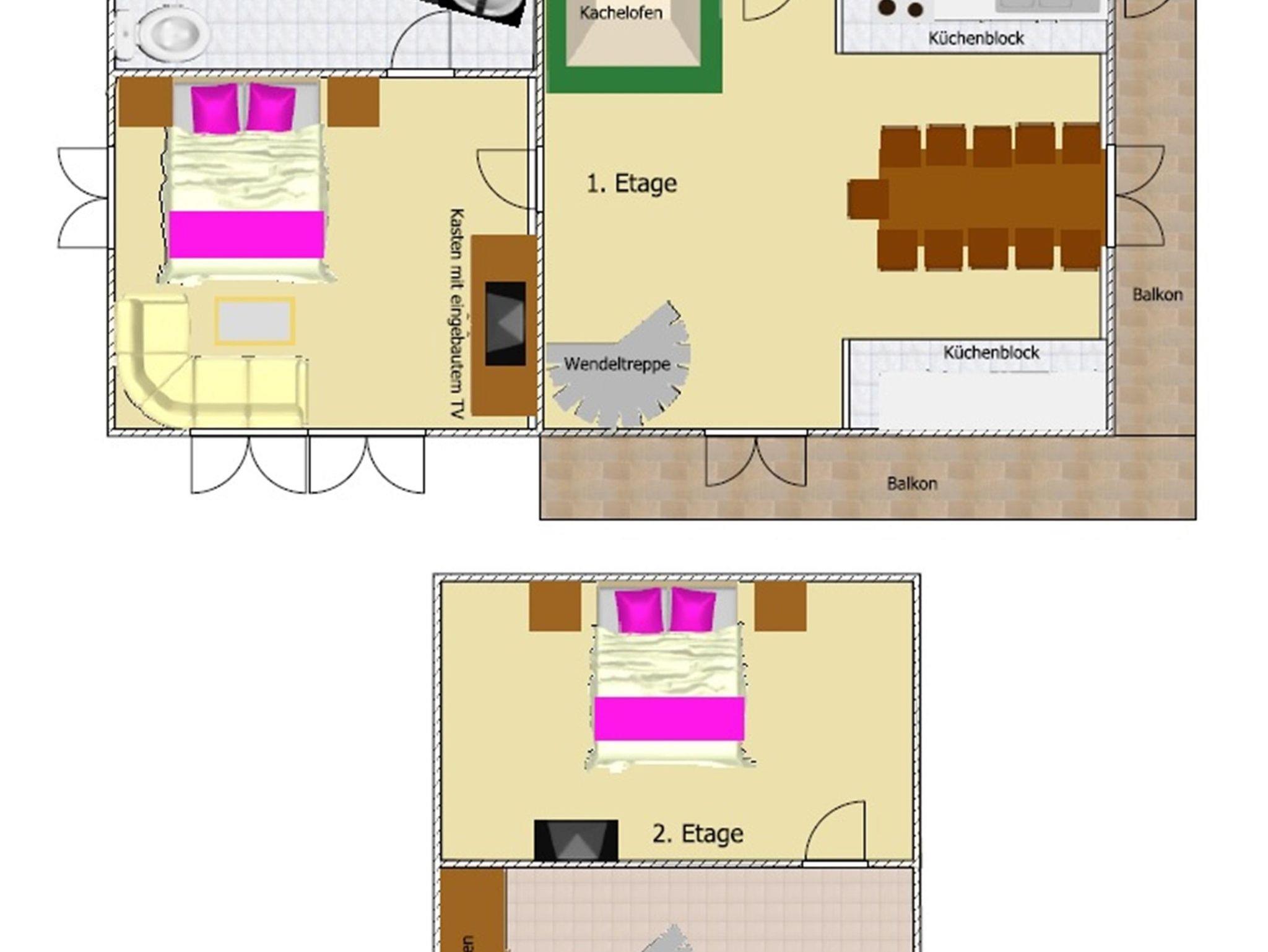 ca. 50 m², 1 - 2 Schlafräume, Wohnküche mit Kamin, voll ausgestatteter Küchenblock, Geschirrspüler, Backofen und Mikrowelle, abtrennbares Wohnzimmer, Bad mit Dusche/WC, Balkon, Garten
