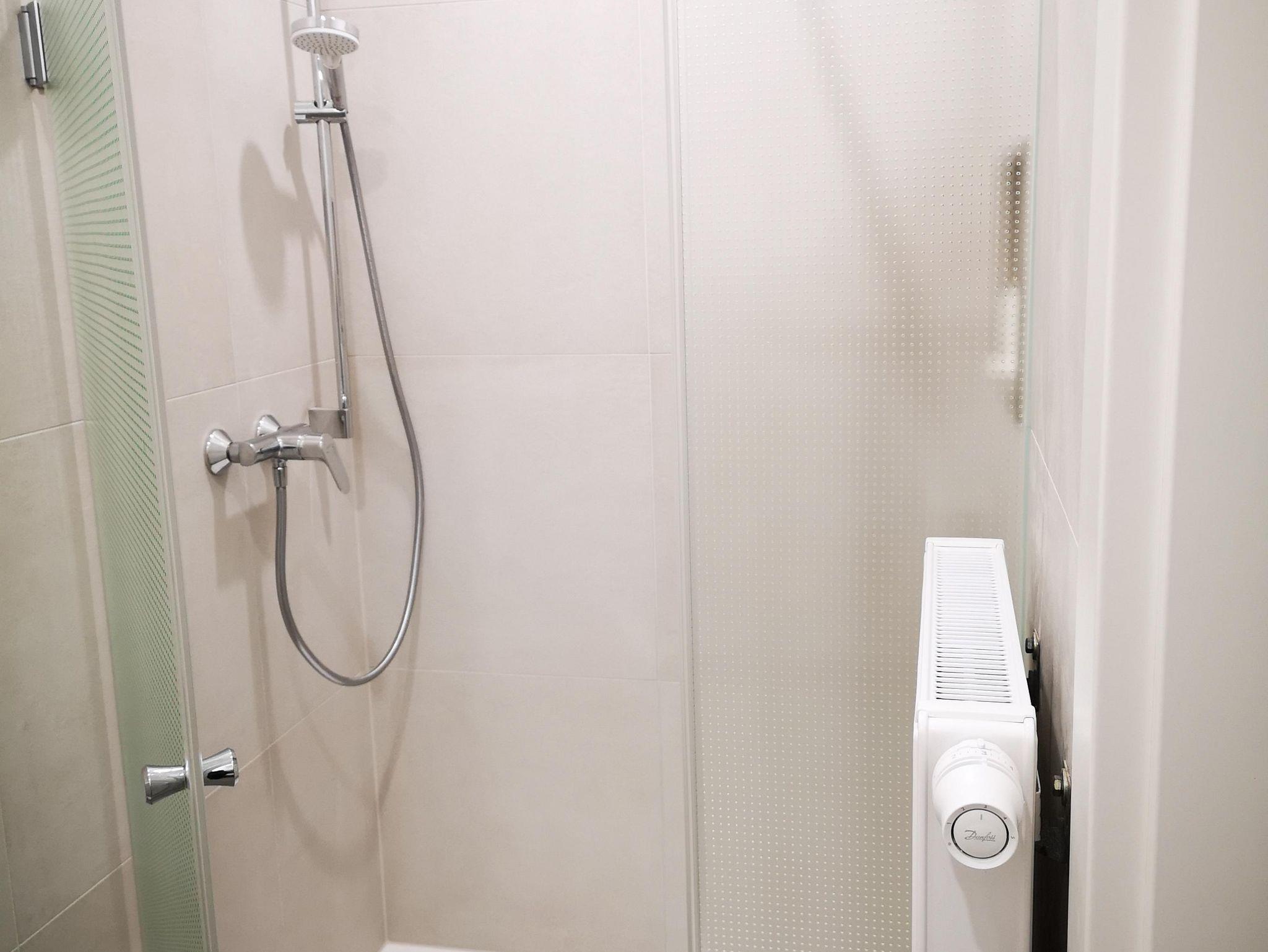 Das moderne Badezimmer hat eine bodengleiche Dusche, einen gut beleuchteten Spiegel und genügend Ablageflächen für Ihren Komfort. Selbstverständlich sind ein Haarföhn und flauschige Handtücher für Sie vorbereitet.