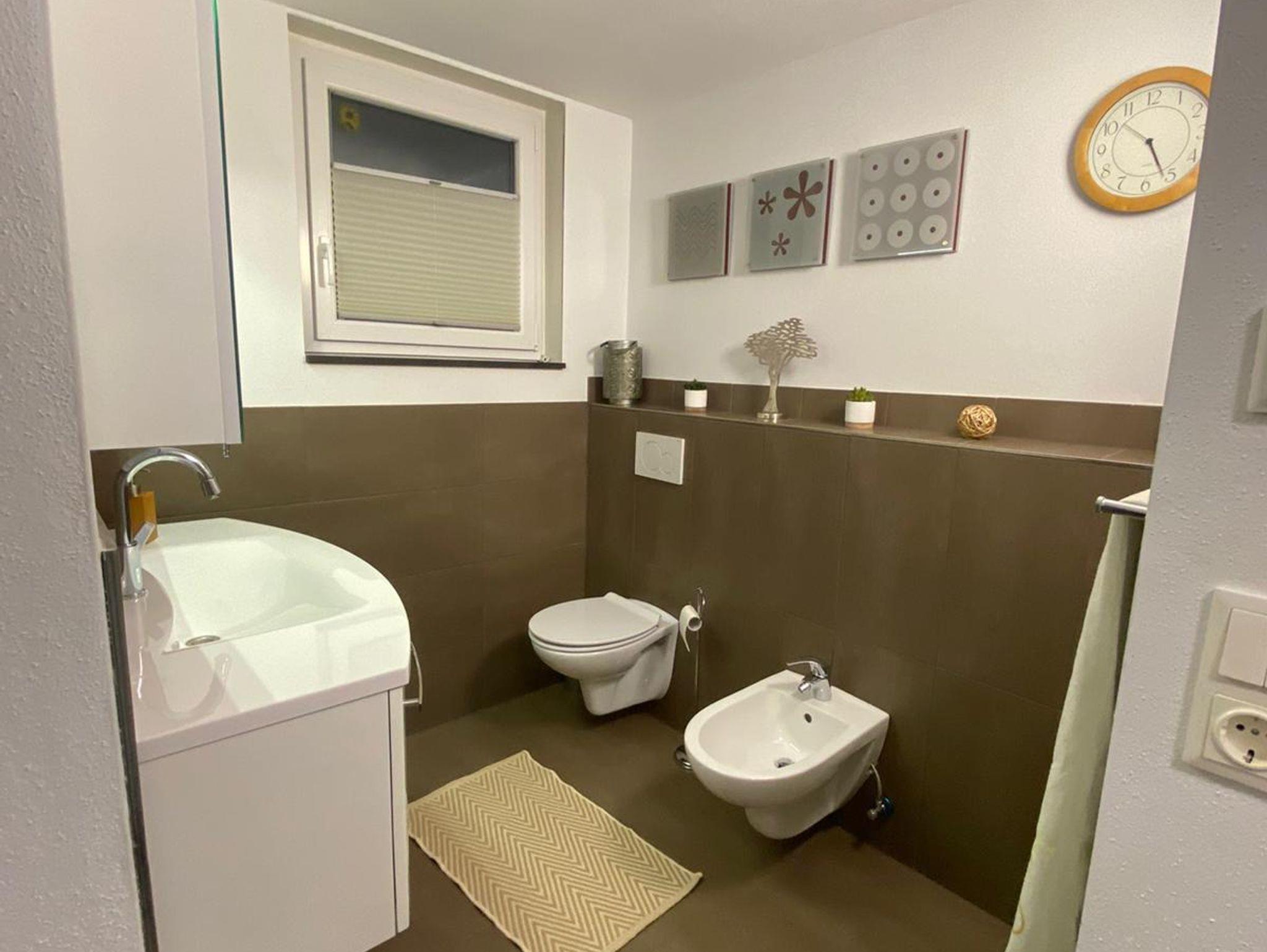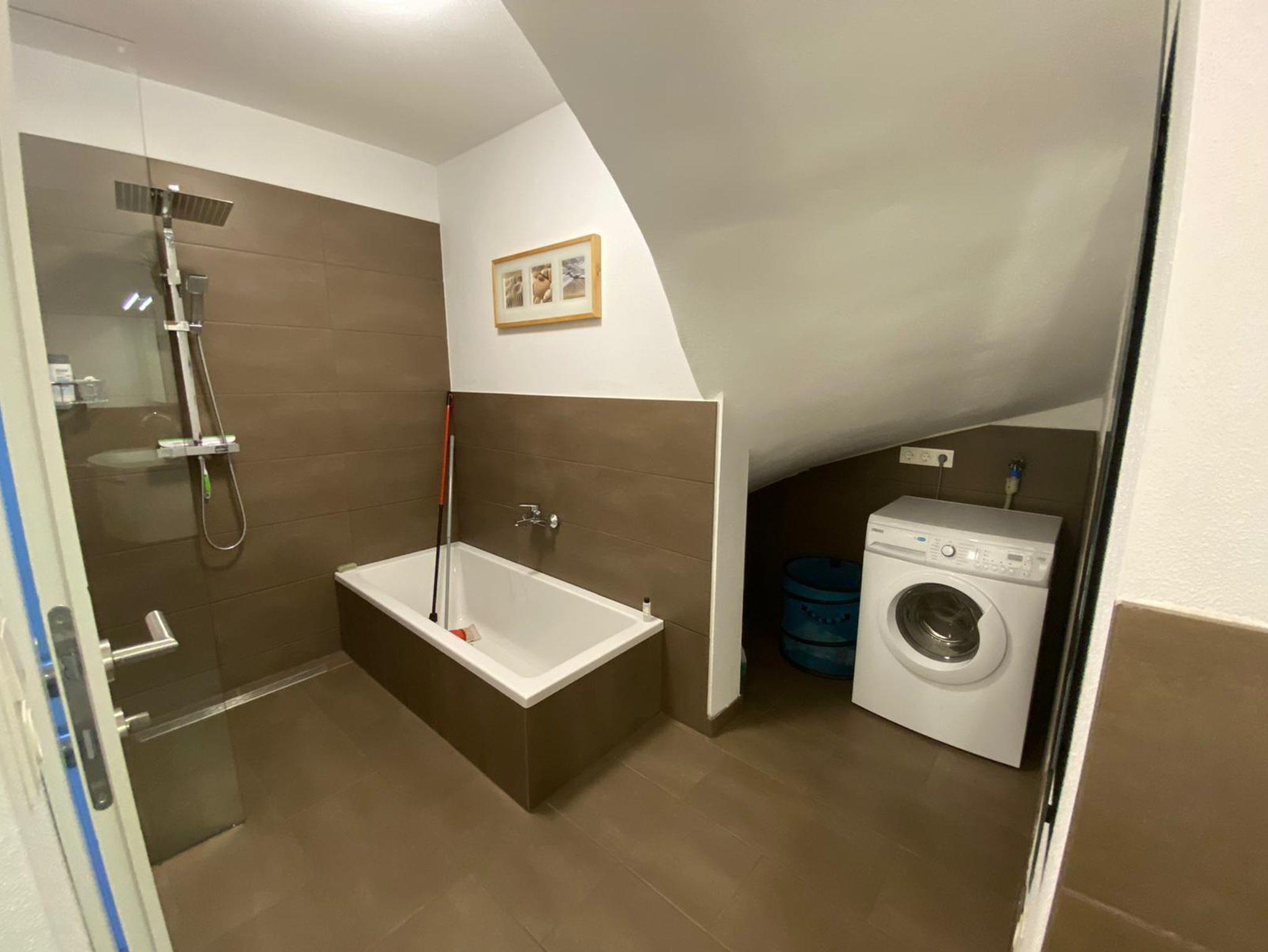 Im Badezimmer, welches mit einem WC, Waschbecken, Bidet, Dusche sowie Badewanne ausgestattet ist, steht zusätzlich eine Waschmaschine inkl. Wäscheständer, Bügeleisen und Bügelbrett zur freien Benutzung bereit.
