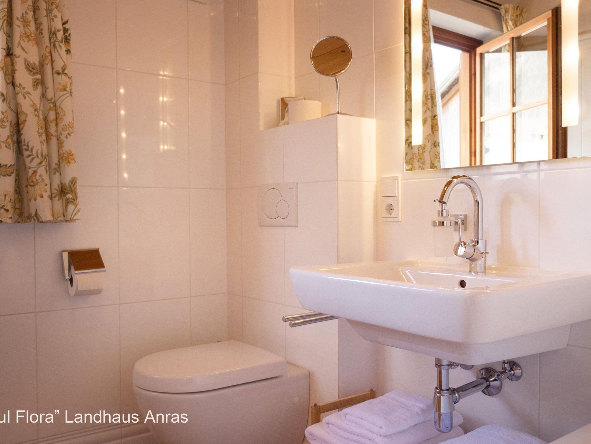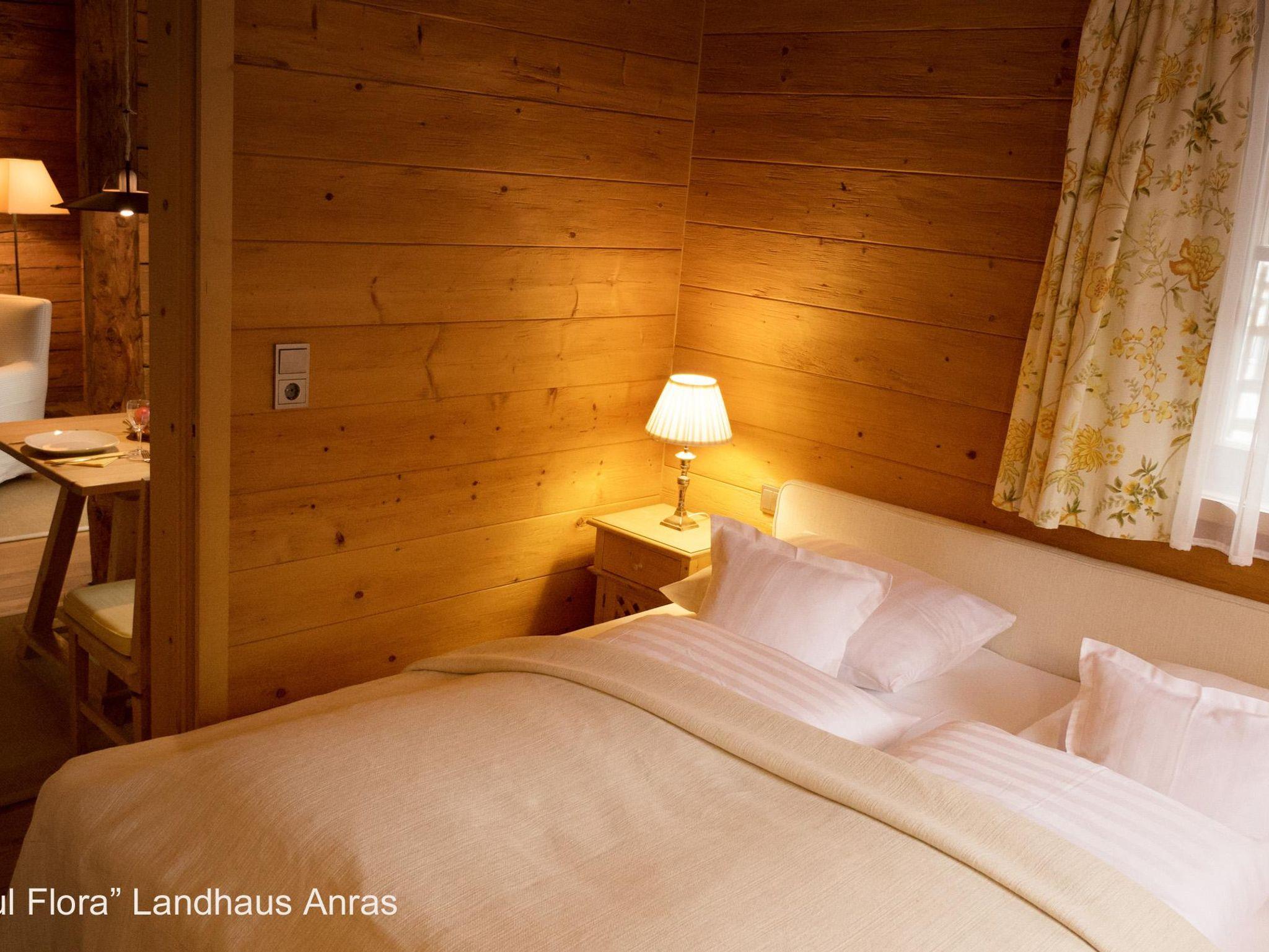 Besonders schön durch die handbehauene Holztäfelung und den Südbalkon mit Balkonmöbeln zum Entspannen in der Sonne, mit Blick auf das prachtvolle Schloss Anras. Doppelbett, Bad mit Wanne, komplette Küche. Ein zauberhaftes Wohlfühl-Appartment für Zwei