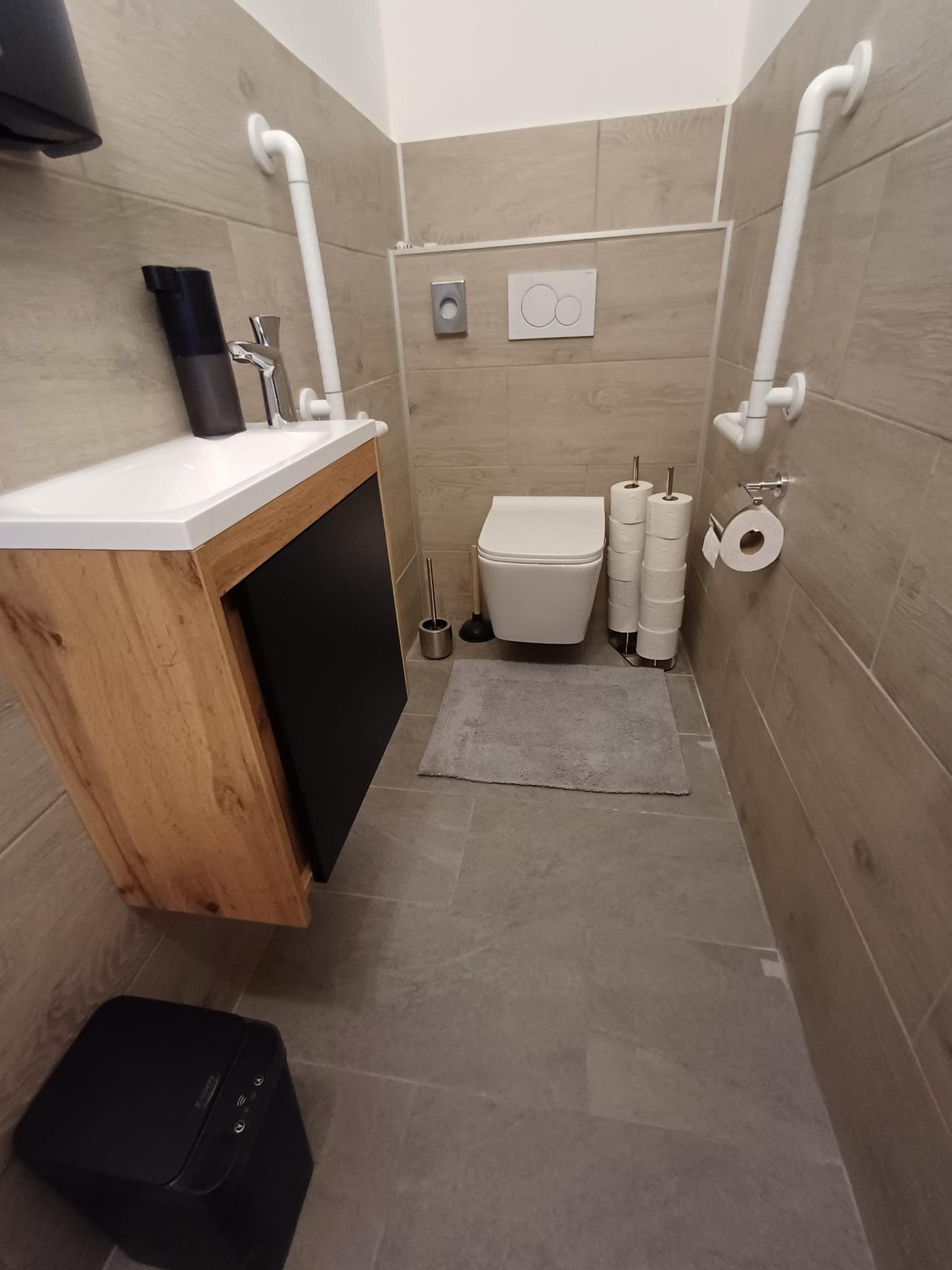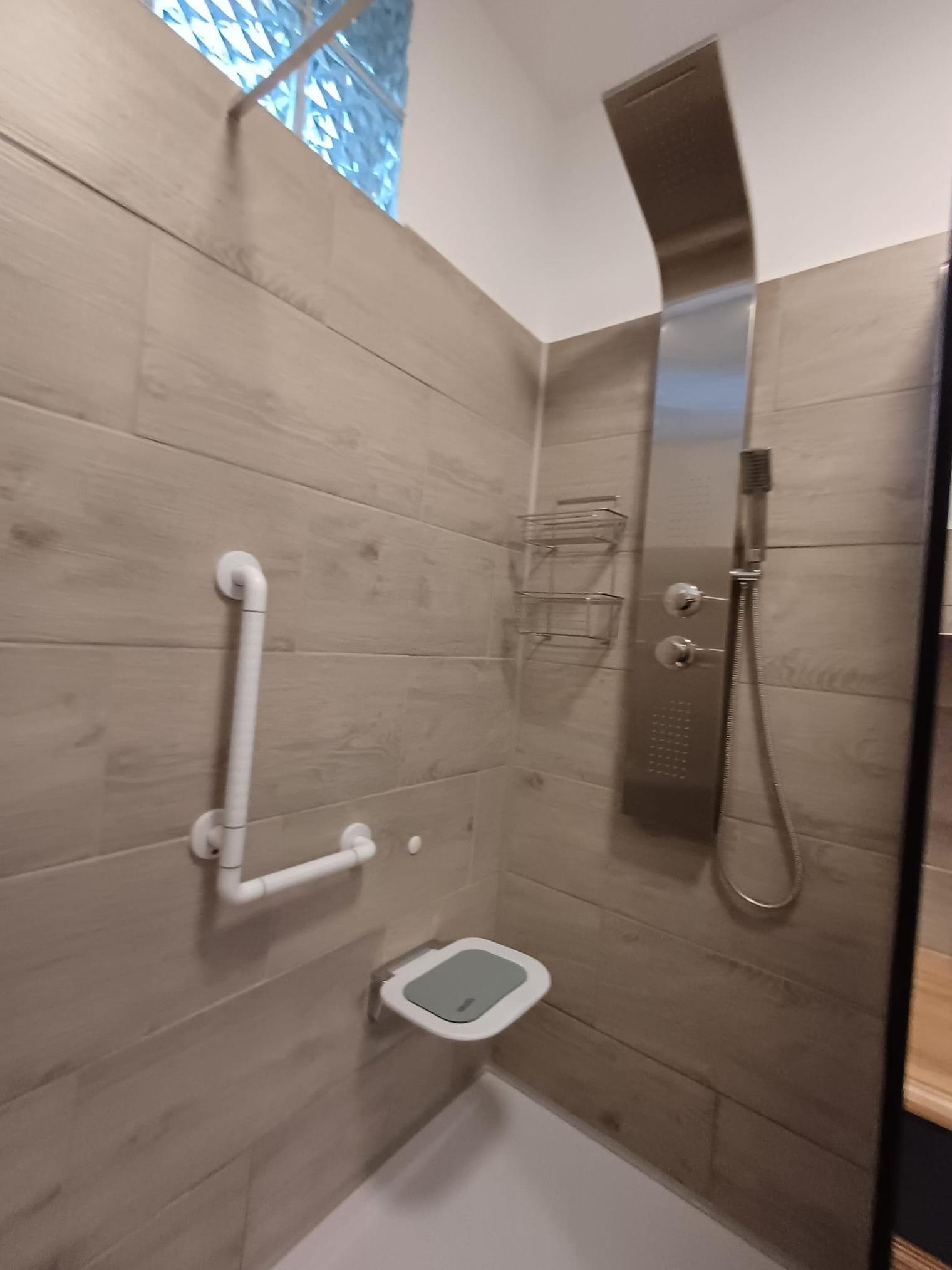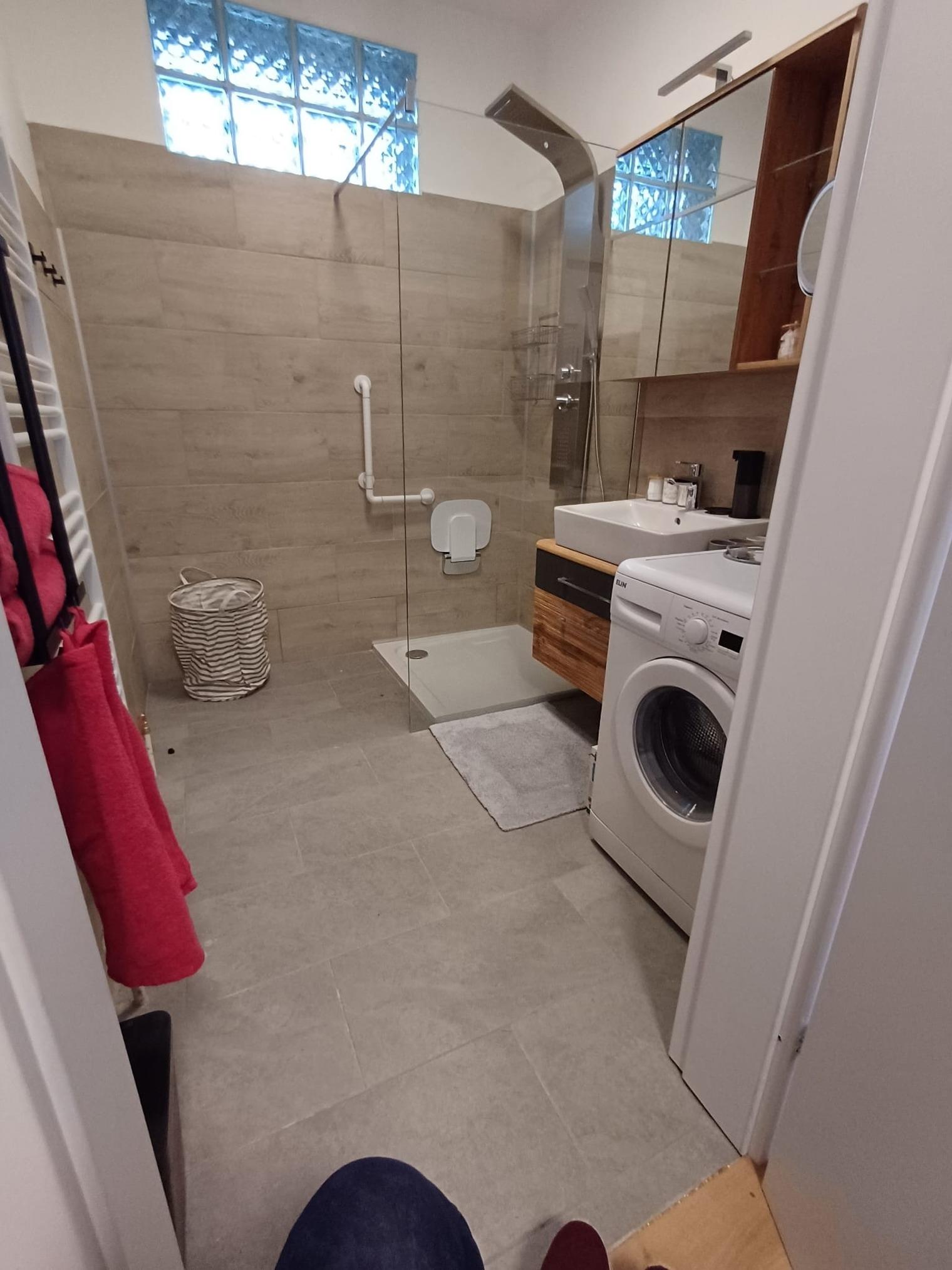Alle Wohnräume sind mit einem Rollstuhl befahrbar und Bad und WC verfügen über Haltegriffe, zusätzlich ist in der Dusche ein Duschsessel.