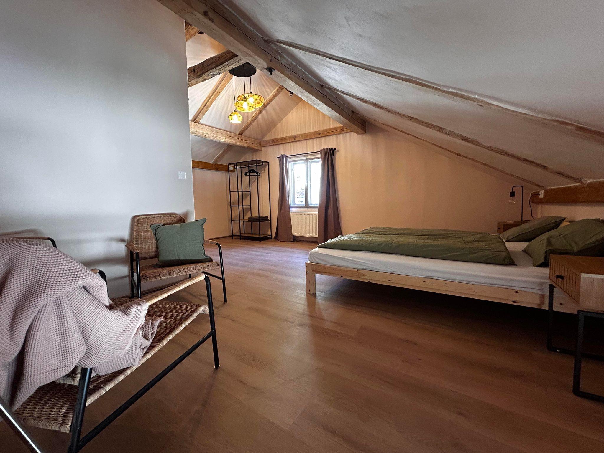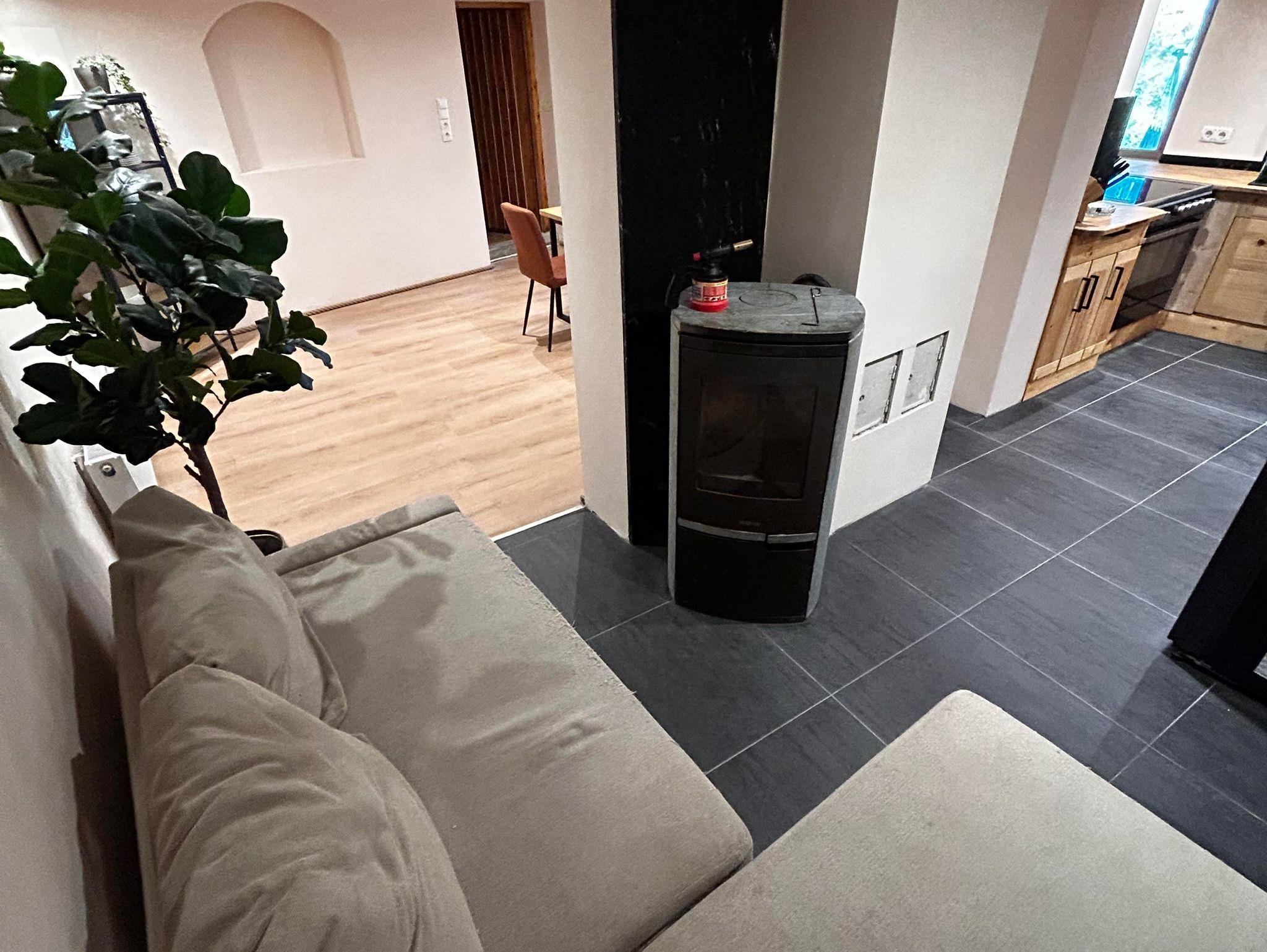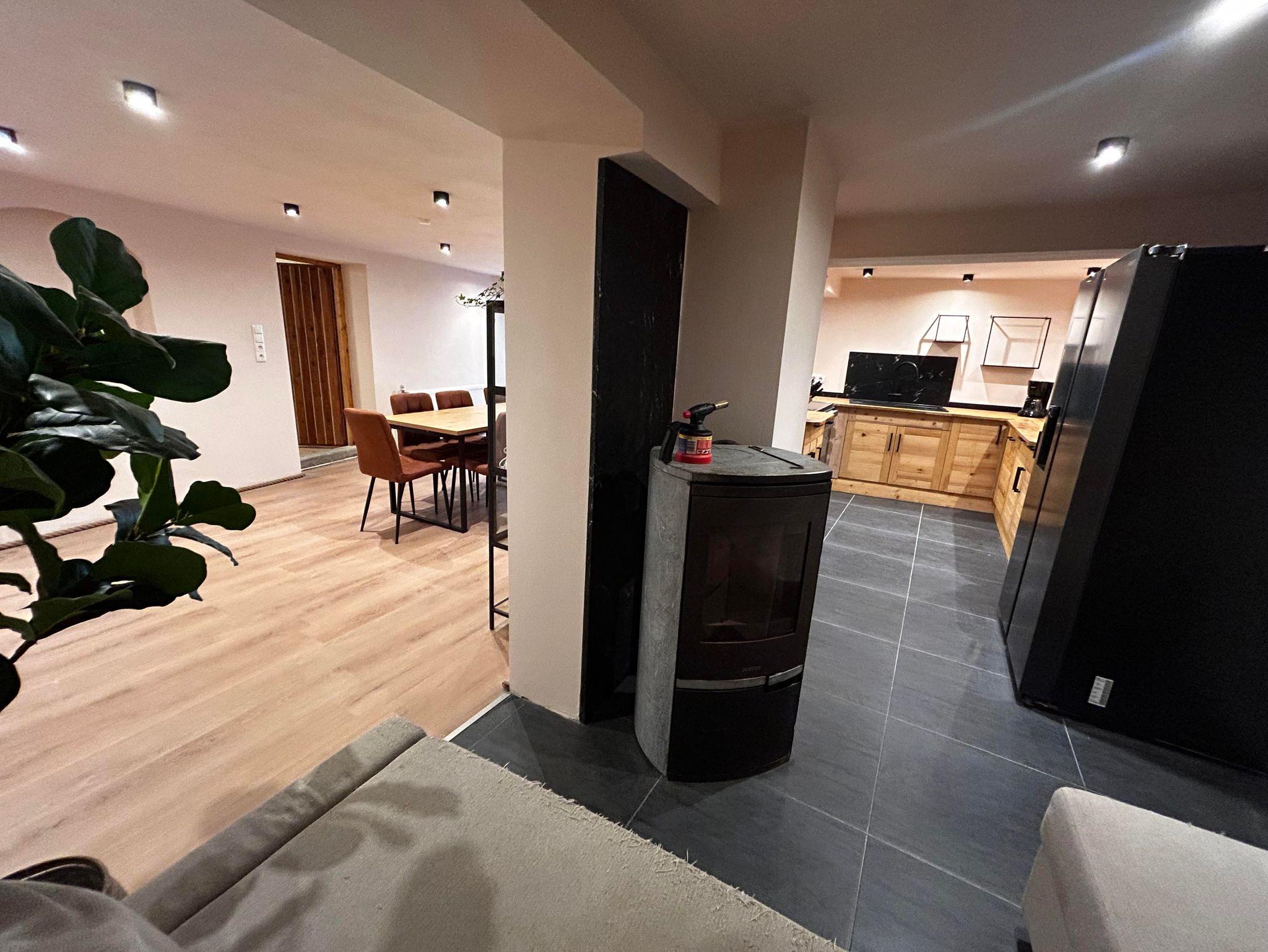 Im Mittelpunkt steht die große Wohnküche mit komplett ausgestatteter Küche, amerikanischem Kühlschrank, großem Ofen und 5-Platten-Herd. Der Esstisch bietet Platz für 10 Personen, die Sitzecke mit Holzofen lädt zum Aufwärmen und Erzählen ein.