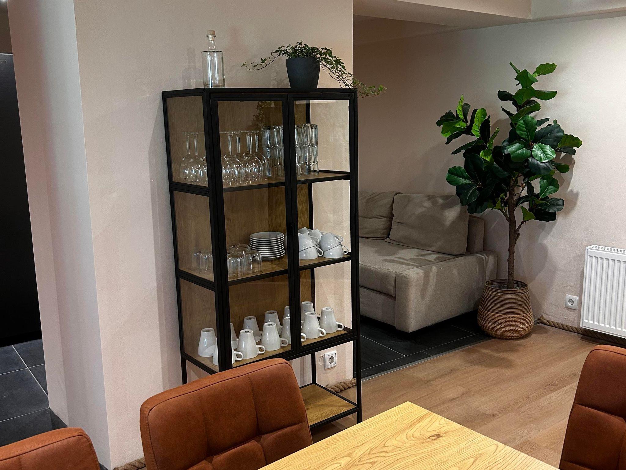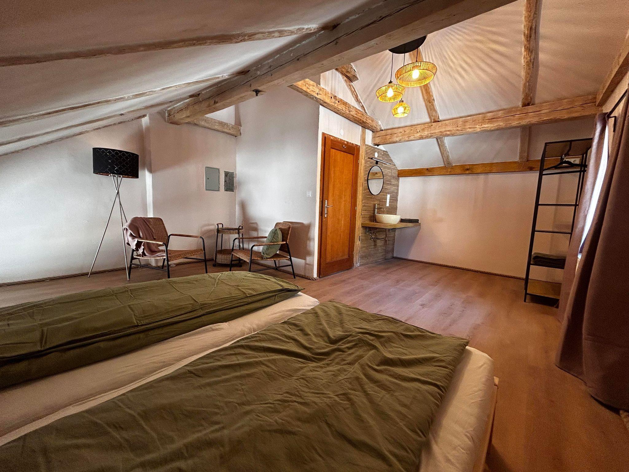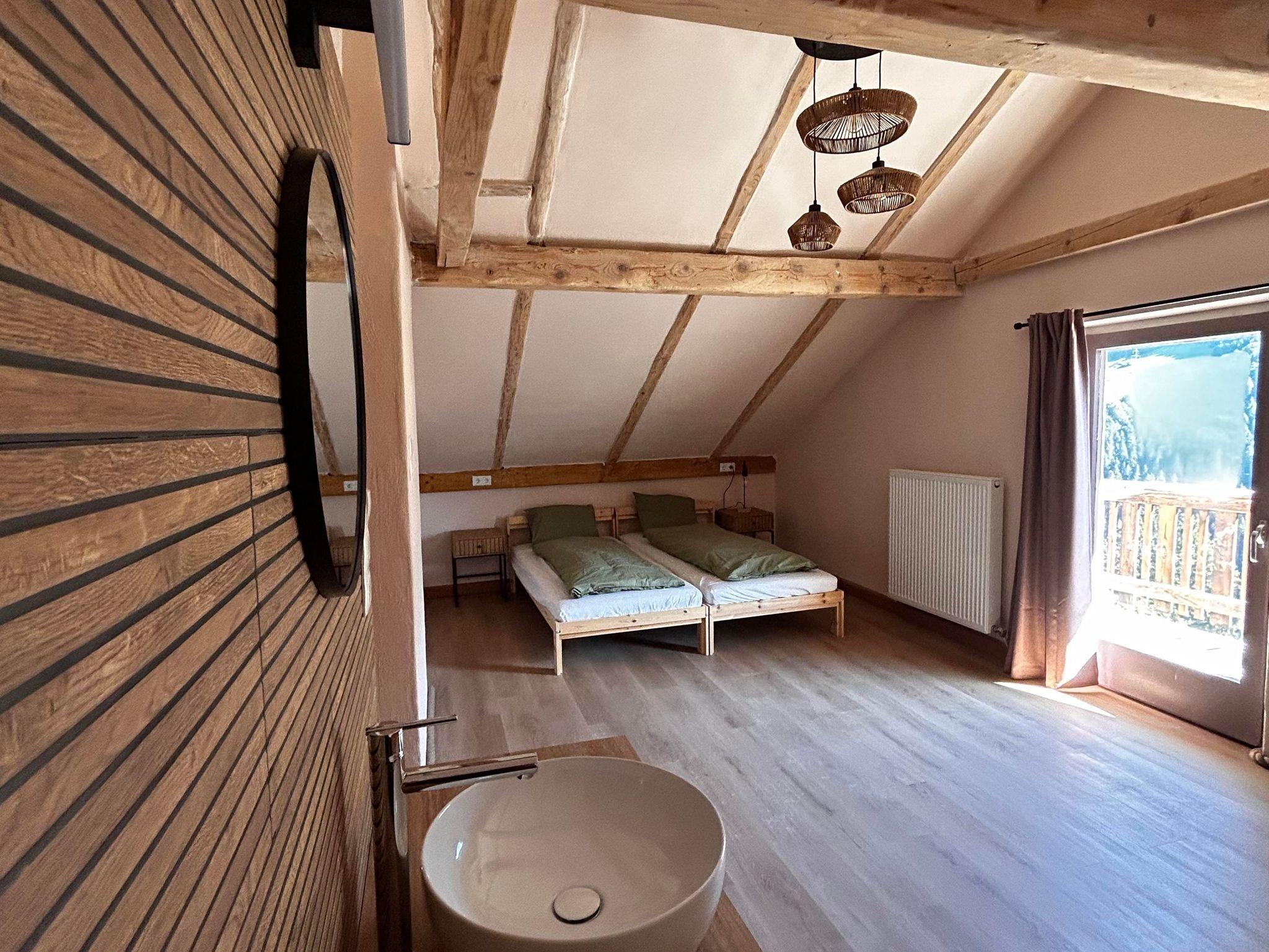 Im Mittelpunkt steht die große Wohnküche mit komplett ausgestatteter Küche, amerikanischem Kühlschrank, großem Ofen und 5-Platten-Herd. Der Esstisch bietet Platz für 10 Personen, die Sitzecke mit Holzofen lädt zum Aufwärmen und Erzählen ein.