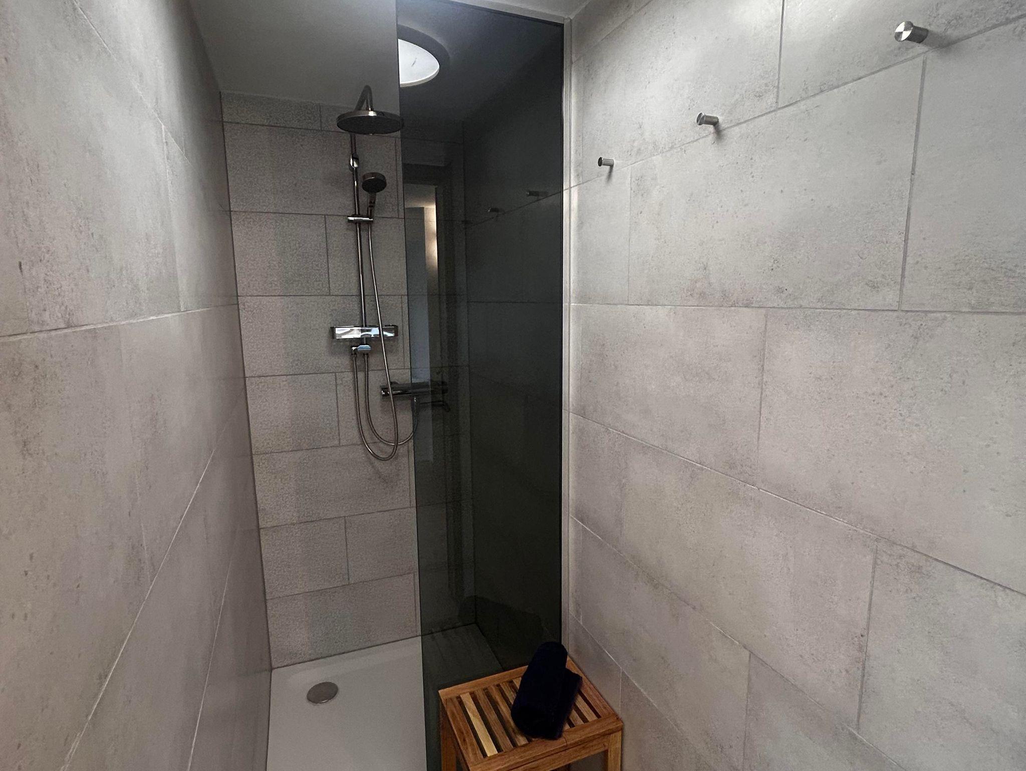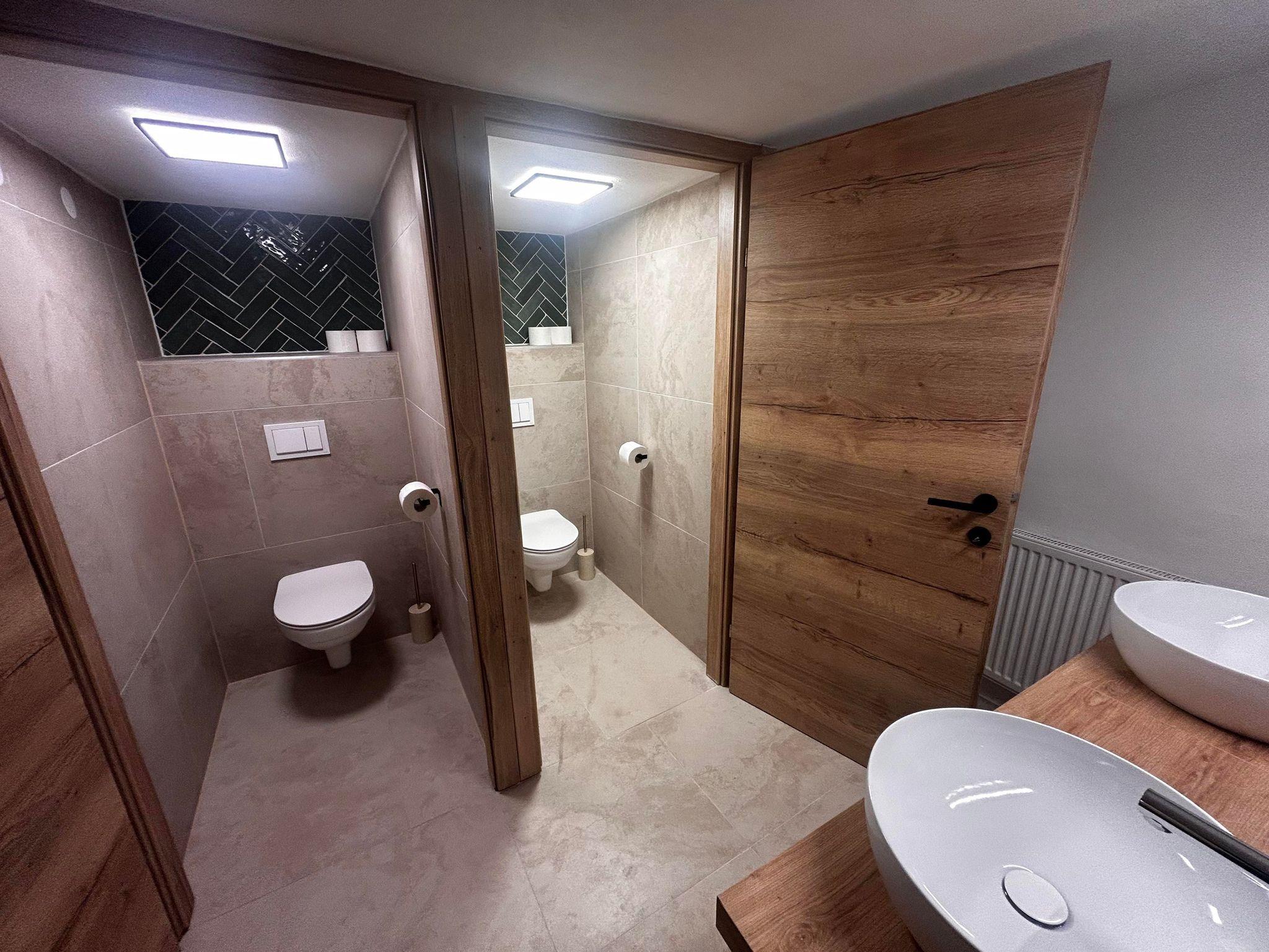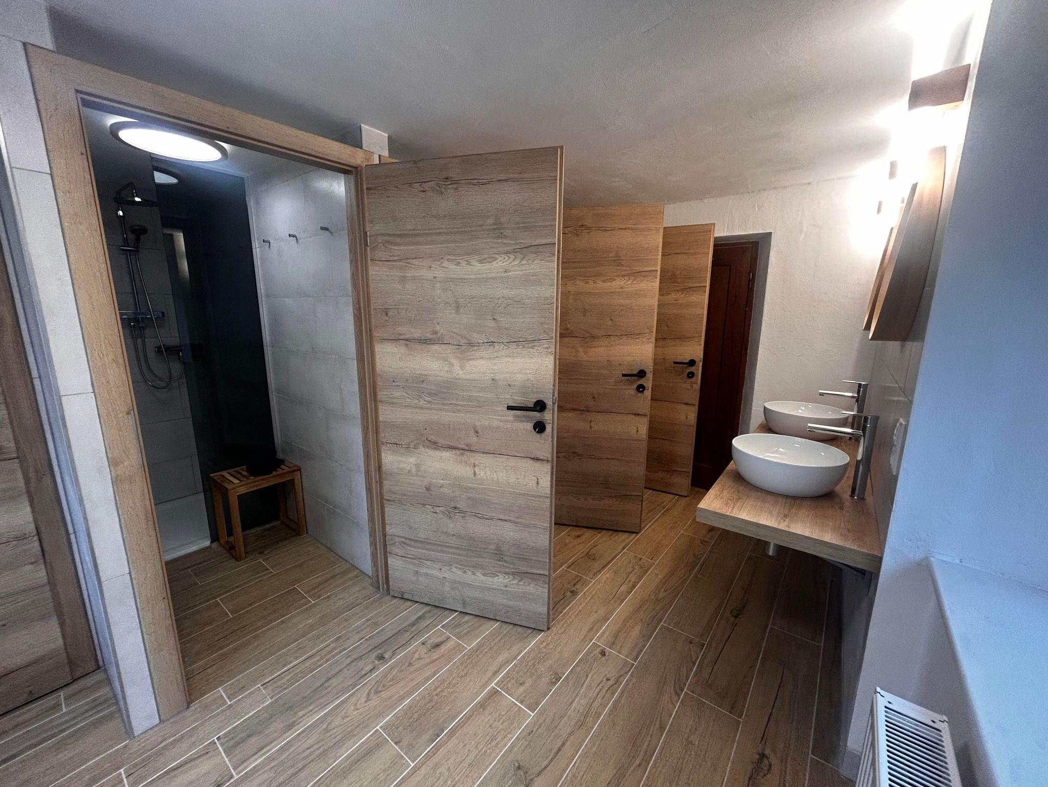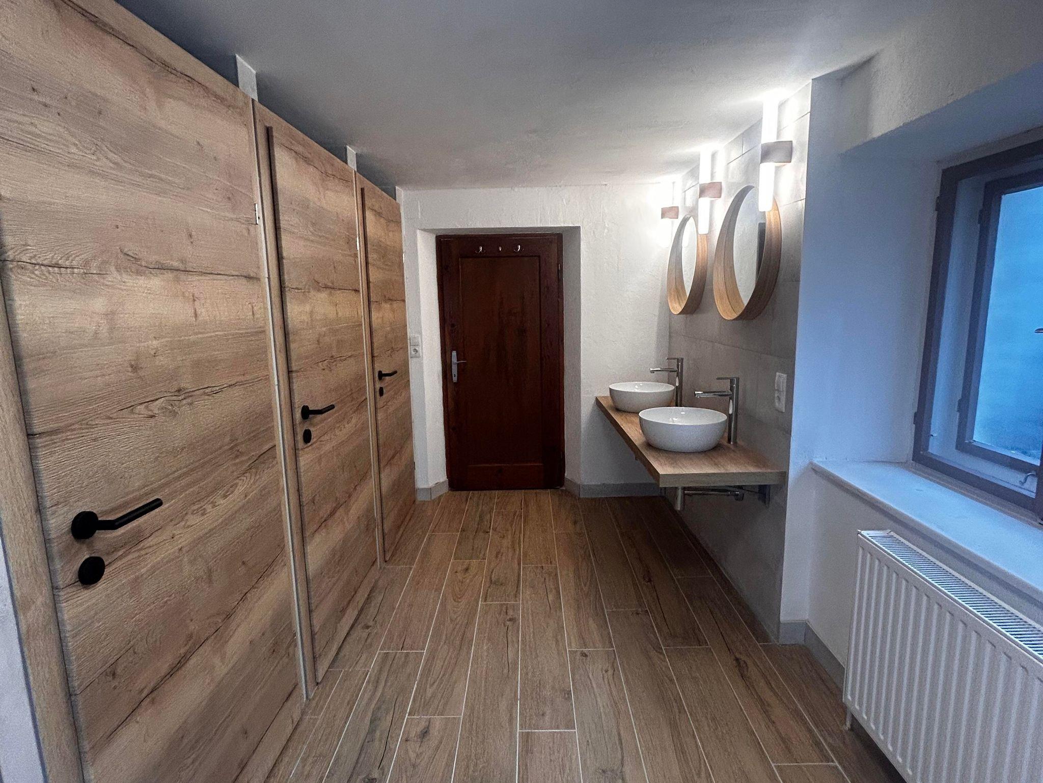 Im Erdgeschoss befindet sich ein Duschbereich mit drei Kabinen und zwei Waschbecken. Zwei Toiletten liegen im Untergeschoss (in einem separaten Raum neben der Wohnküche), eine weitere im Obergeschoss. Für längere Aufenthalte gibt es auf Anfrage eine Waschmaschine mit Trocknerfunktion.