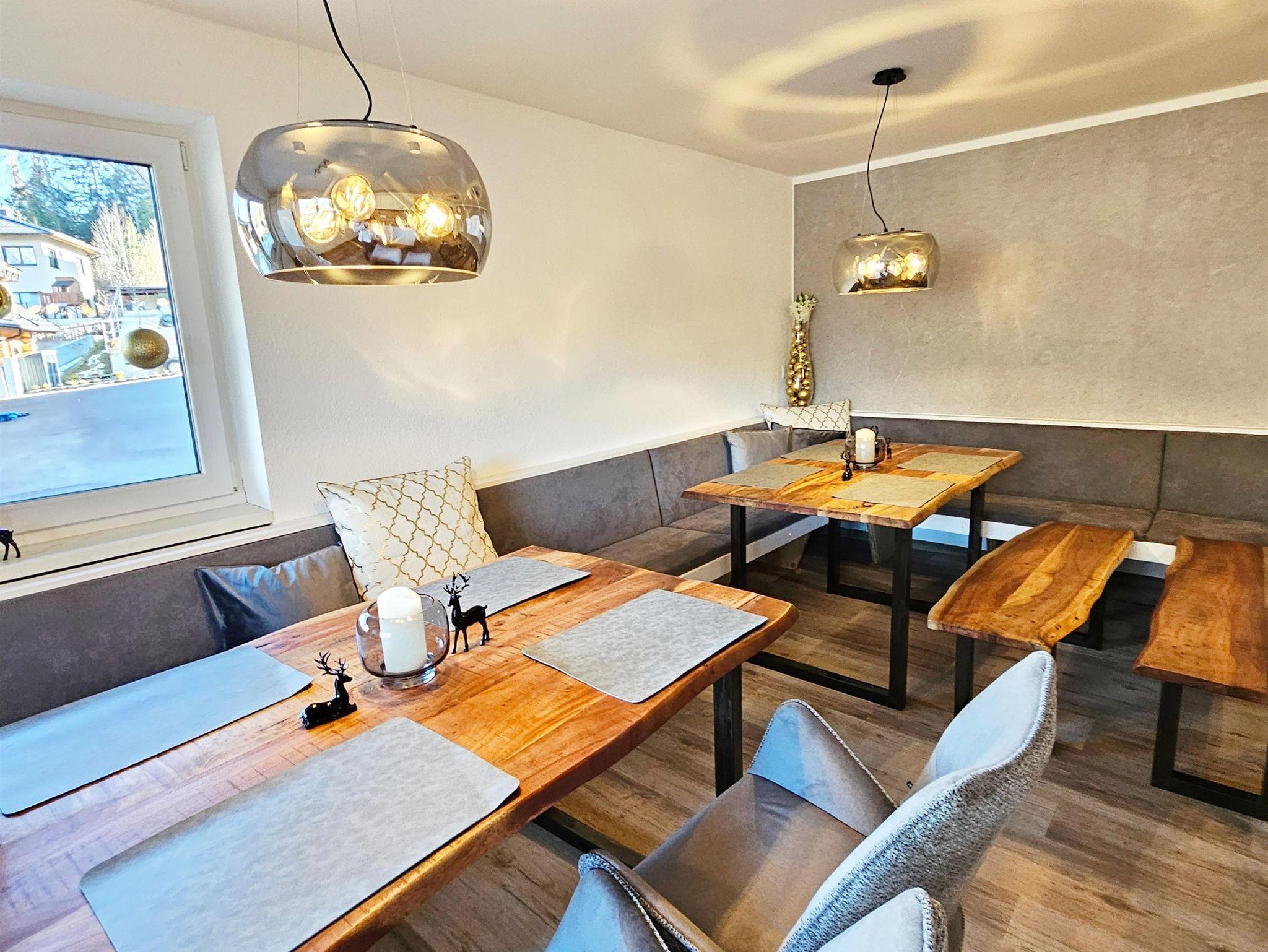 Privater Außenbereich mit Tisch, Stühlen und stimmungsvoller Beleuchtung – perfekt für den Abend mit Blick in die Berge