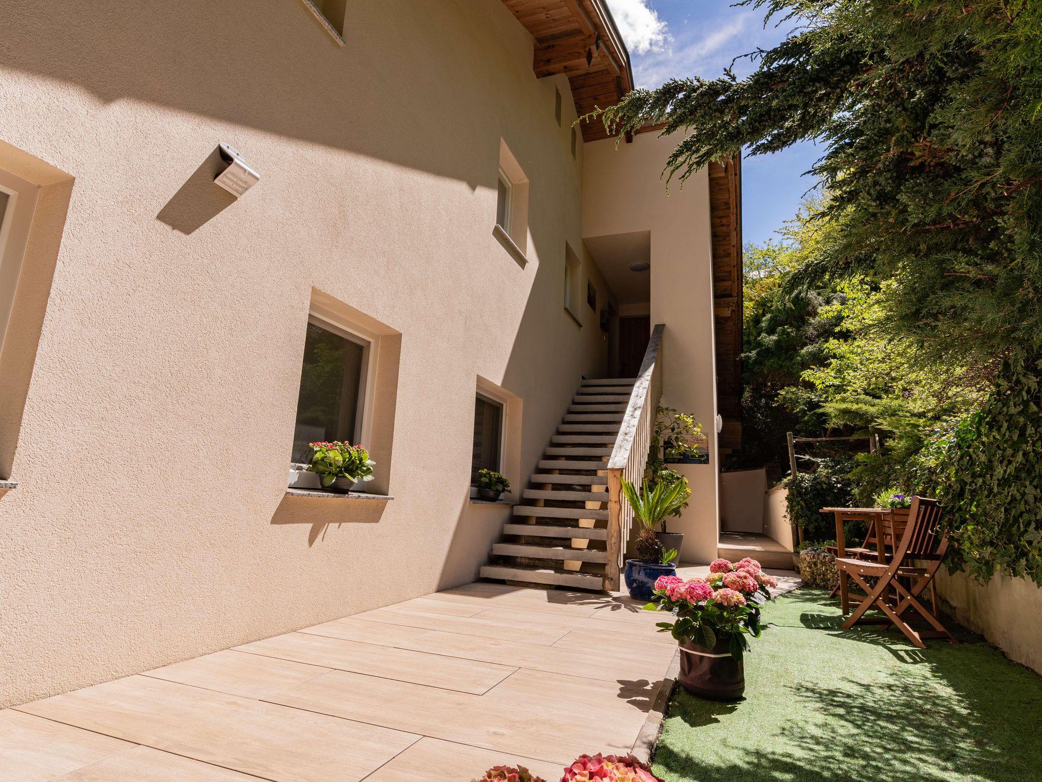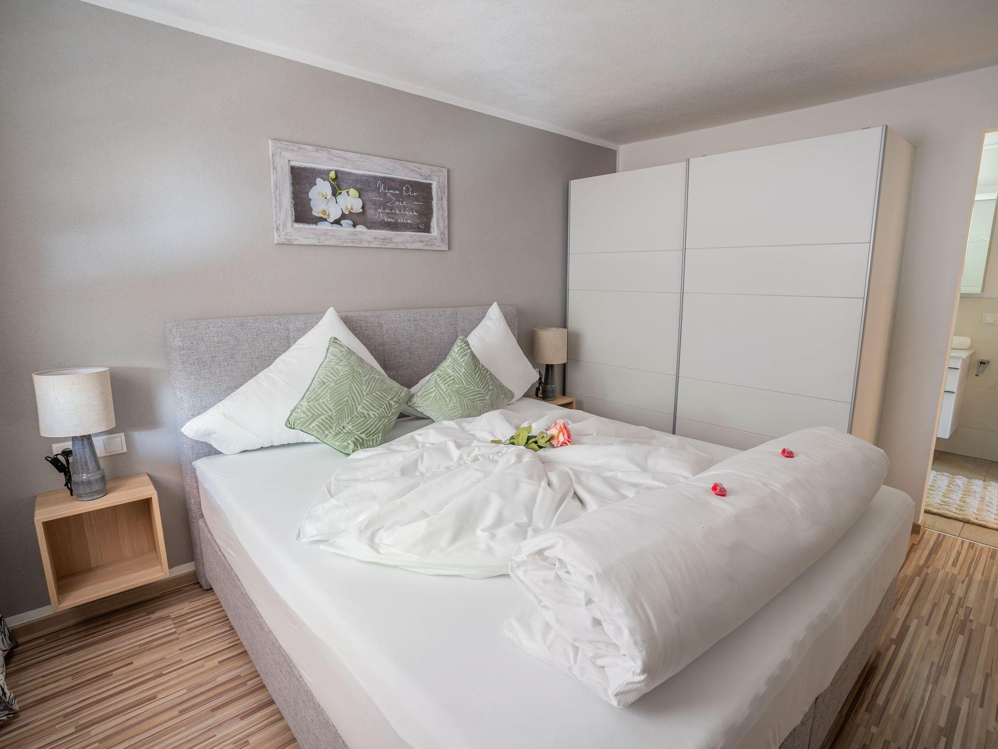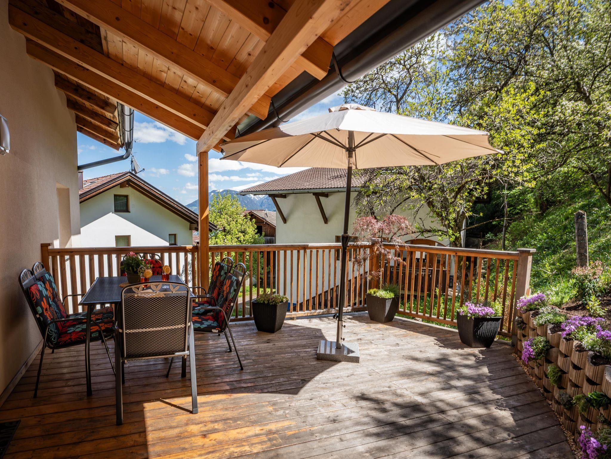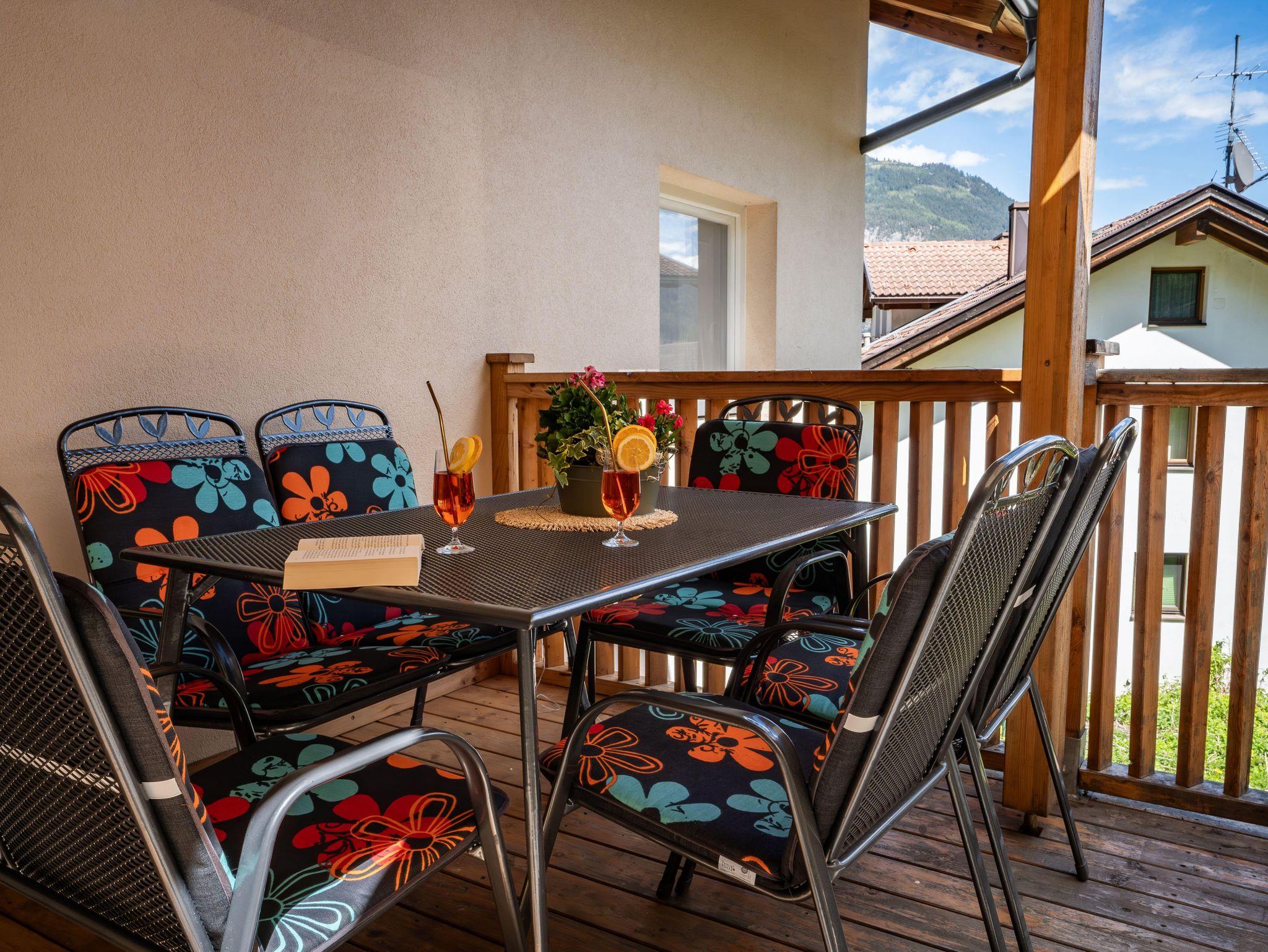 Das Appartement Orchidee bietet auf 54 m² Platz für bis zu 6 Personen. Es befindet sich im 1. Stock und verfügt über ein Schlafzimmer mit Doppelbett und weitere Schlafmöglichkeiten im Wohnzimmer und Vorraum mit jeweils einer ausziehbaren Couch. Die Küche ist komplett ausgestattet und bietet eine große Terrasse mit Essbereich und Blick auf die Berge.