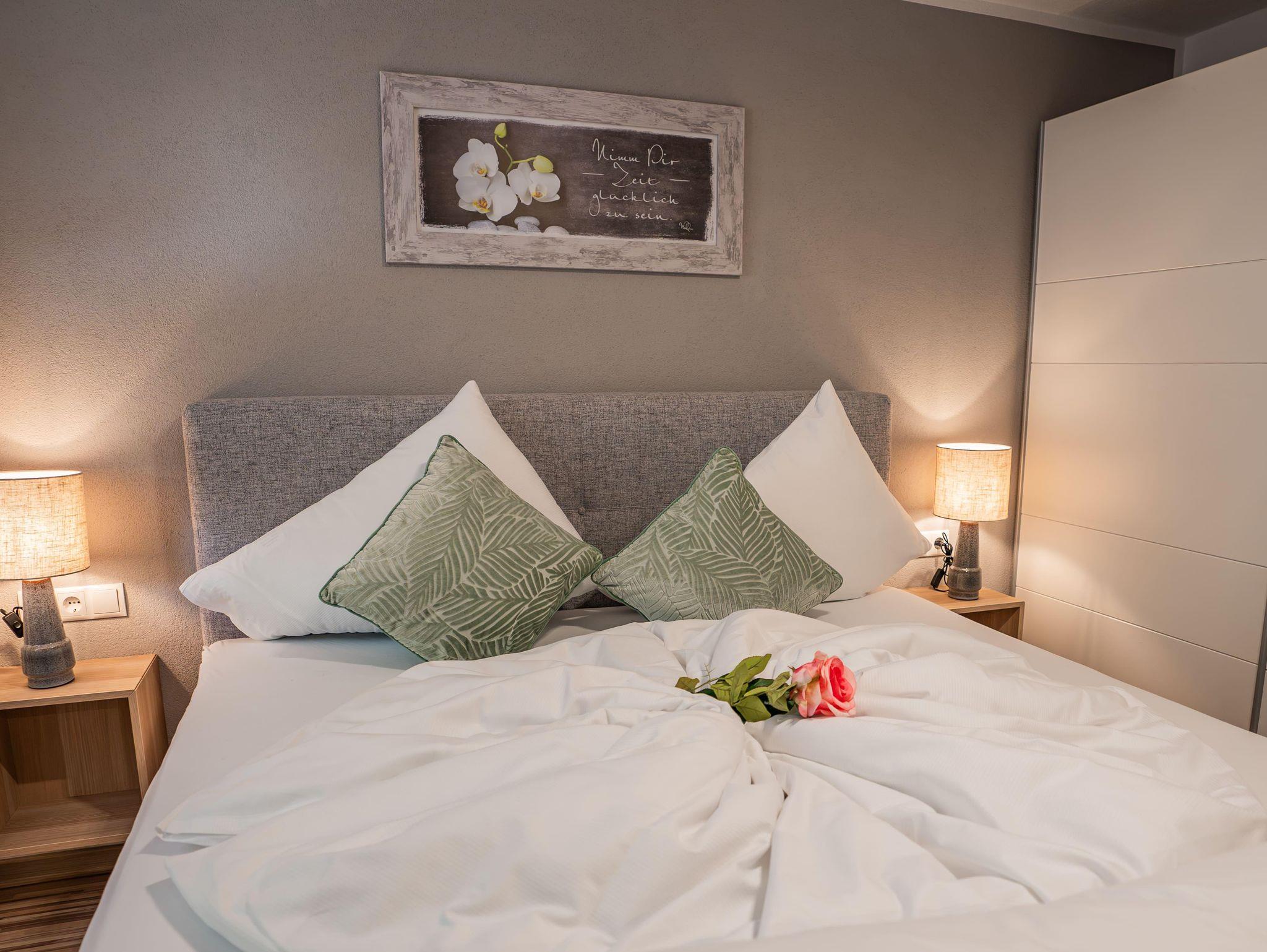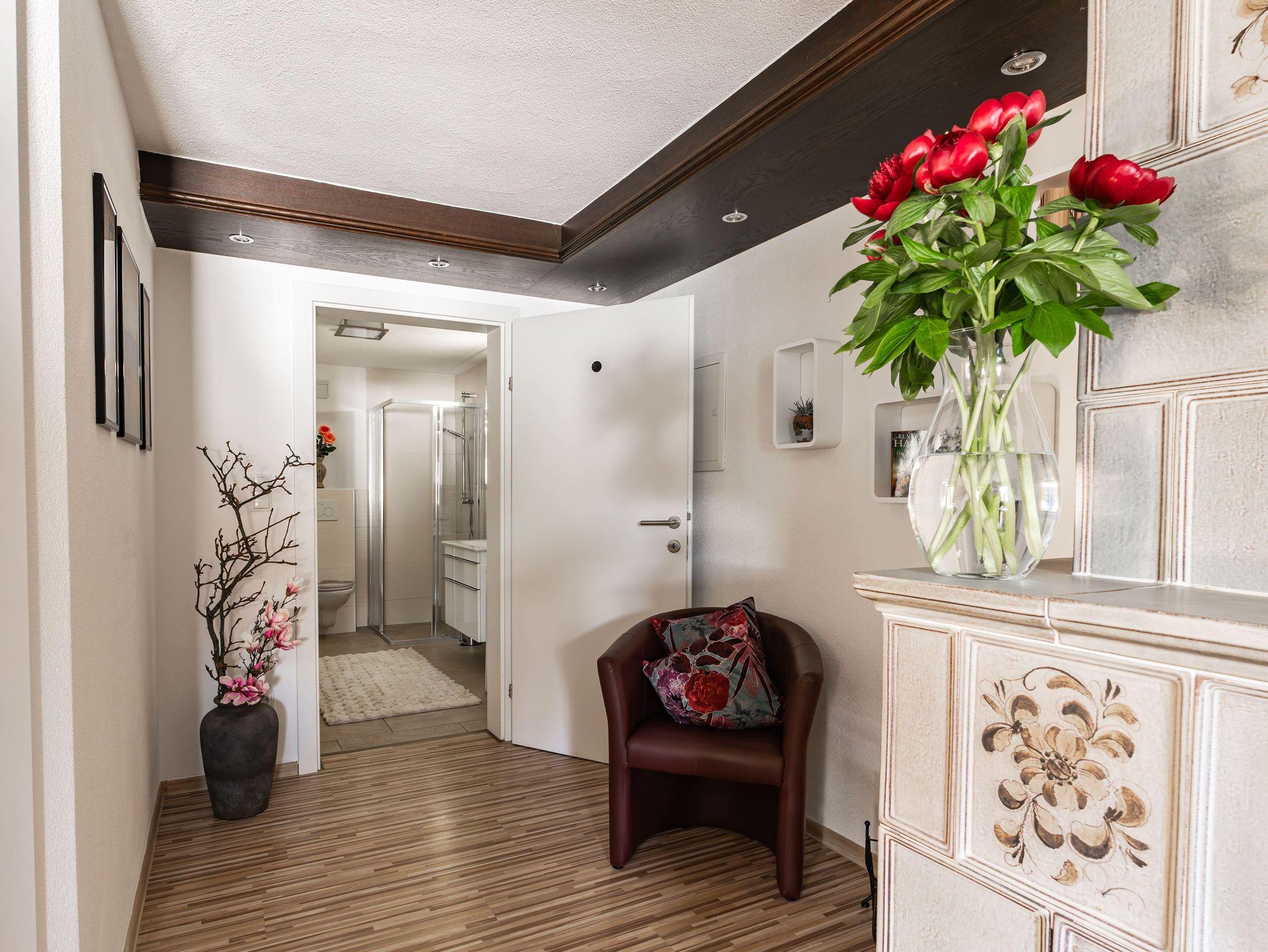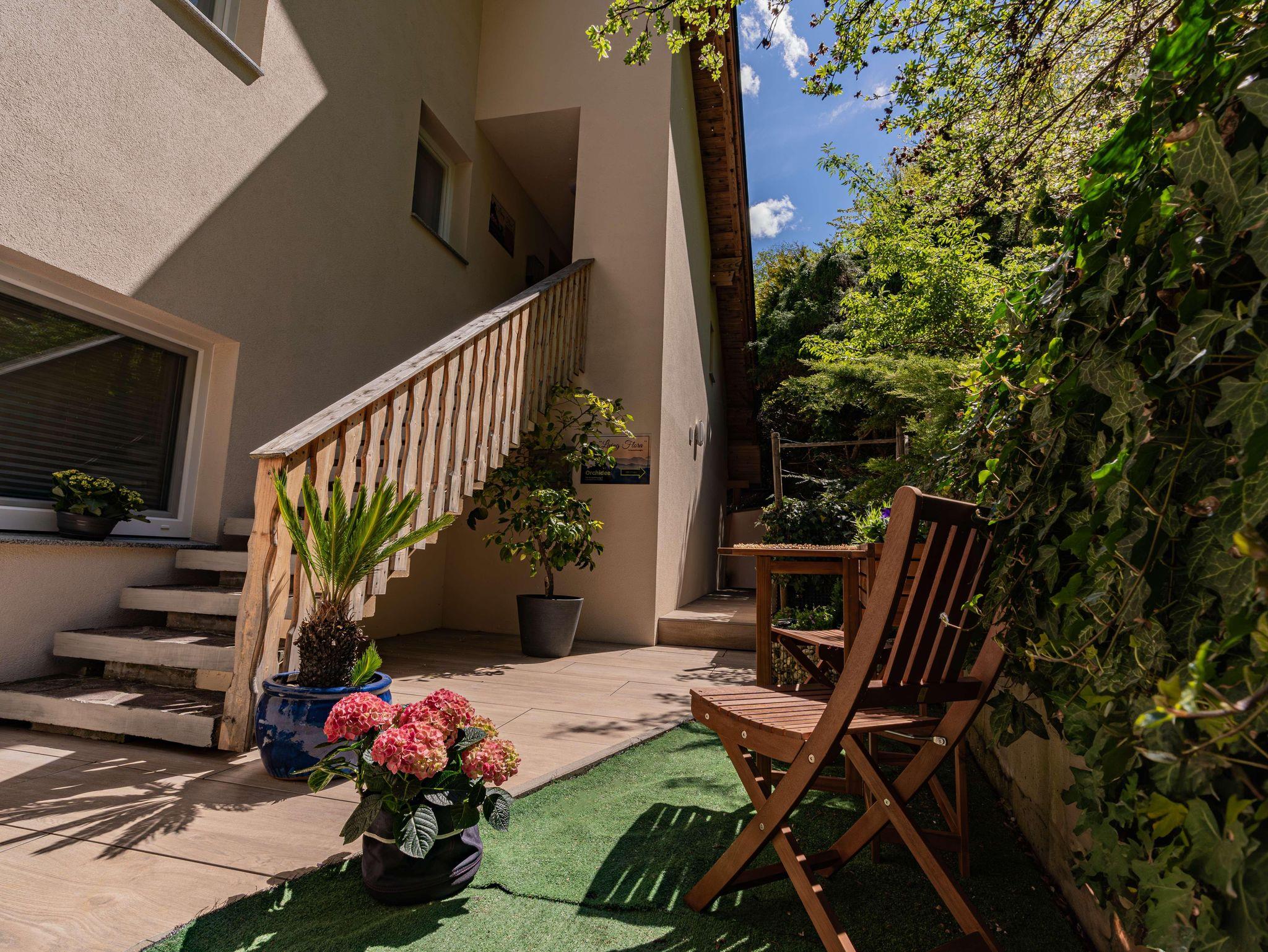 Das Appartement Orchidee bietet auf 54 m² Platz für bis zu 6 Personen. Es befindet sich im 1. Stock und verfügt über ein Schlafzimmer mit Doppelbett und weitere Schlafmöglichkeiten im Wohnzimmer und Vorraum mit jeweils einer ausziehbaren Couch. Die Küche ist komplett ausgestattet und bietet eine große Terrasse mit Essbereich und Blick auf die Berge.