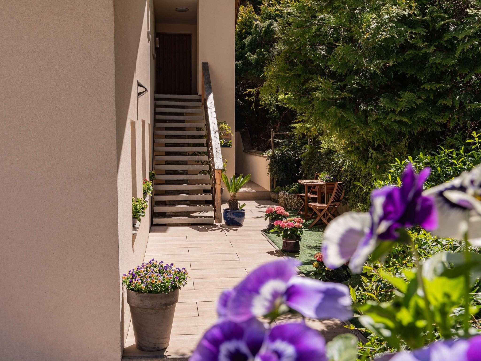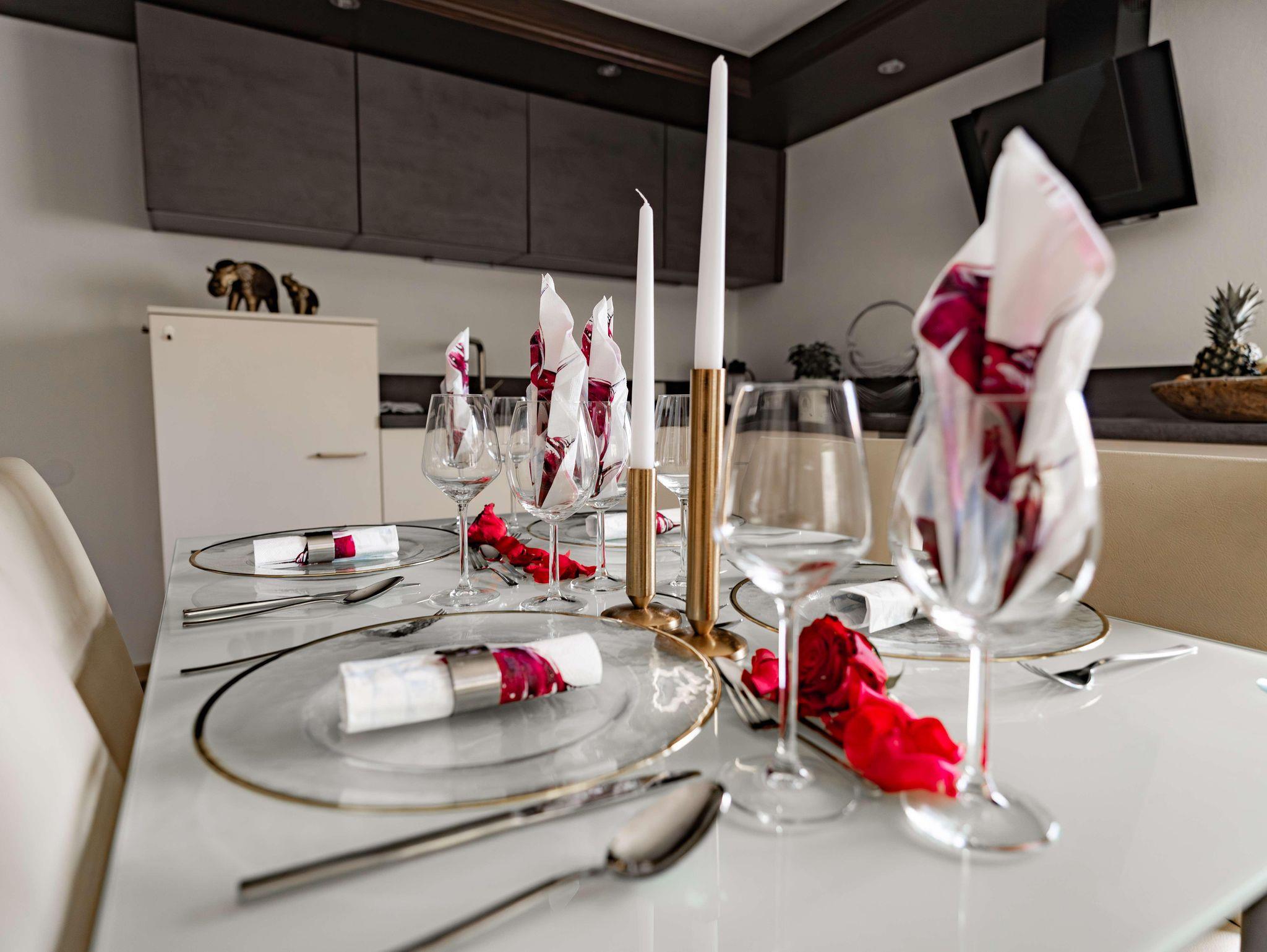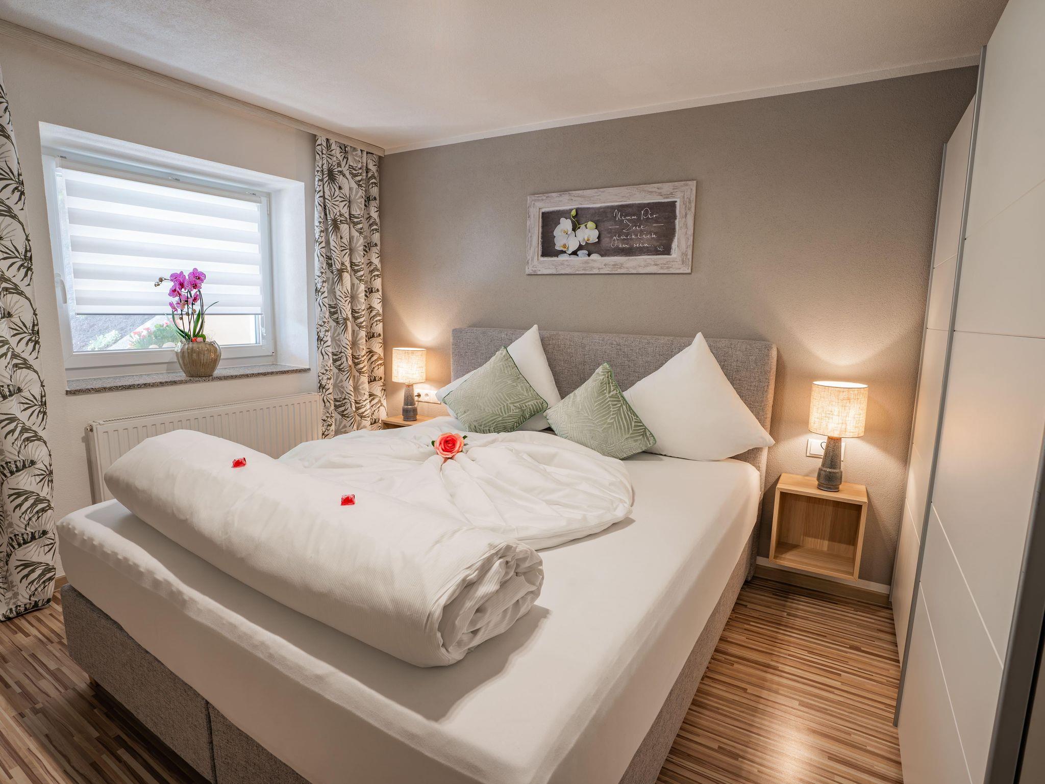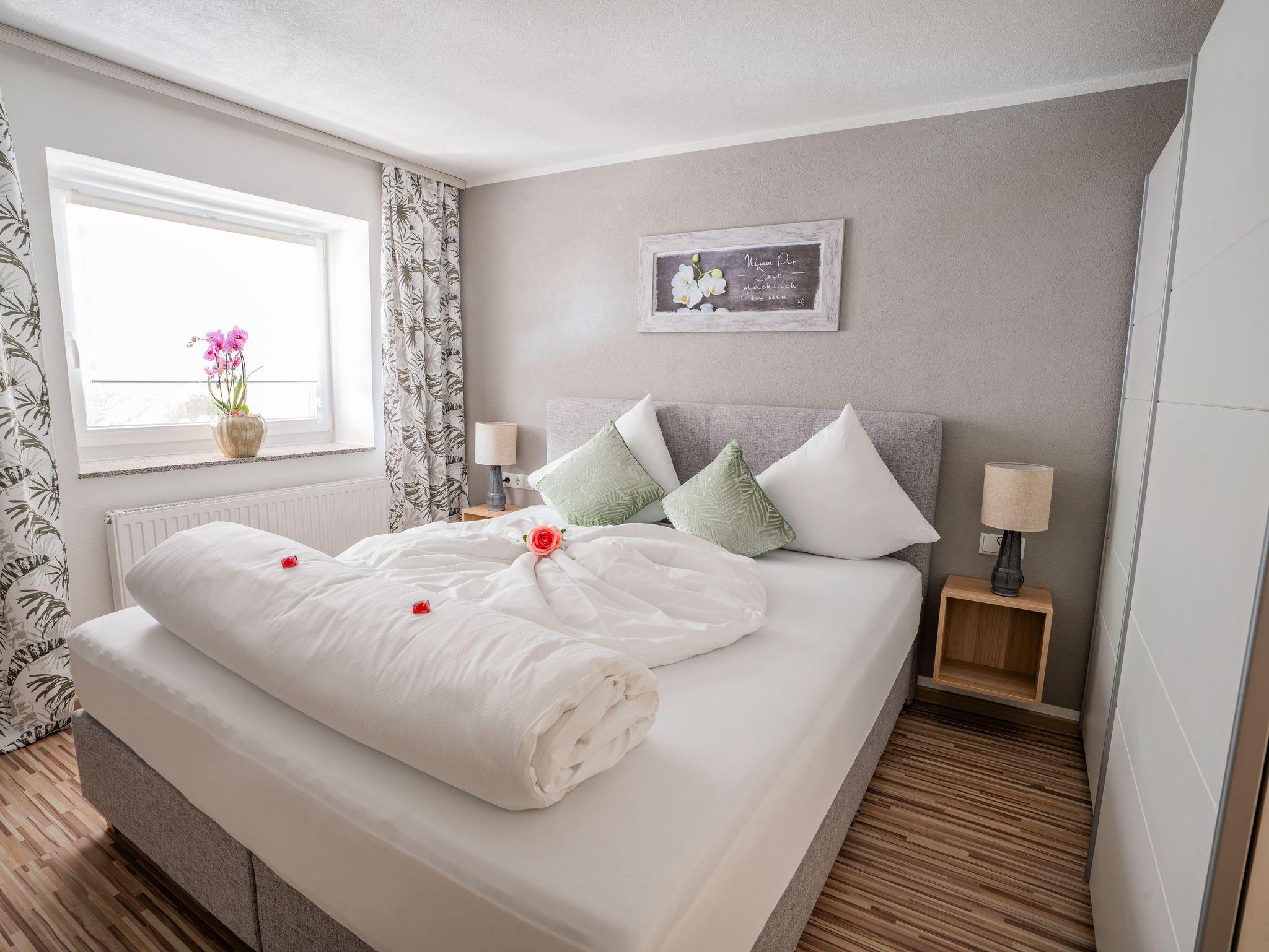 Das Appartement Orchidee bietet auf 54 m² Platz für bis zu 6 Personen. Es befindet sich im 1. Stock und verfügt über ein Schlafzimmer mit Doppelbett und weitere Schlafmöglichkeiten im Wohnzimmer und Vorraum mit jeweils einer ausziehbaren Couch. Die Küche ist komplett ausgestattet und bietet eine große Terrasse mit Essbereich und Blick auf die Berge.
