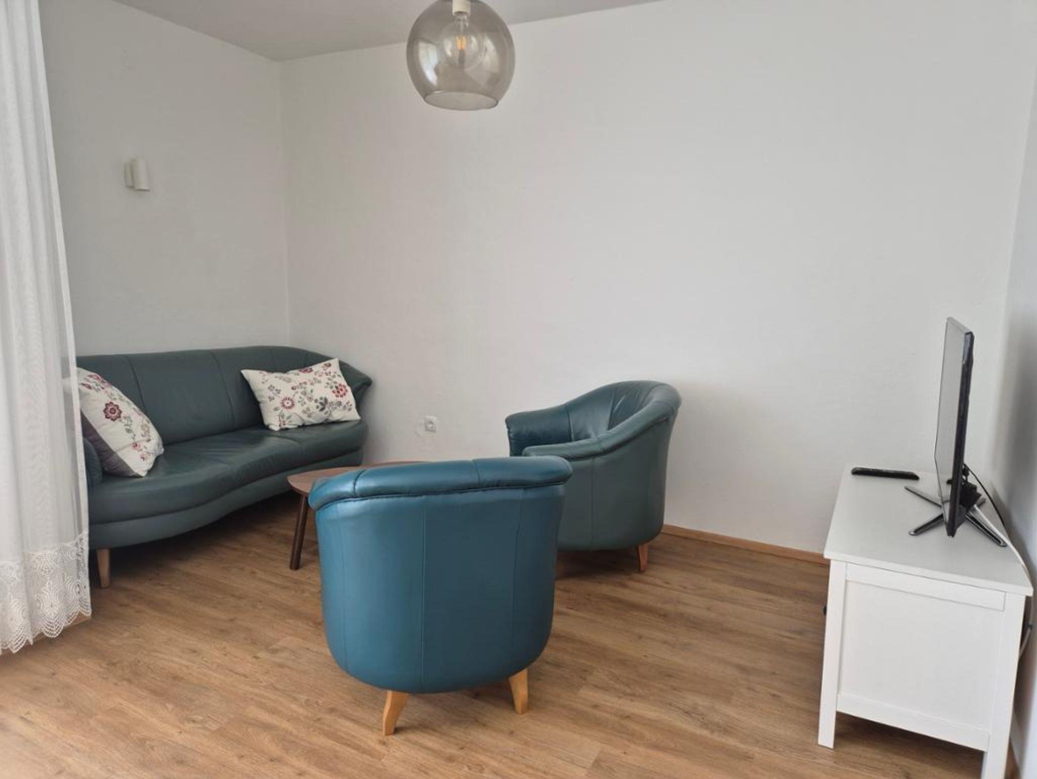 Vorzimmer, WC, Küche (E-Herd, Geschirrspüler, Kühlschrank, Kaffeemaschine, Essbereich), Wohnzimmer (Sofa, Essbereich, Fernseher), Terrasse