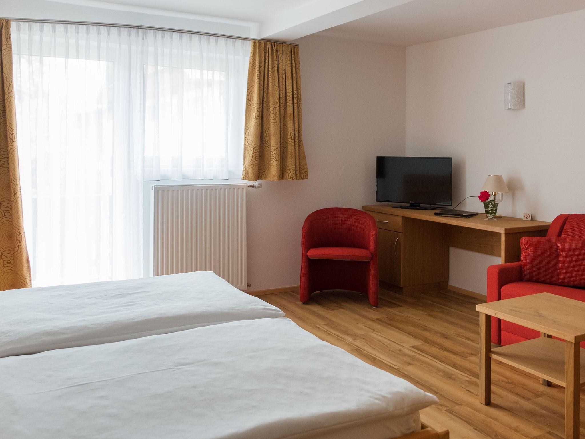Hell eingerichtetes Doppelzimmer mit Holzmöbel, teils ohne Teppichboden, mit Dusche/WC, TV, WLAN, Safe und Haarfön. Balkon mit Dorfblick zum Kastaniengarten, Mittagssonne. Dieser Zimmertyp verfügt über eine ausziehbare Couch für Kinder - nur auf Anfrage möglich.