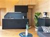 Im Erdgeschoss befindet sich in dem modern ausgestatteten Wohnbereich eine Küchenzeile, ein Esstisch mit Stühlen, ein TV, sowie eine gemütliche Couch. Am Panoramafenster kannst du es dir auf der Sitzbank gemütlich machen.