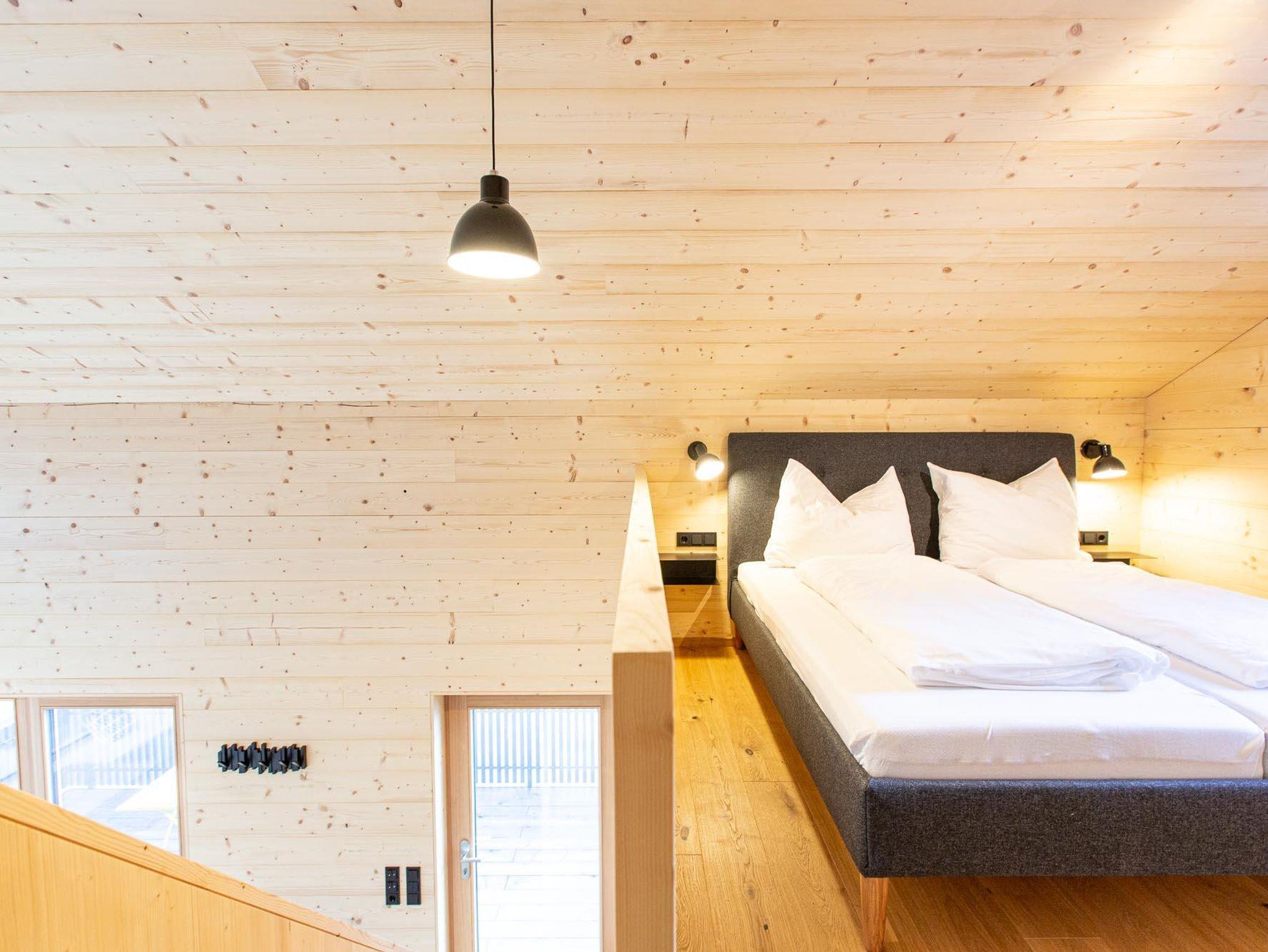 Im Obergeschoss befindet sich eine offene Galerie mit Doppelbett – ein Schlafplatz mit Fenster und Blick auf Natur und Berge.