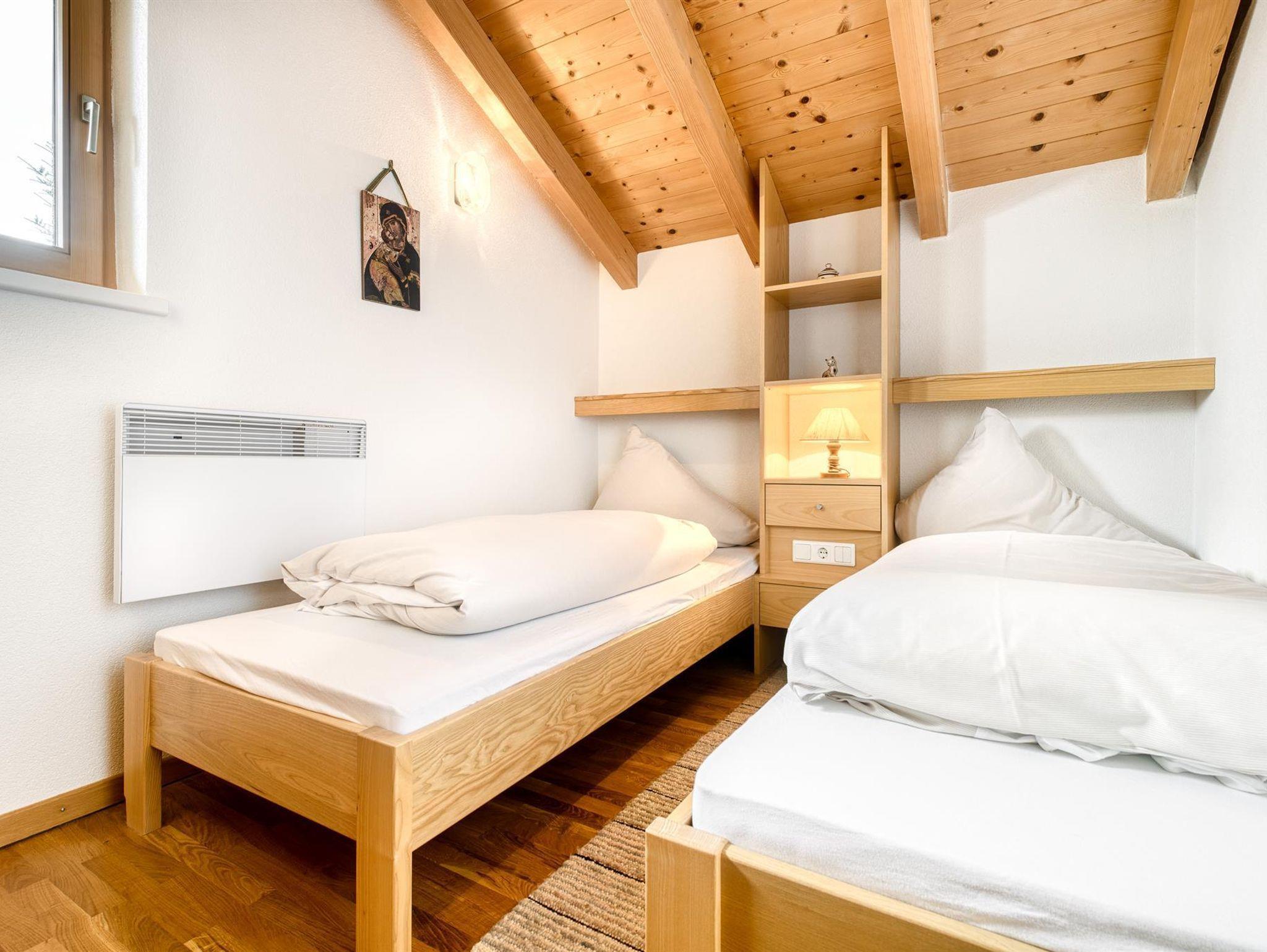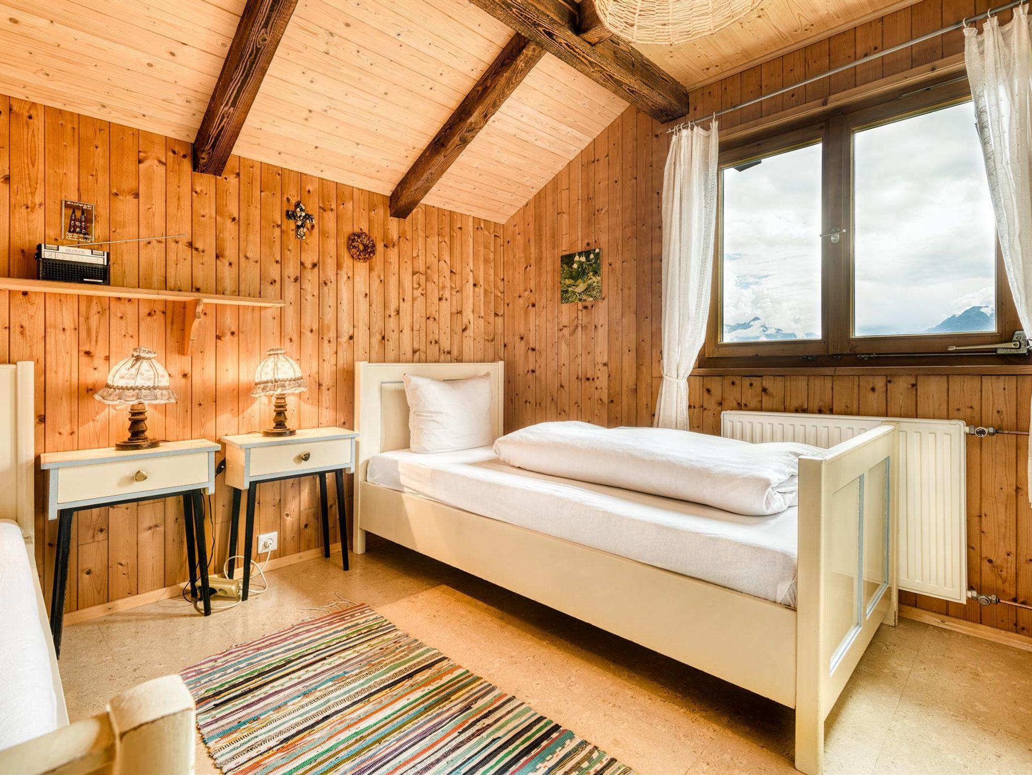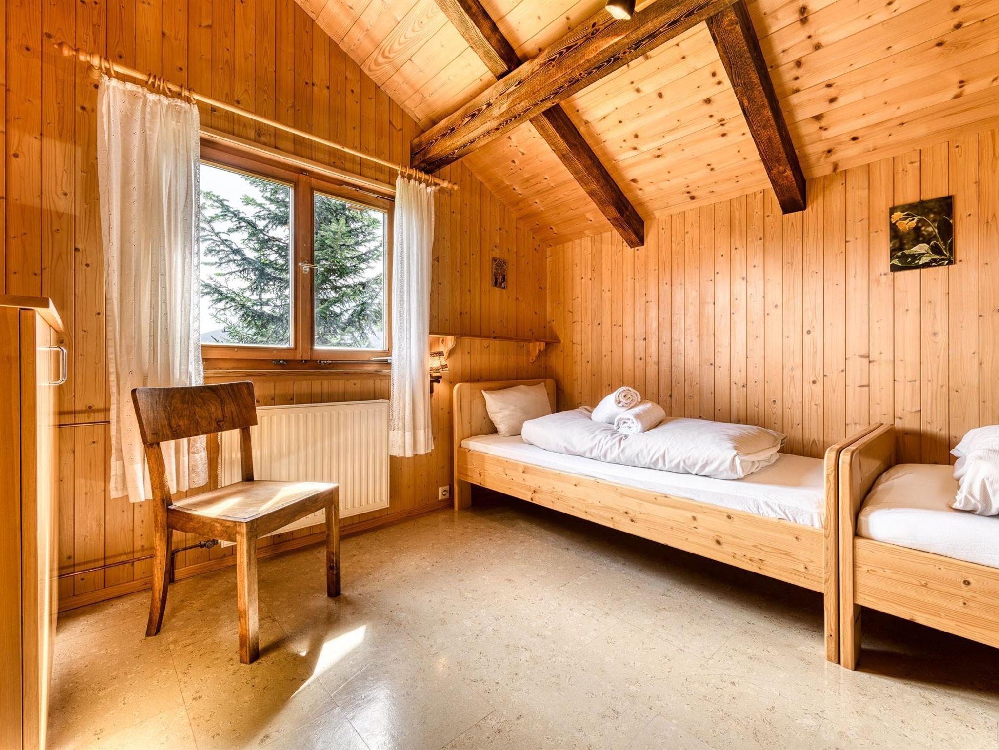 Es zeichnet sich durch eine einmalige, ruhige und sonnige Lage aus und bietet eine wunderbare Aussicht auf die Bergwelt. Die Hütte verfügt über 75m2 auf 2 Stockwerken verteilt und bietet Platz für maximal 10 Personen, aufgeteilt auf 5 Schlafzimmer mit Einzelbetten und ein Stockbett befindet sich in einem der Wohnzimmer, welches als Durchgangszimmer dient.