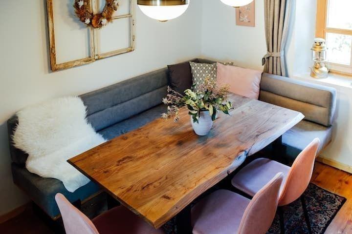 Im Jahr 2020 wurde der Salzherrenhof komplett renoviert. Es war uns besonders wichtig den einstigen Charme des ca. 350 Jahre alten Gebäudes zu erhalten und mit modernen Standards und Annehmlichkeiten für Sie zu verbinden. So entstand eine Melange aus modernen Samtsofas, alten Bauernschränken, Omas Emaille Küchenherd und modernen Walk-In Duschen. Bei all unseren Umsetzungen stand für uns das Thema NACHHALTIGKEIT im Vordergrund unseres Tuns.