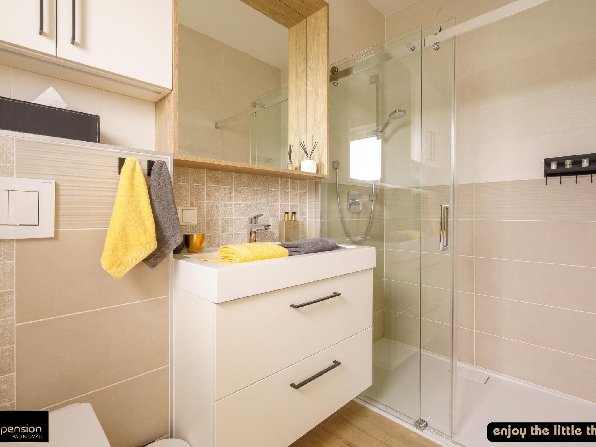 • Komfort Badezimmer mit flacher Duschtasse 140x90, Waschbecken und WC sowie Dusch- und Handtüchern