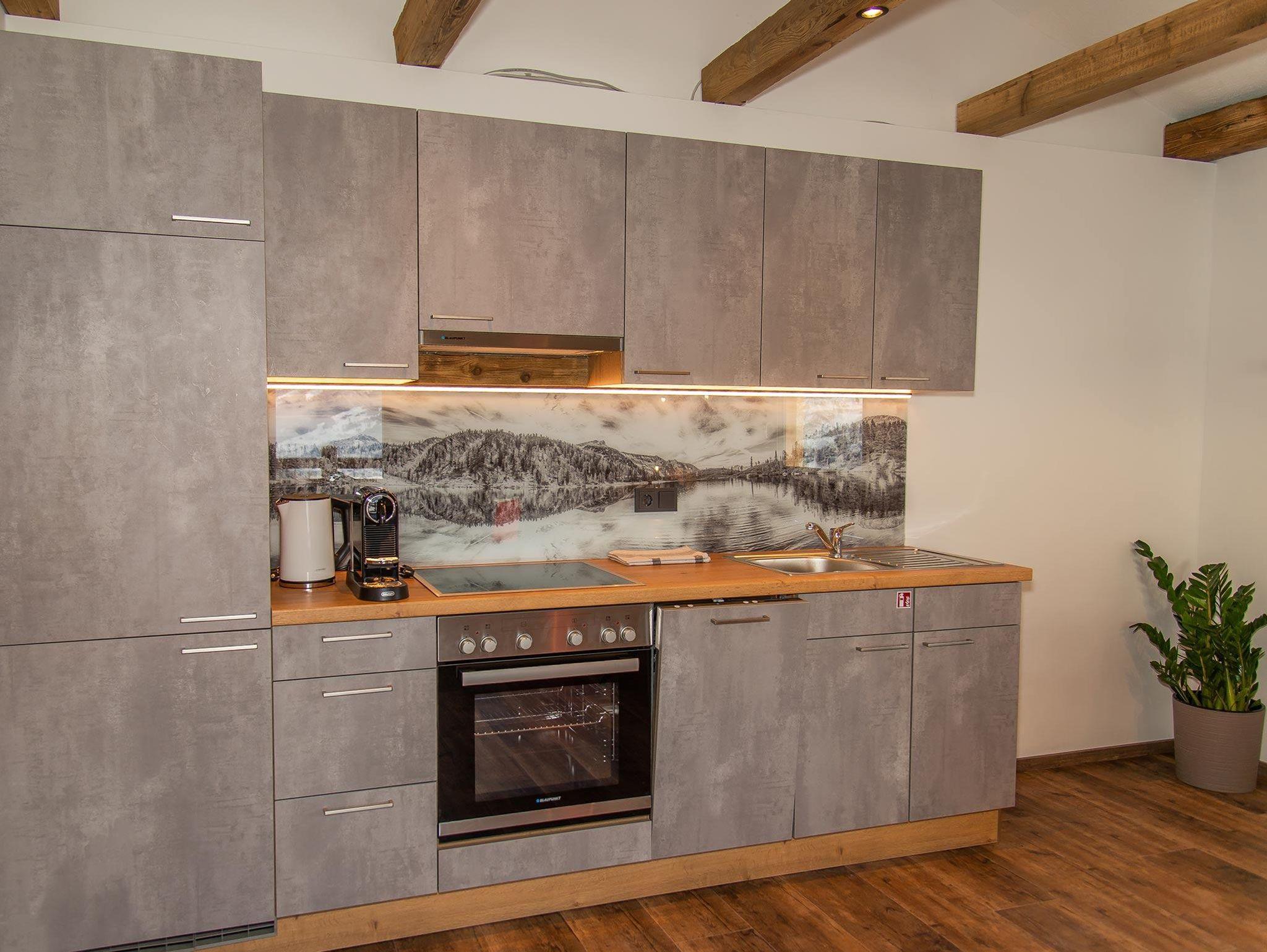 • großer heller Wohnraum mit voll ausgestatteter Küche und Essbereich