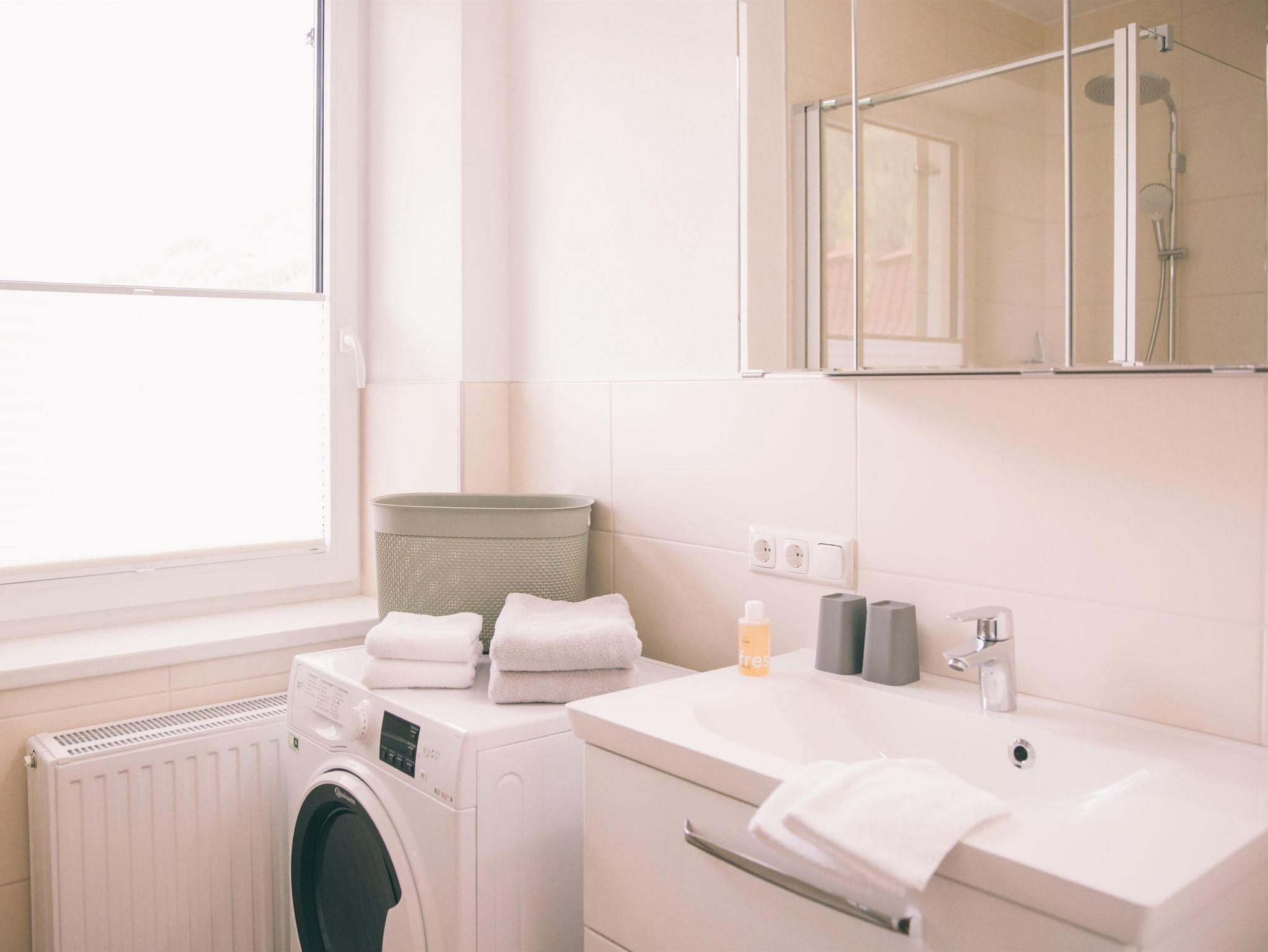 Unser 35qm Apartment (ab 112 €/Nacht und Apartment) ist hell und freundlich gestaltet. Es ist für maximal 3 Personen geeignet (Zustellbett). Es besitzt ein geräumiges Duschbad mit einer großen Dusche, WC und Waschtrockner. Die Gäste haben eine eigene Küche inkl. Backofen, Kühl- und Gefrierschrank, Ceran-Kochfeld und Kapsel-Kaffeemaschine.