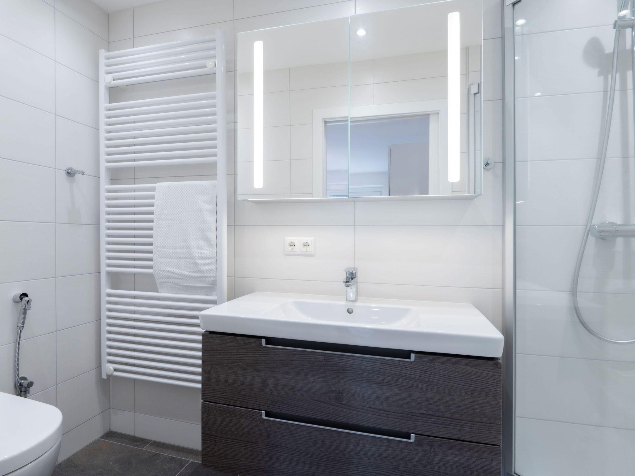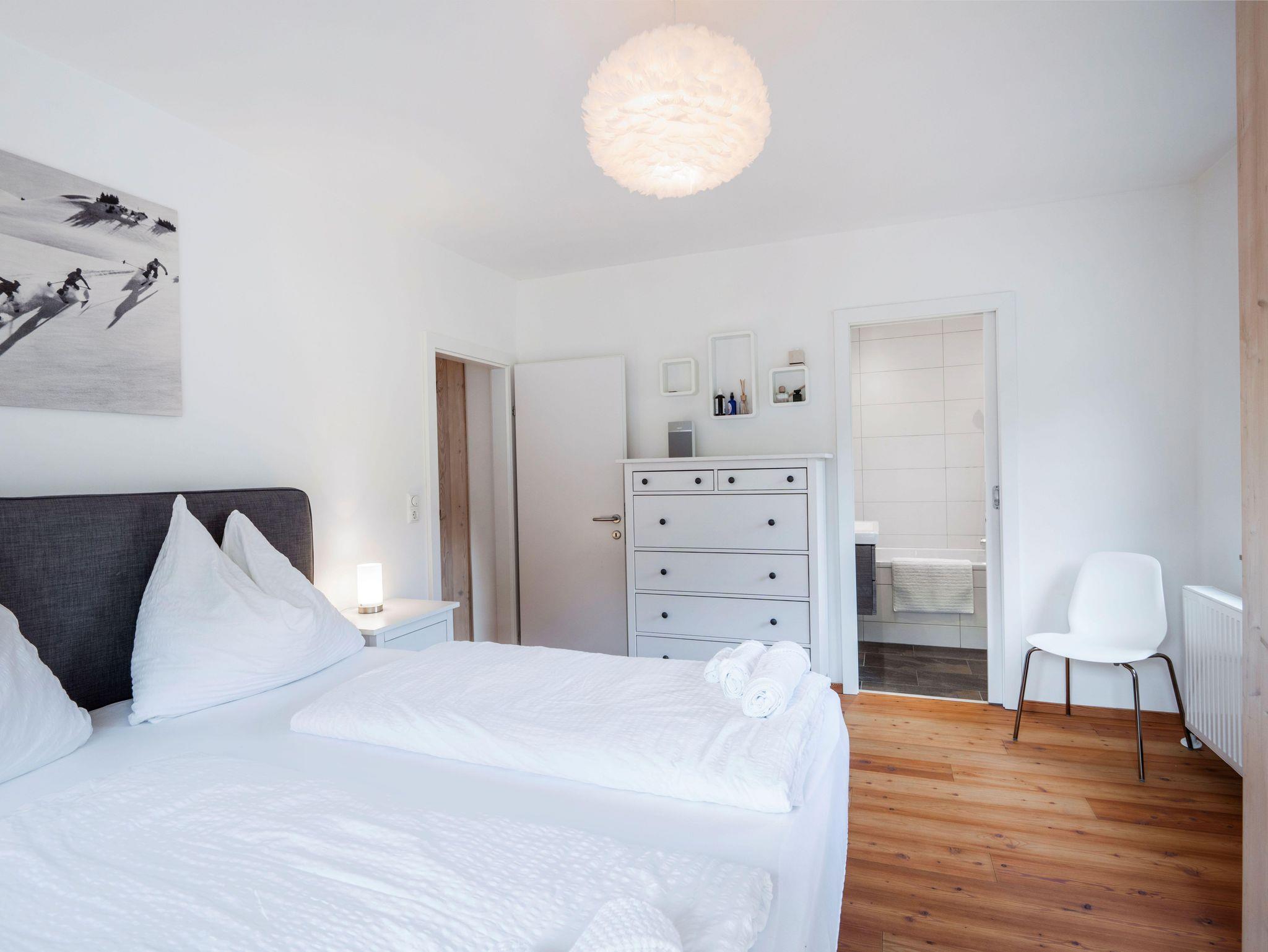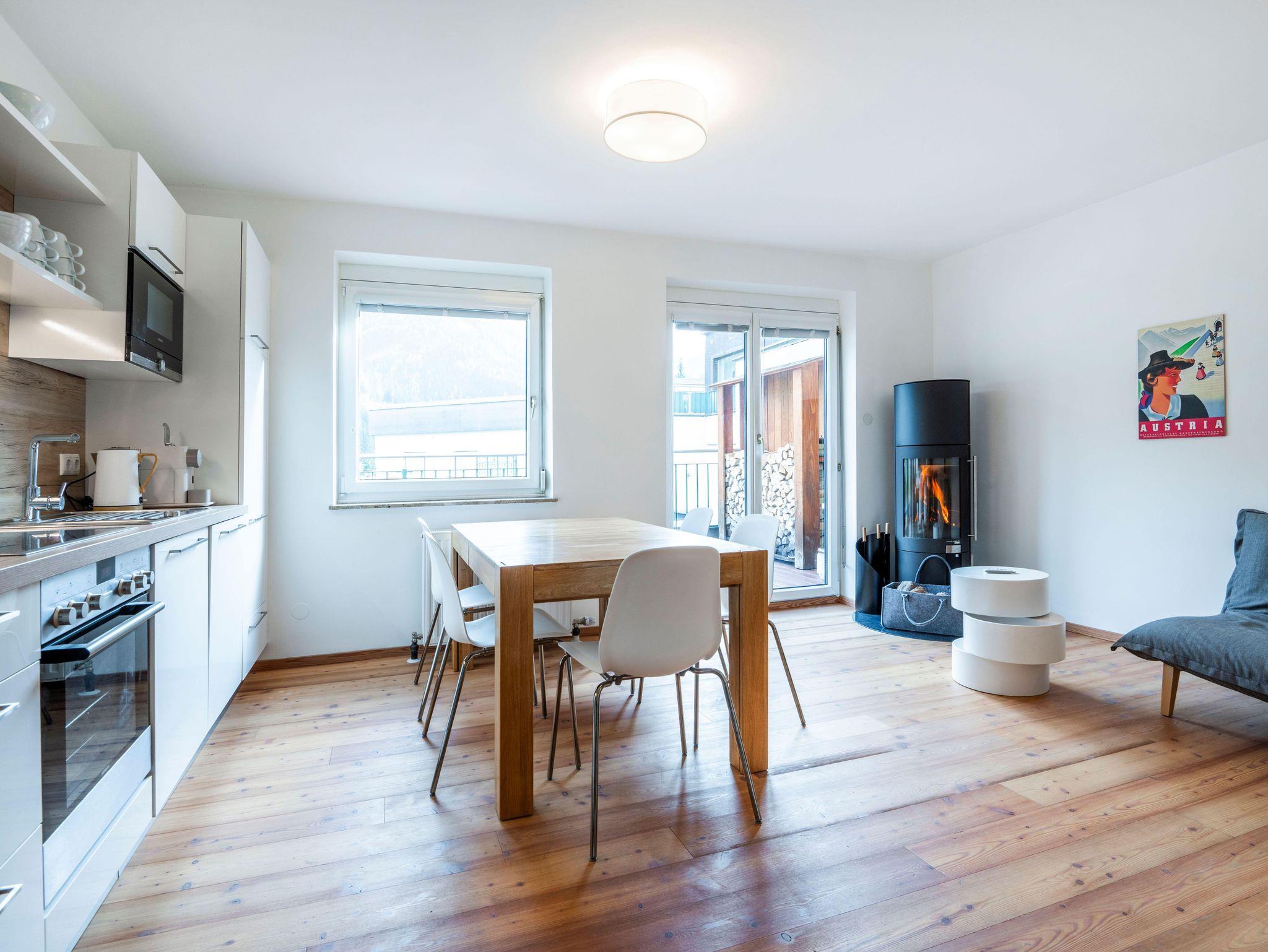Das Apartment verfügt über 2 Schlafzimmer, 2 Badezimmer, ein Wohnzimmer mit offener Küche, Essbereich und einem Kaminofen.