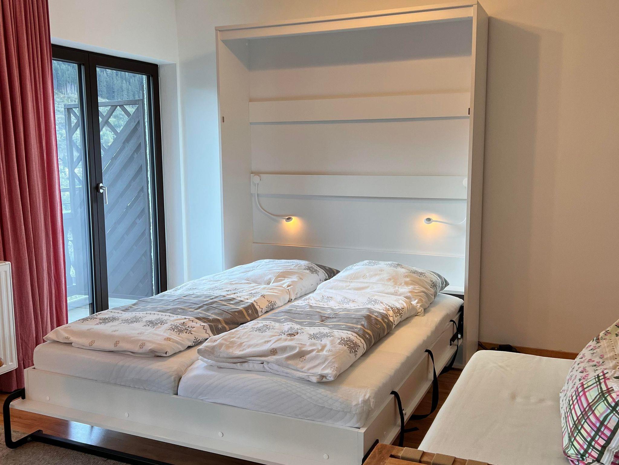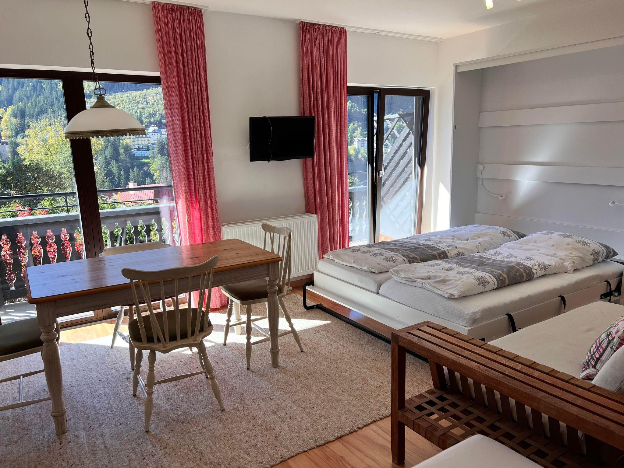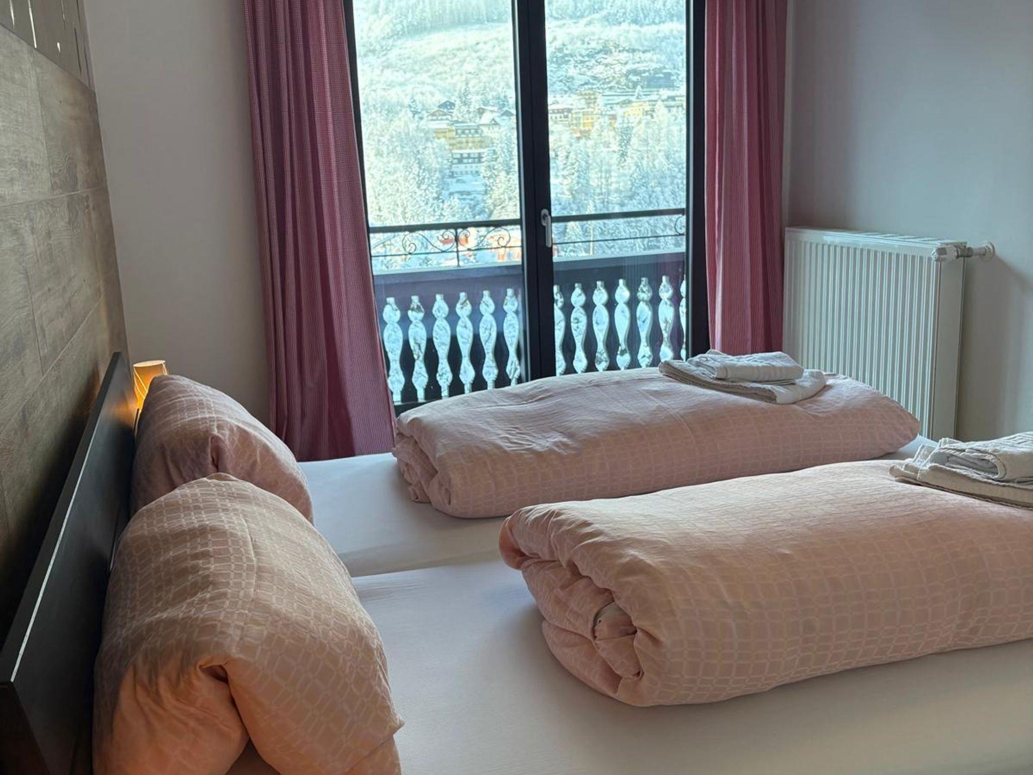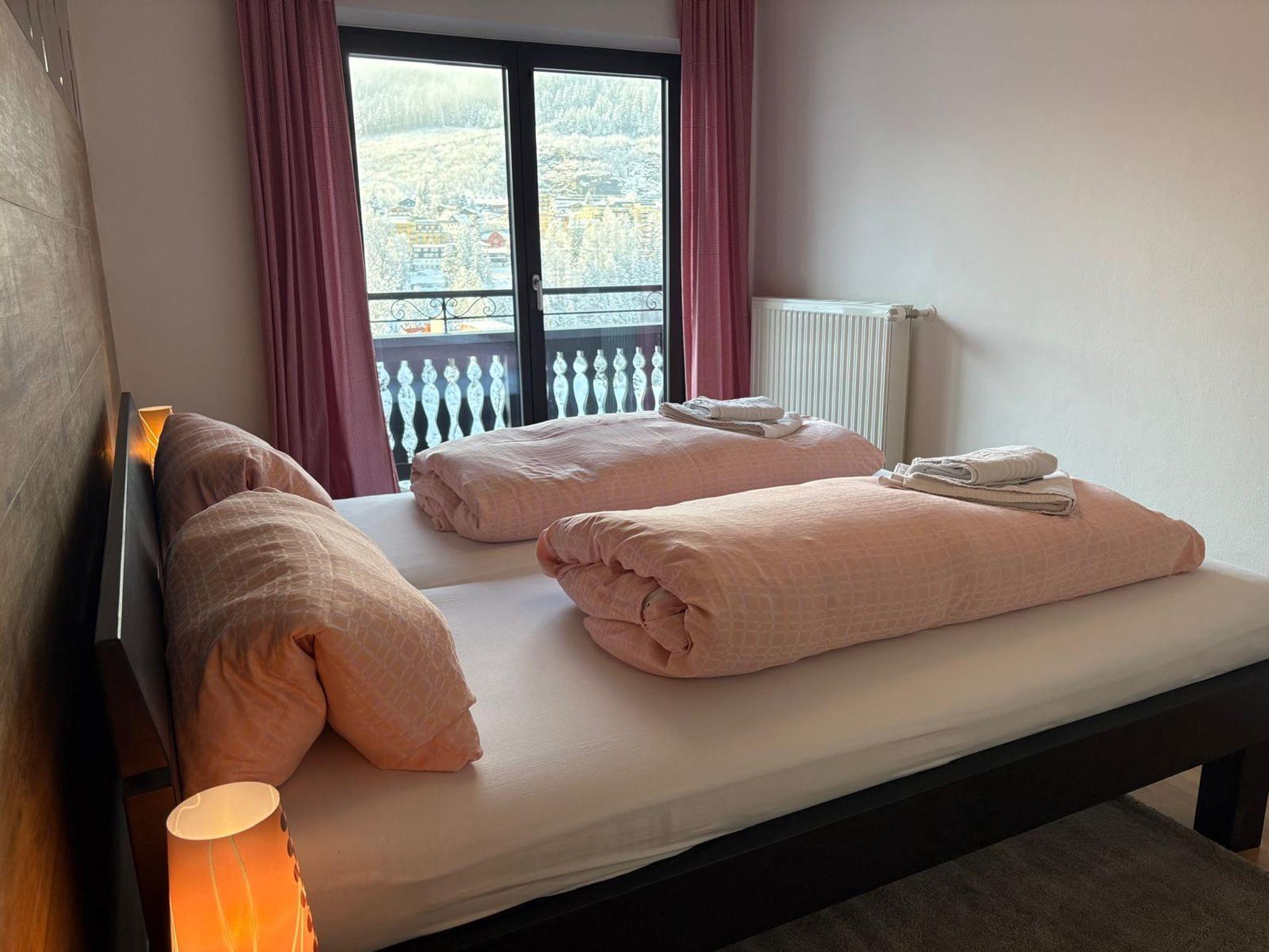 Das Appartement verfügt ausschließlich über bodentiefen Fenster die einen herrlichen Blick auf die Berge, das Tal und die Stadt freigeben. Vom Bett aus seht ihr auf die herrlichen Pisten des Stubnerkogles und könnt am Abend die Pistenraupen verfolgen. Das gesamte Appartement umspannt ein großer überdachter Süd-Westbalkon. Hier stehen selbstverständlich Balkonmöbel für euch bereit. Das Bad ist innenliegend. Das Appartement befindet sich im 1. OG.