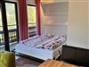 Um das Wohn- und Schlafzimmer verläuft der große überdachte Süd-West Balkon. Durch die ruhige Lage des Hauses kann man hier eine entspannte Zeit genießen und herrliche Bergluft schnubbern. Der Balkon ist mit Balkonmöbel ausgestattet. Das Appartement befindet sich im 1. OG.