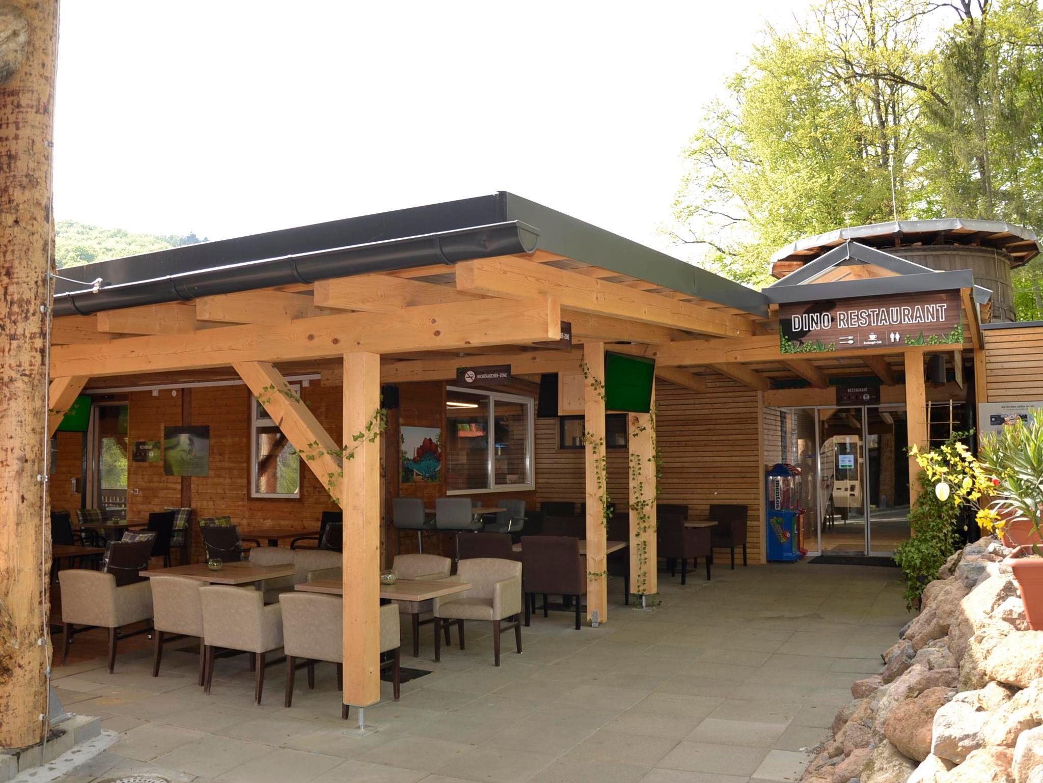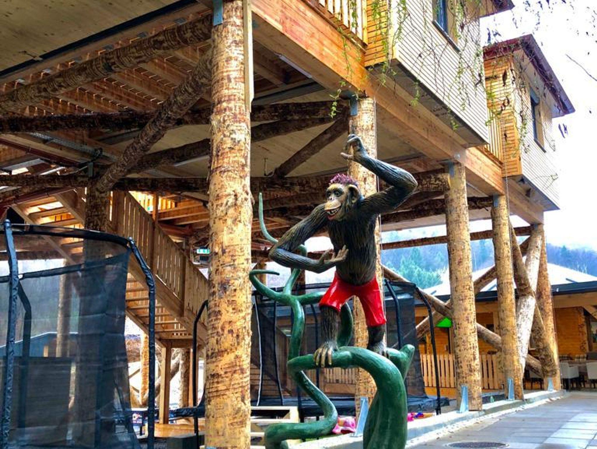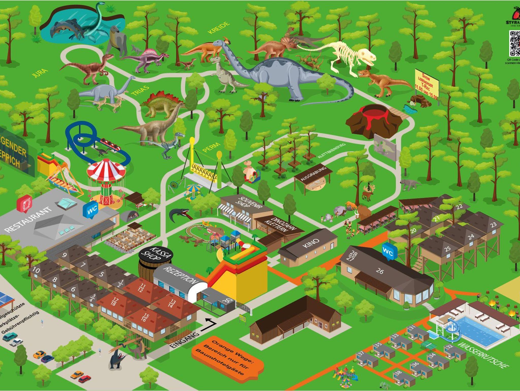 Das Baumhaus Afrika 2.4 befindet sich direkt neben dem Dinorestaurant und hat neben 2 Stiegenaufgängen auch einen Lift. Dieses Zimmer ist mit einem Doppelbett, einem Stockbett sowie einem Badezimmer mit WC, Dusche, Waschbecken als auch einem Kühlschrank sowie TV und einer kleinen Sitzecke und einer Terrasse ausgestattet.