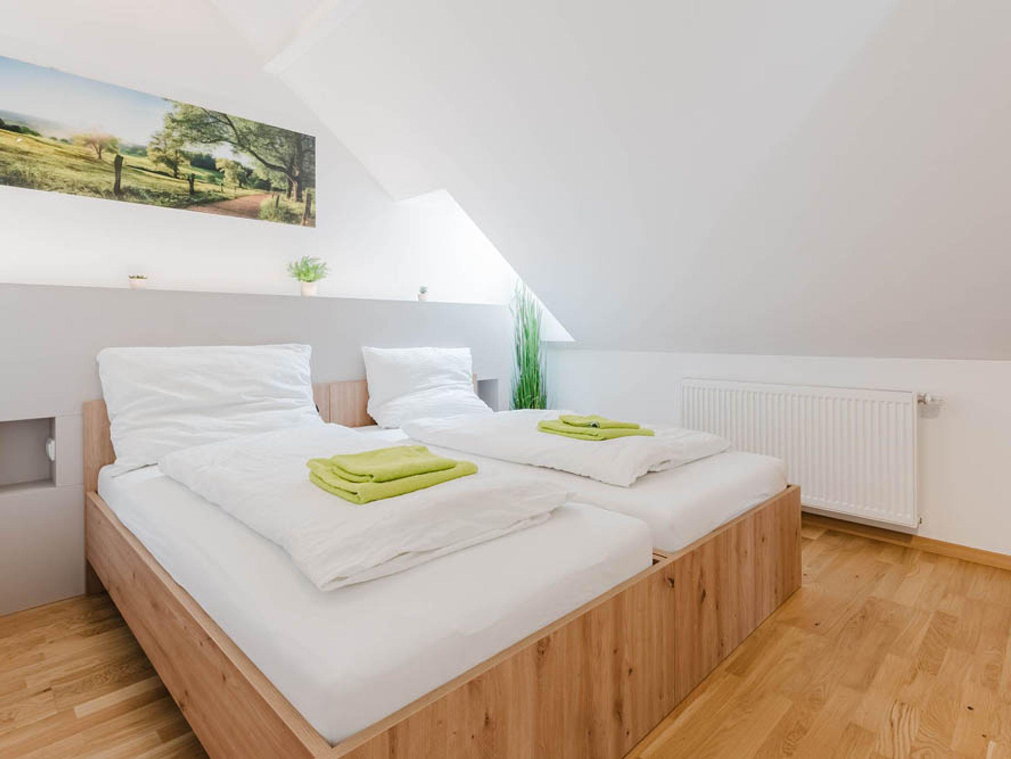 Das Apartment im Dachgeschoß verfügt über ein gemütliches Wohnzimmer mit vollausgestatteter, moderner Einbauküche und großzügiger Essgruppe, ein gefälliges Badezimmer mit Walk-In Dusche, Waschbecken und WC. Es gibt 2 geräumige Schlafzimmer. Die Bettenverteilung in den Schlafräumen ist individuell gestaltbar und wird für Ihre Bedürfnisse hergerichtet. Somit steht einem erholsamen Familienurlaub mit Kindern oder Freunden nichts mehr im Wege!