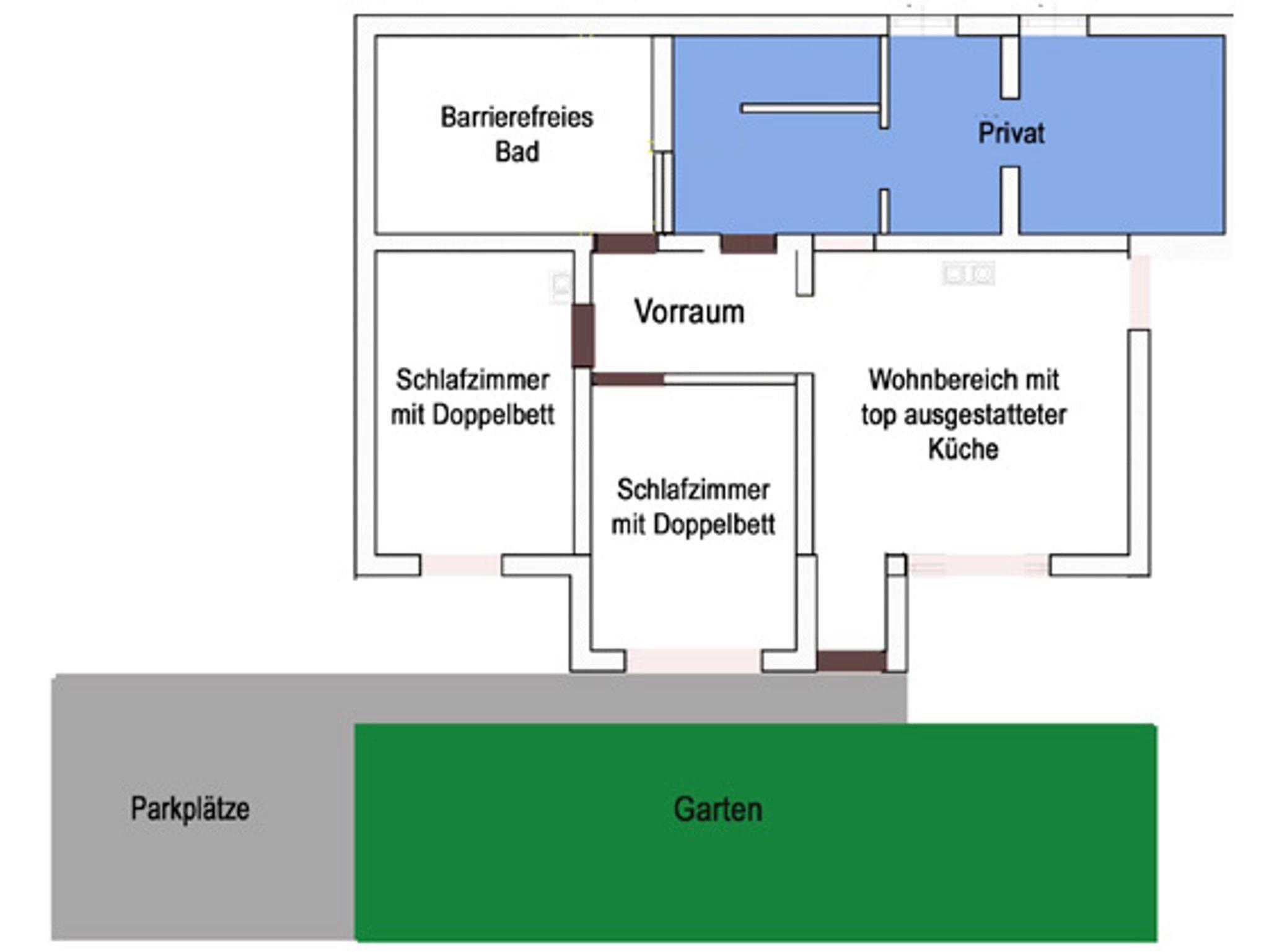 Die ca. 65 m² große Ferienwohnung liegt im unteren Geschoss eines Wohnhauses. Sie besteht aus 2 getrennten Schlafzimmern, einem Bad mit Dusche und WC, einem kleinen Vorraum und einem Wohnraum mit voll ausgestatteter Küche. Die Ferienwohnung ist komplett barrierefrei, hat einen eigenen Garten und zwei Parkplätze.