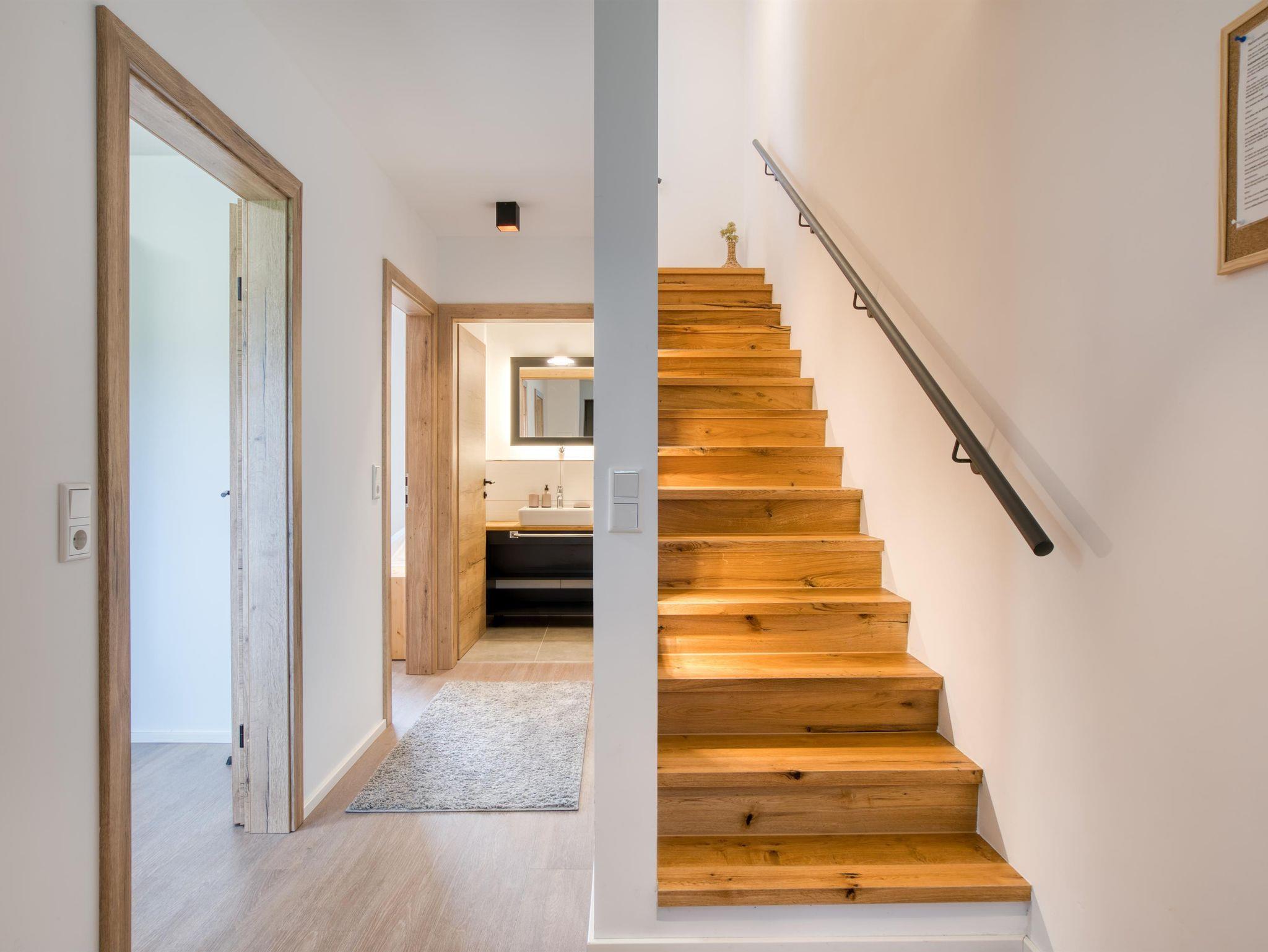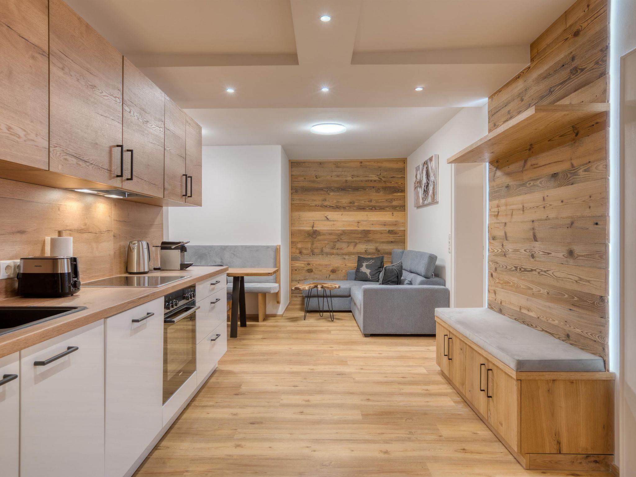 Das Apartment 4 ist Dein zu Hause auf Zeit im malerischen Bad Häring. Großzügige 60m² warten darauf von dir bewohnt zu werden. Das Apartment 4 überstreckt sich über zwei Etagen. Im Erdgeschoß befinden sich insgesamt zwei Schlafzimmer. Eines der Schlafzimmer verfügt über ein Doppelbett während im anderen Schlafzimmer ein Stockbett sowie ein Einzelbett vorzufinden sind. Das Doppelzimmer ist dabei sehr gemütlich und besonders, da Altholzelemente liebevoll an der Wand positioniert wurden. Neben den beiden Schlafzimmern befindet sich im Erdgeschoß zudem eine separate Toilette. Der erste Stock kann über eine schöne, beleuchtete Treppe erreicht werden. Oben, im ersten Stock angekommen, wartet das Highlight der Wohnung auf Dich: es ist der stilvolle Wohn- und Essbereich. Die Küchenzeile lädt zu Kochabenden aller Art ein und die zuvor zubereiteten Speisen können dann auf der gemütlichen Eckbank verzehrt werden. Weiters verfügt der Wohnraum über eine komfortable Couch auf welcher man entspannen und auf dem großen Smart-TV fernsehen kann. Einfach zurücklehnen und das herrliche Ambiente genießen, eine warme Dusche im angrenzenden Badezimmer nehmen oder auf dem ebenfalls angrenzenden Balkon die letzten Sonnenstrahlen des Tages einfangen. Das alles ist möglich in Deiner Natur Residenz Bad Häring. Das - und noch vieles mehr - also nichts wie los und ab in die Berge Tirols!